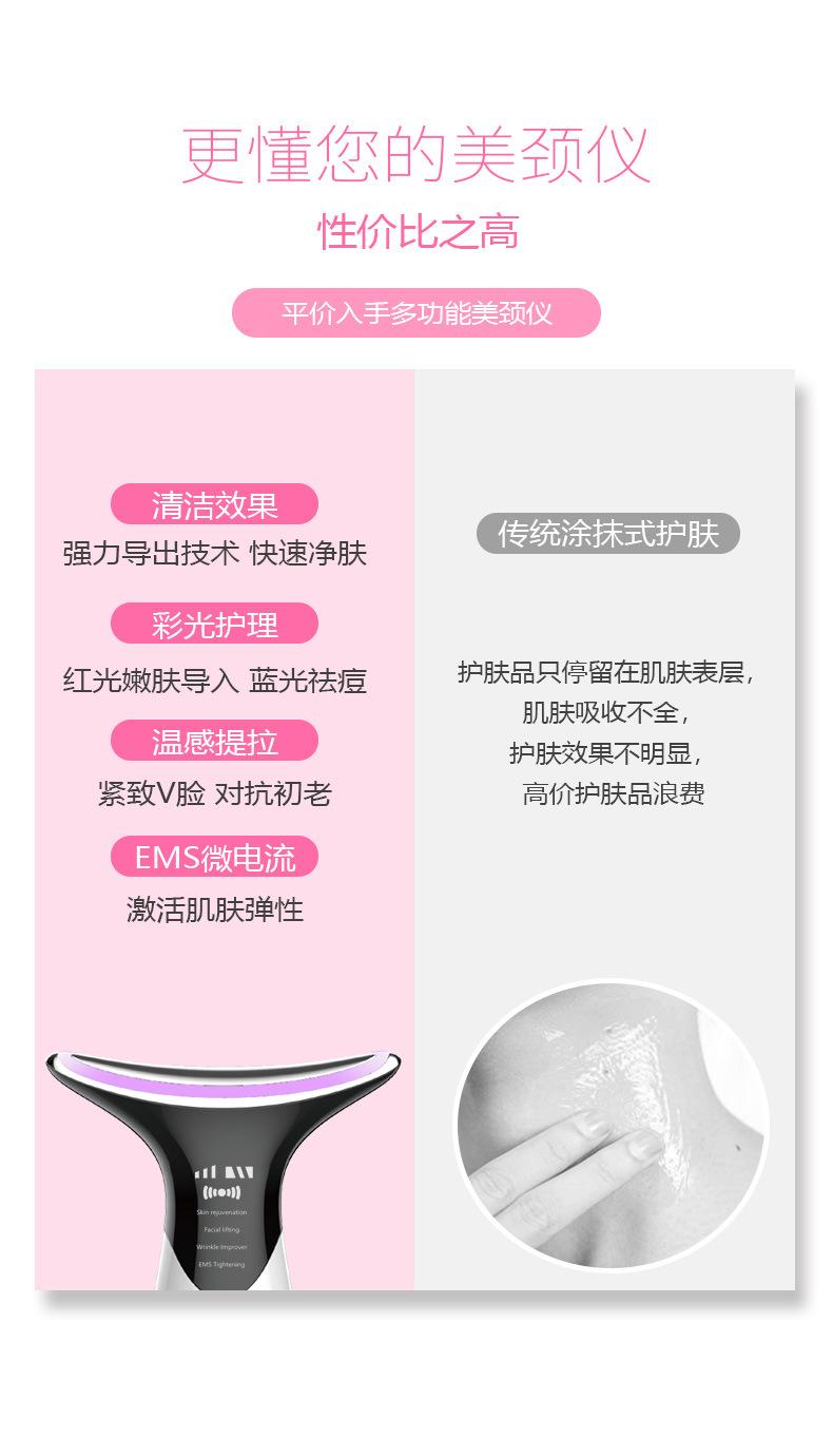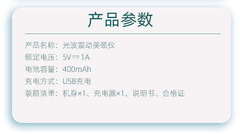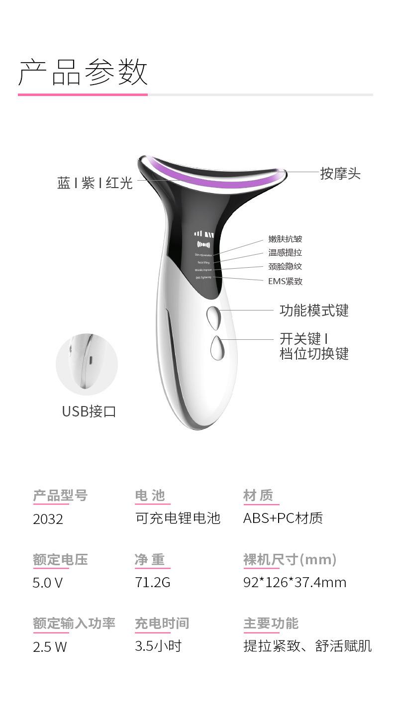 Nombre del producto: Instrumento de belleza para el cuello Modelo de Producto: MJY003 Versión Básica Tamaño del producto: 140.2*92.9*48.8mm Tamaño del paquete: 144.5*95.2*49mm Color: Blanco Rosa Batería: 400mah Peso neto: 90.7g/Peso bruto: 122.1g Material principal: ABS, PC Potencia nominal: 1.5w Voltaje de trabajo: 5v Corriente de entrada nominal: 1A-2A Cantidad de embalaje: 75 piezas |