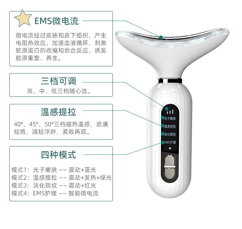 Nombre del producto: Instrumento de belleza para el cuello Modelo de Producto: MJY-2032 Material: ABS Modo: 4 tipos Marcha: 3.ª marcha Cantidad de embalaje: 100 piezas Peso bruto por caja: ≈23kg Tamaño del empaque: 55.5*41.5*49.5mm |