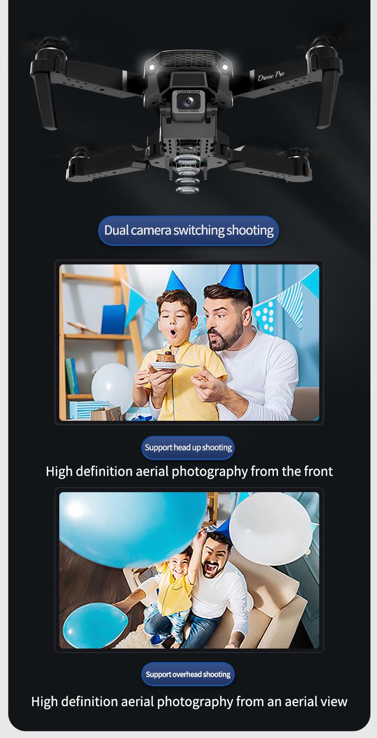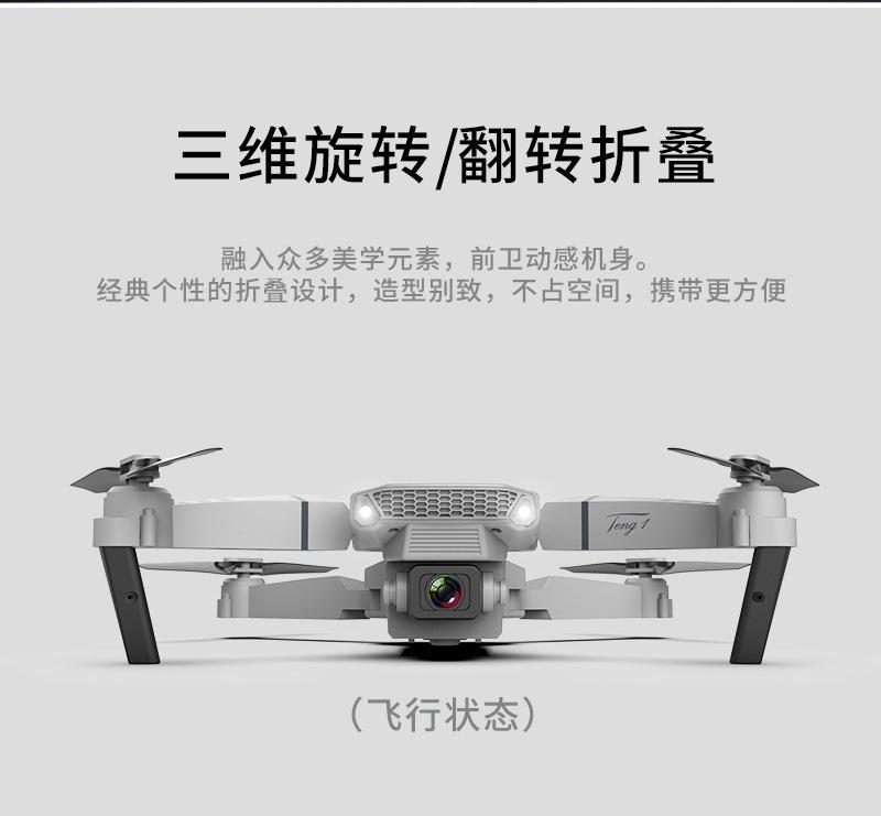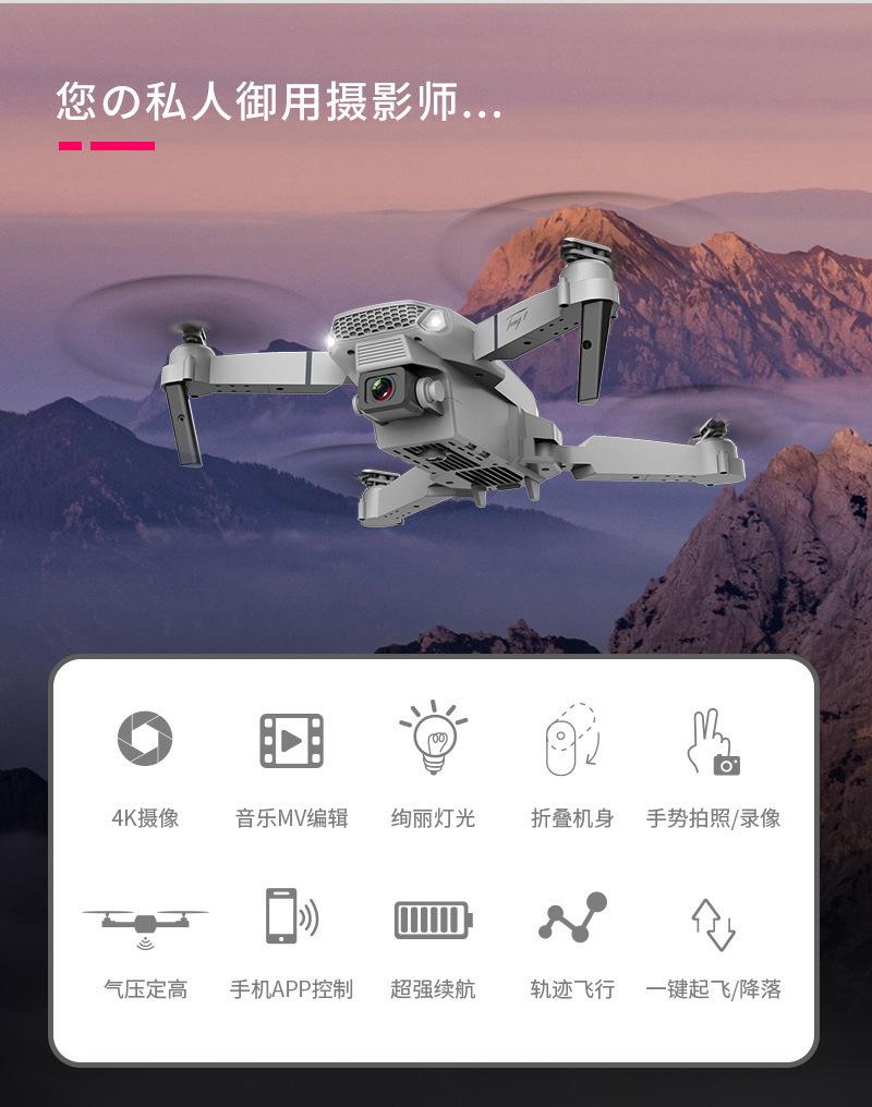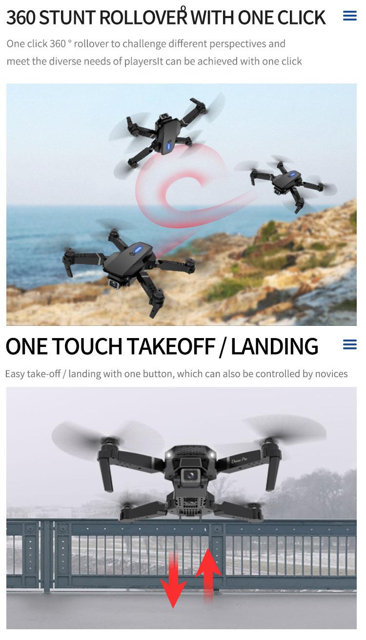 Funciones básicas: función de altitud fija, aeronave plegable, giroscopio de seis canales, despegue con una tecla, aterrizaje con una tecla, retorno con una tecla, reinicio con una tecla, función de ajuste fino, avance y retroceso, vuelo lateral izquierdo y derecho, giro izquierdo y derecho, modo sin cabeza, rollo de 360° [con lente de cámara, funciones adicionales: control por APP, rollo de 360°, foto por gestos, grabación de video, parada de emergencia, vuelo por trayectoria, sensor de gravedad, producción MV, añadir música, función de belleza]