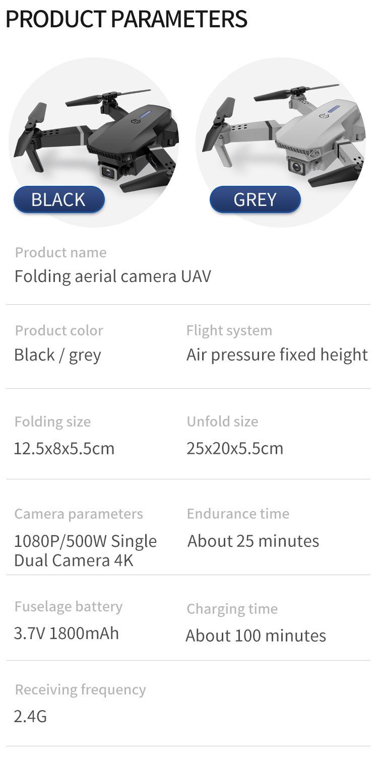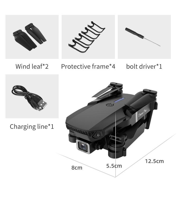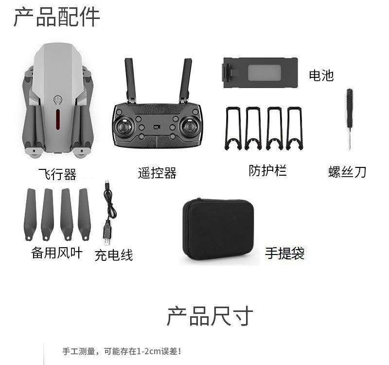 Lista de configuración: Dron * 1 Control remoto * 1 Batería del cuerpo * 1 Cable USB * 1 Cubierta protectora * 4 Destornillador * 1 Hélices de repuesto * 4 Manual del dron * 1 Manual de la aplicación (solo para la versión de fotografía aérea) * 1