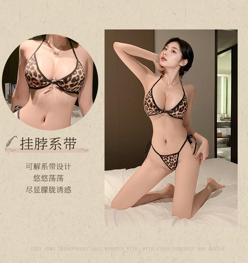 Conjunto de Lencería Sexy para Mujer, Sujetador de Tres Puntos con Estampado de Leopardo Calado + Tanga Productos Sexy para Adultos 8576