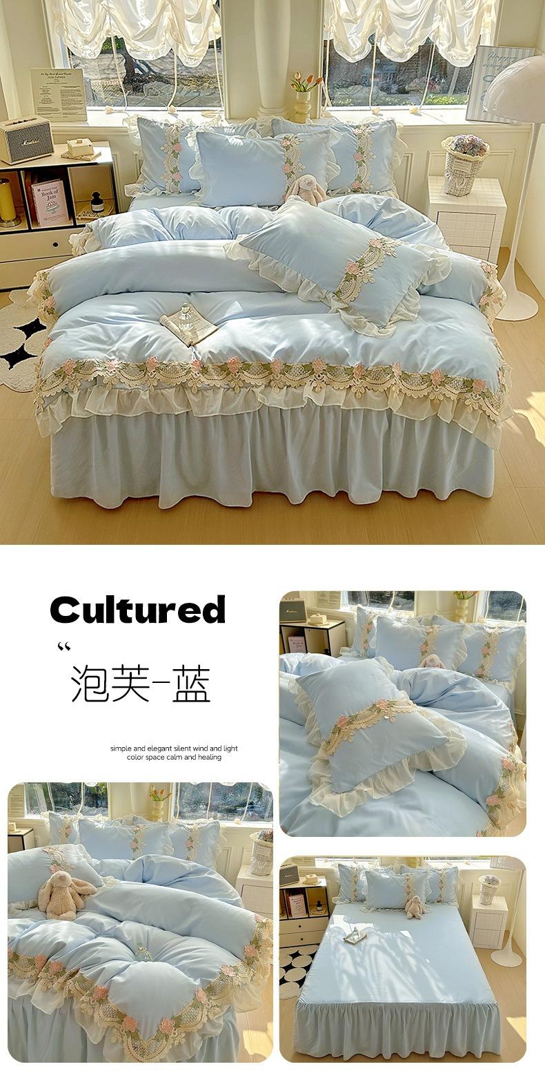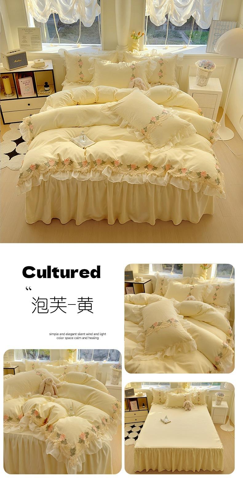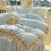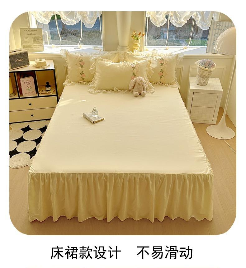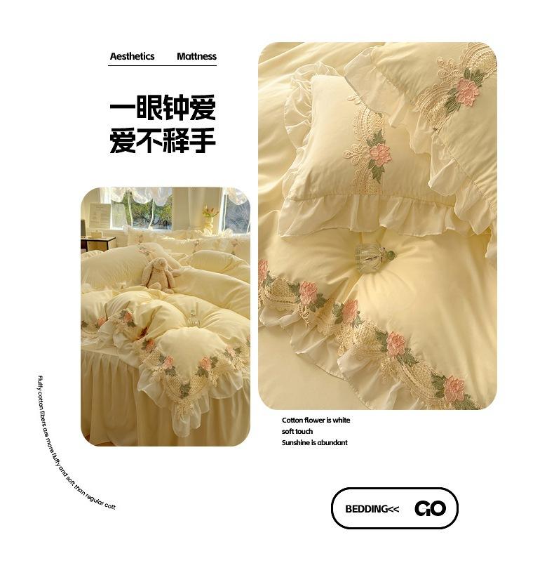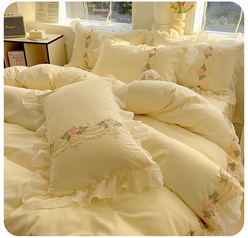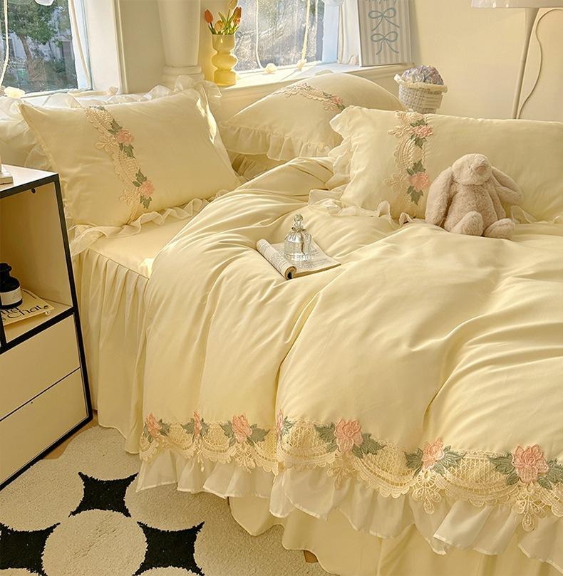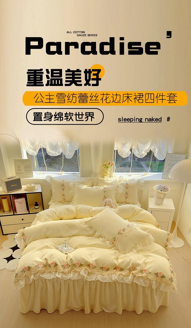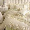 Compra Falda de cama estilo princesa romántica francesa Juego de cuatro piezas Encaje de gasa Hada Crema Color sólido Funda de edredón Sábana al por mayor en Joom.pro