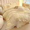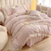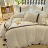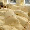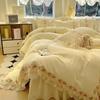 Falda de cama estilo princesa romántica francesa Juego de cuatro piezas Encaje de gasa Hada Crema Color sólido Funda de edredón Sábana