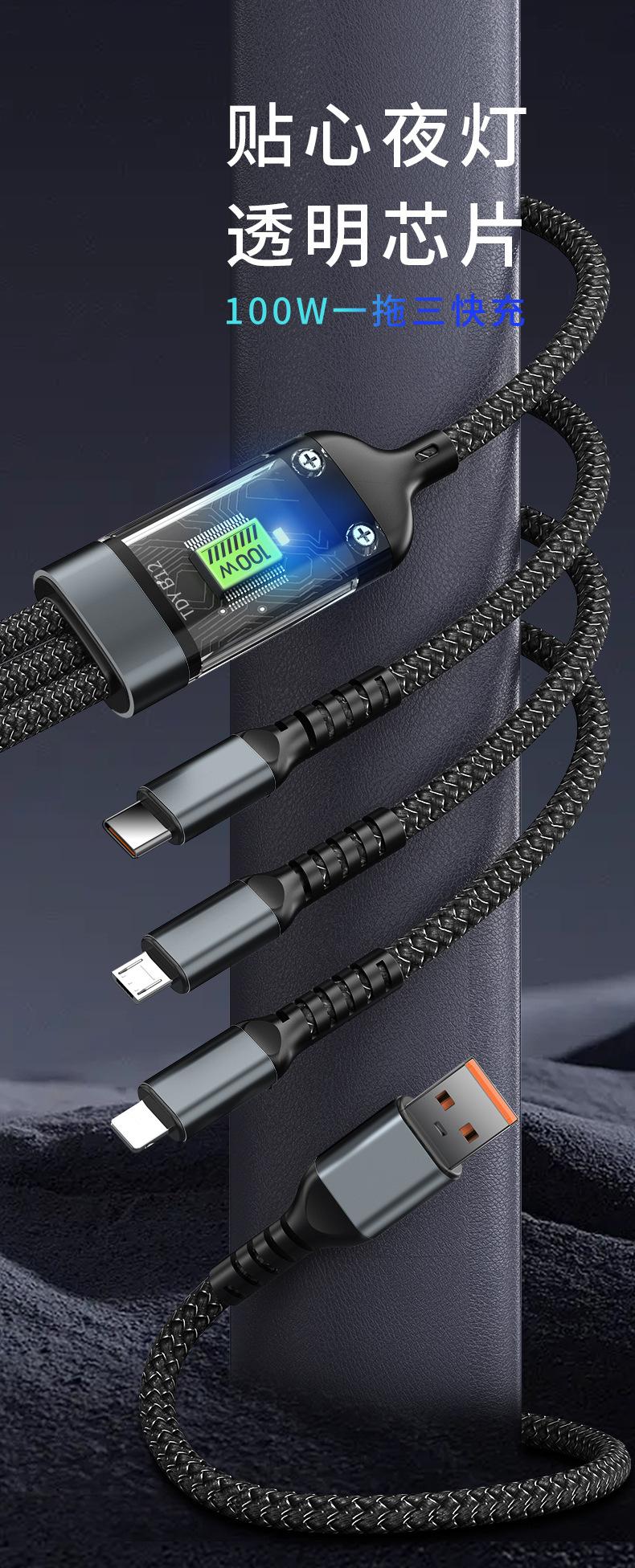 Cable de datos de carga súper rápida 6A para teléfono móvil tres en uno con luz adecuado para cable cargador Tipo-C Apple Android Huawei