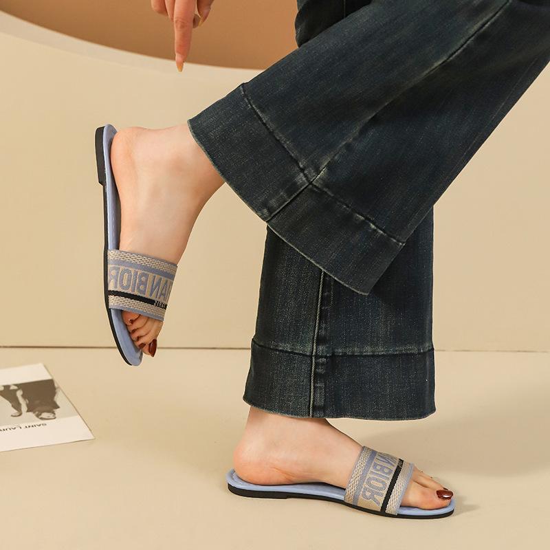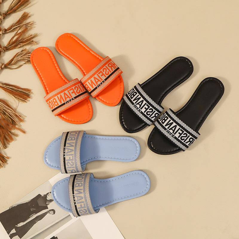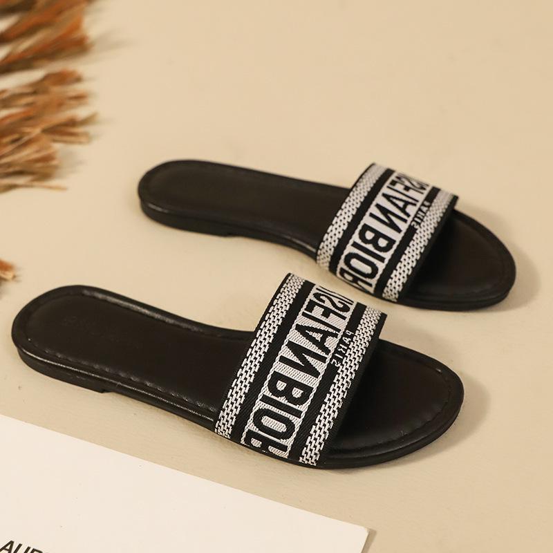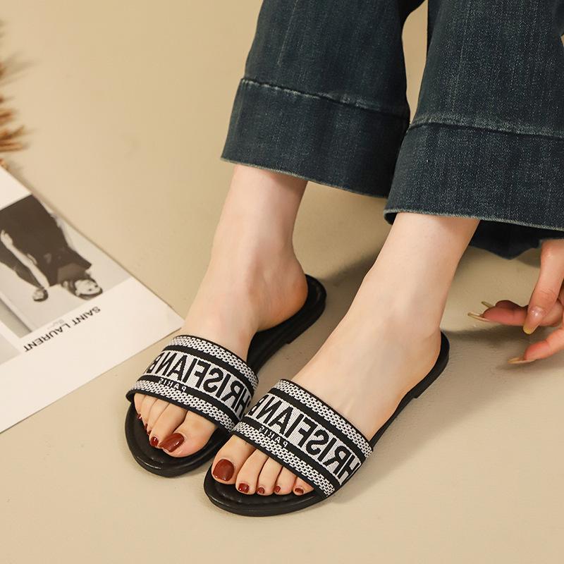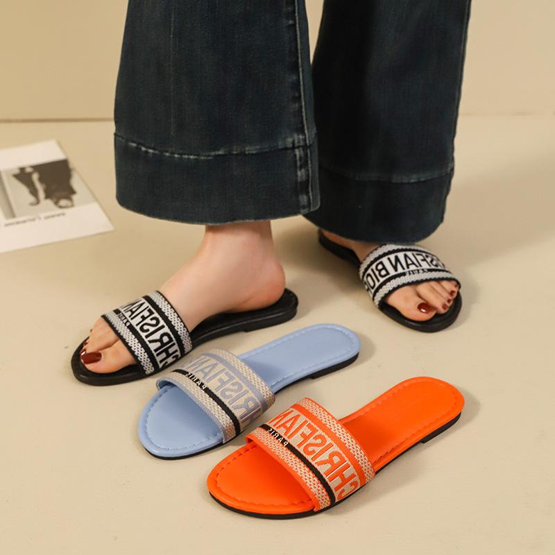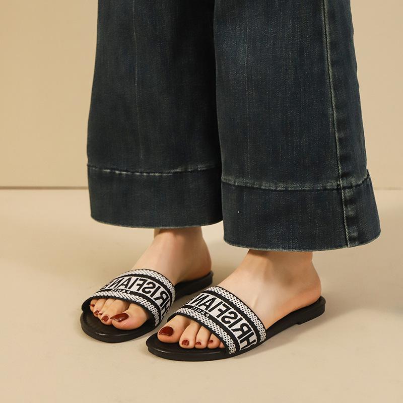 Transfronterizo 2025 Nuevo talla grande Zapatos de mujer Moda talla grande Pantuflas Ropa de exterior Arrastre de una palabra Letra Pantuflas planas casuales