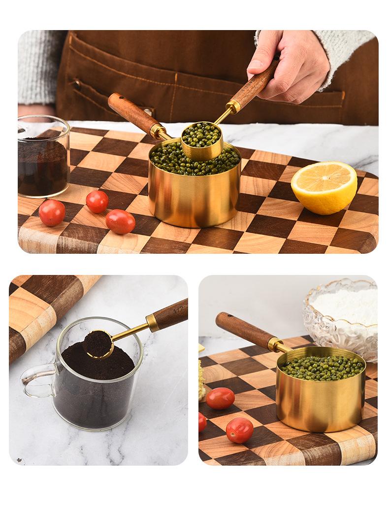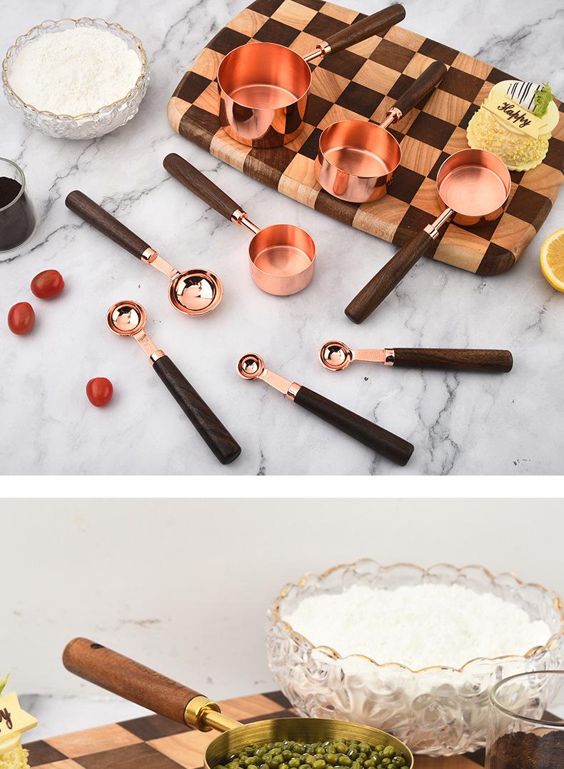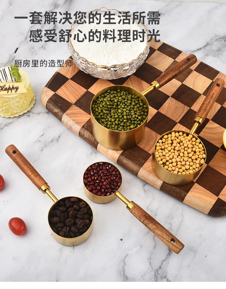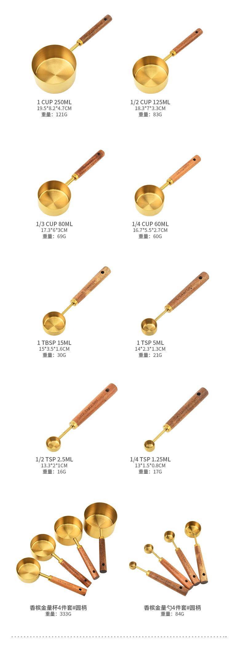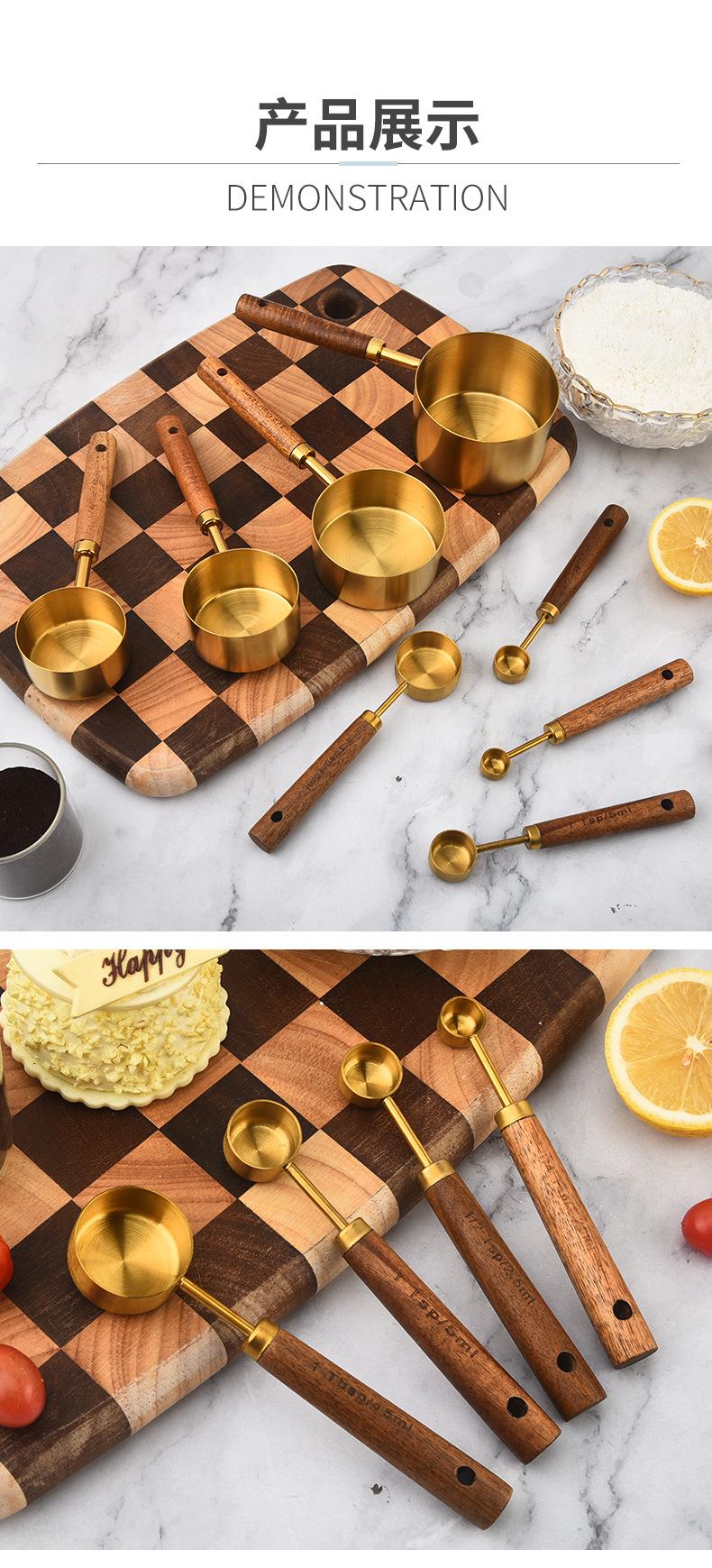 Taza medidora de acero inoxidable chapada en oro, cuchara medidora, herramienta para hornear de cocina, cuchara medidora con mango de madera de acacia, juego de ocho piezas