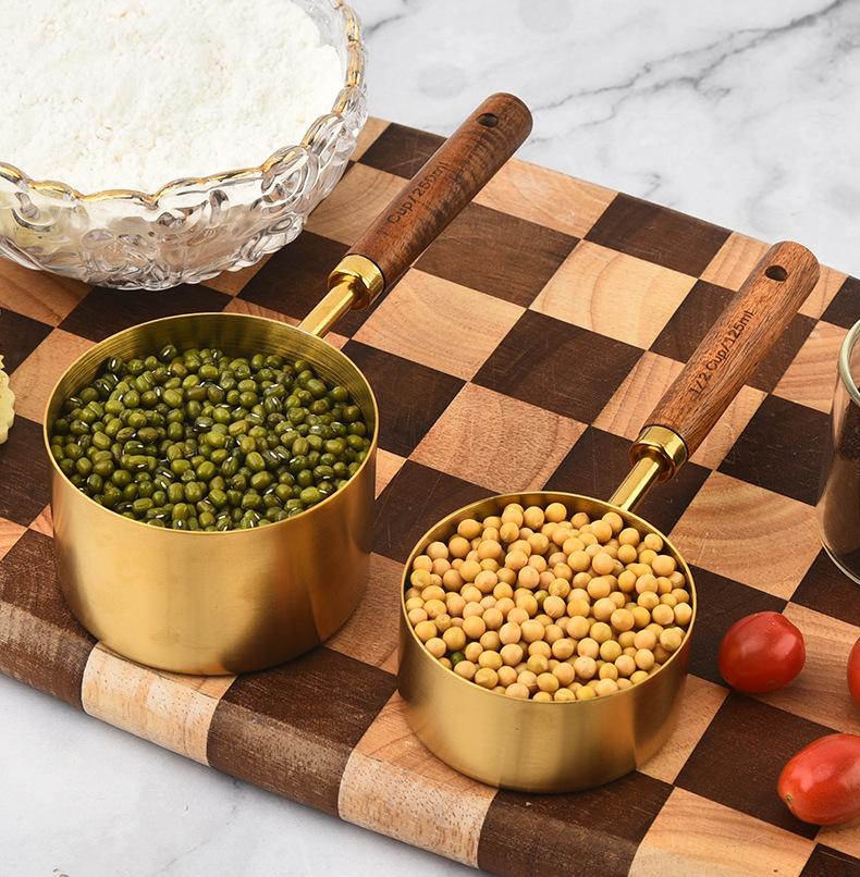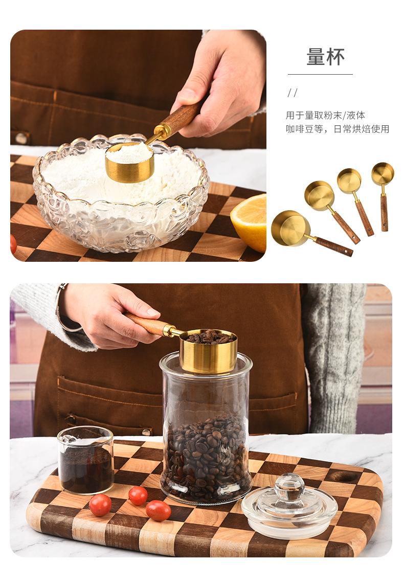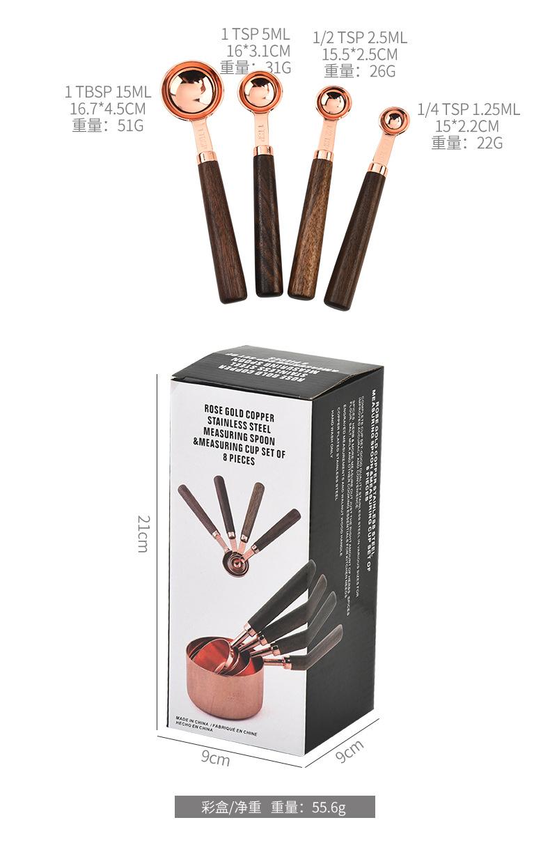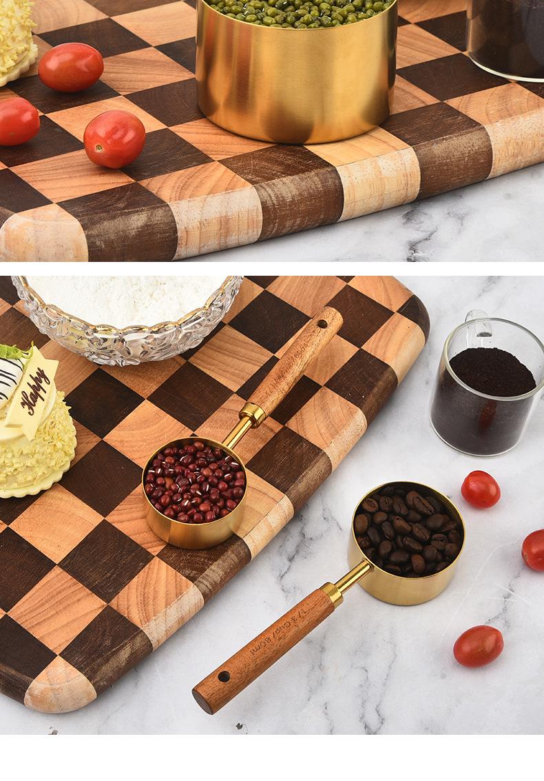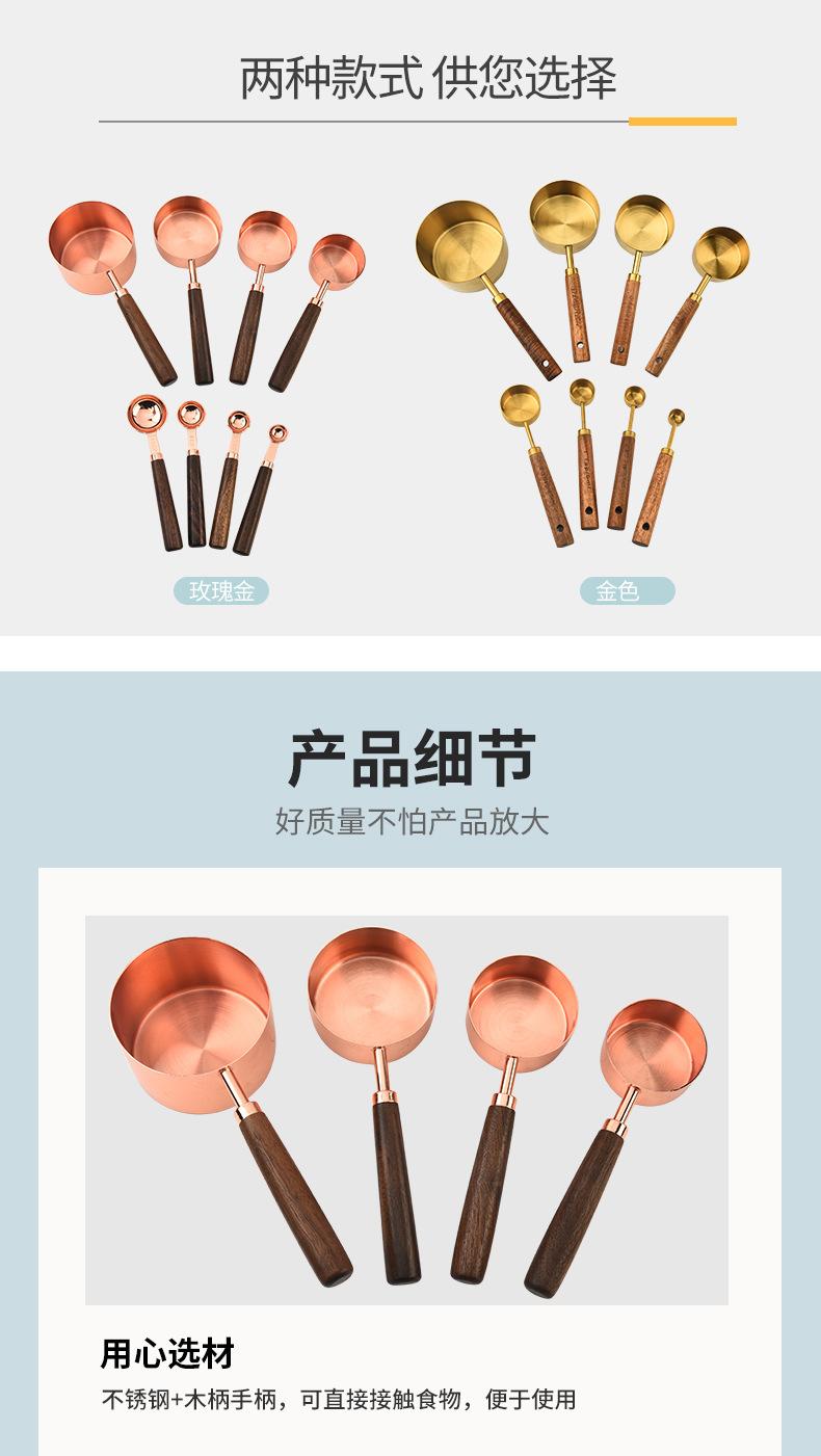 Taza medidora de acero inoxidable chapada en oro, cuchara medidora, herramienta para hornear de cocina, cuchara medidora con mango de madera de acacia, juego de ocho piezas