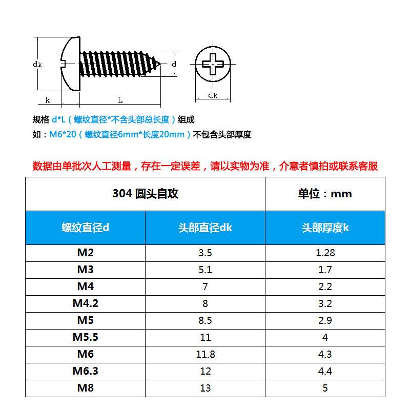 [M4-M8] Tornillos Autorroscantes de Cabeza Redonda Cruzada Pa Acero Inoxidable 304 Tornillos Autorroscantes de Cabeza Pan Tornillos para Madera