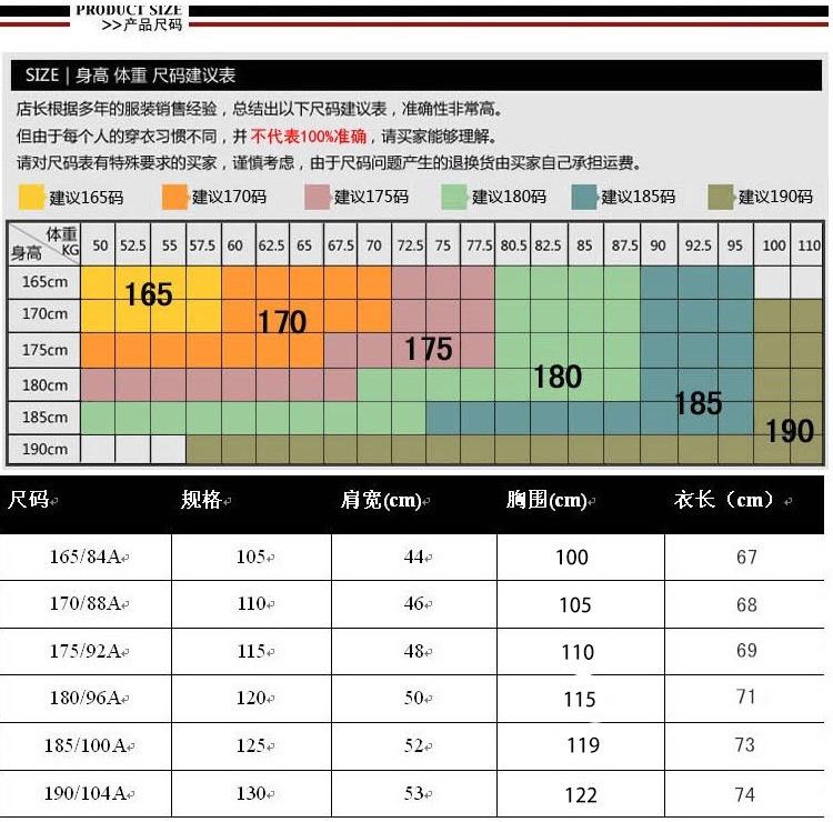 S/165, M/170, L/175, XL/180, XXL/185, XXXL/190