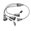 Exposición de enchufes y cables de alimentación de varios países.