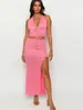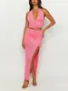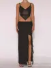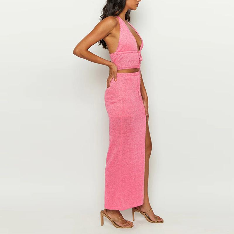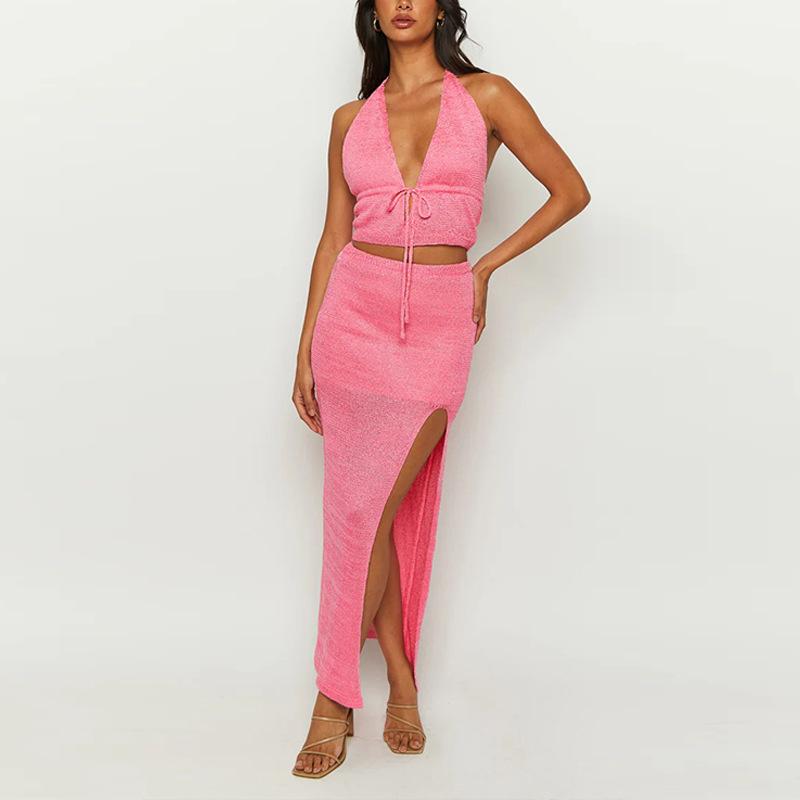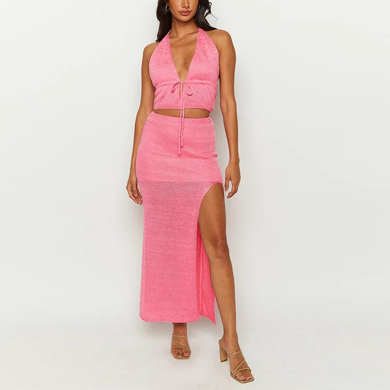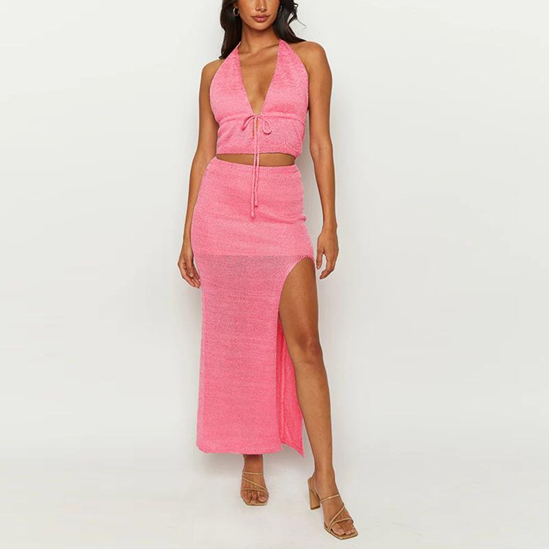 2025 Nuevo Traje de Verano Transfronterizo de Verano Sexy Top de Tirantes con Escote en V Profundo Falda con Abertura Conjunto de Dos Piezas