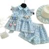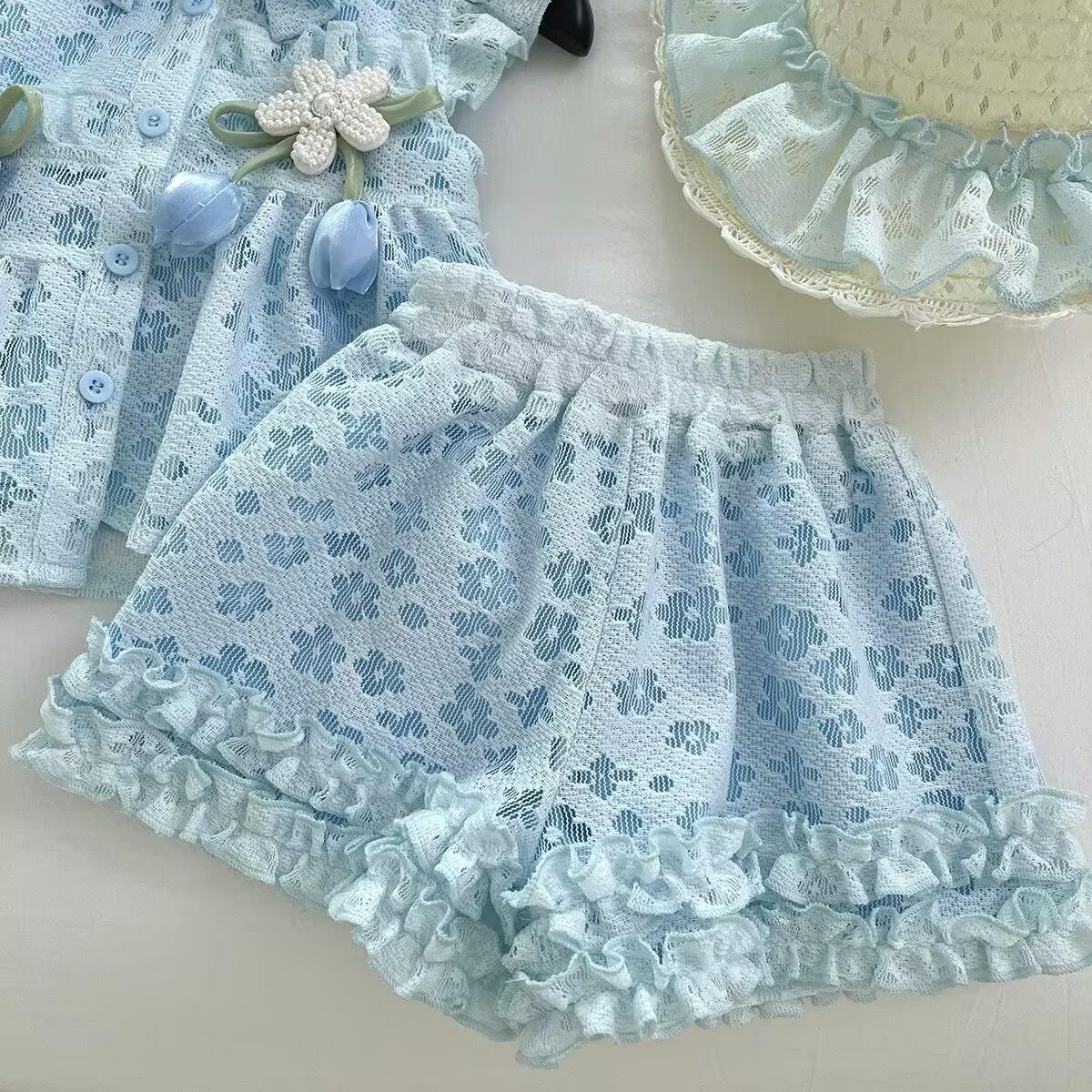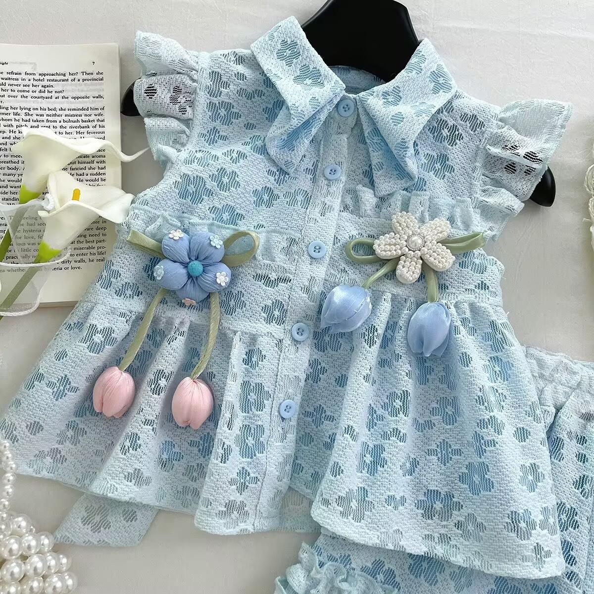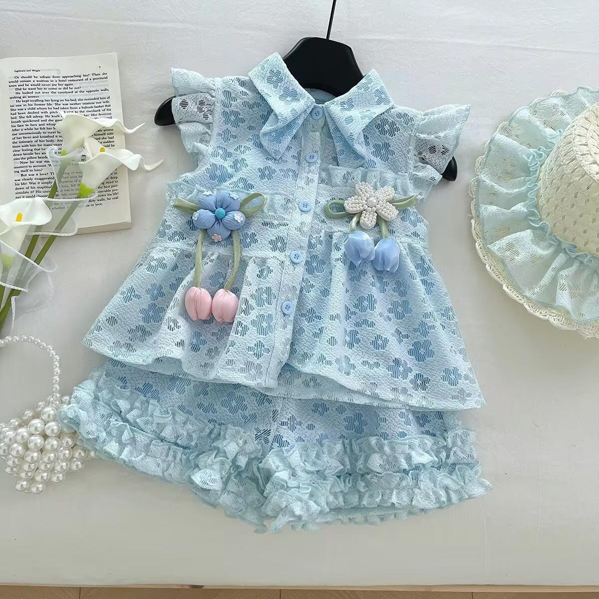 Traje de Verano para Niñas 2025 Nuevo Top Chaleco de Encaje con Flores Shorts de Encaje Bebé Niña Princesa Conjunto de Dos Piezas