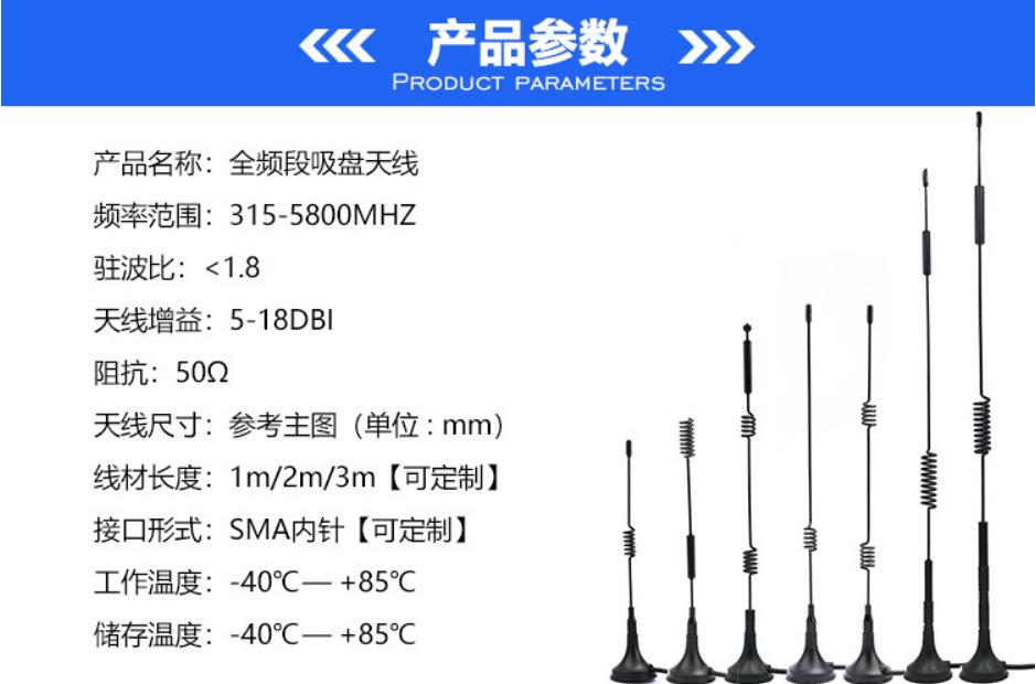 Nombre del Producto: Antena de Ventosa de Banda Completa Parámetros del producto: