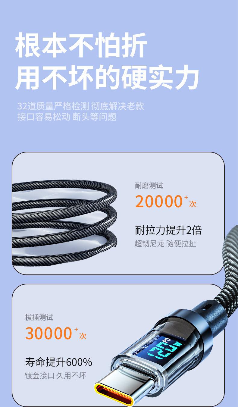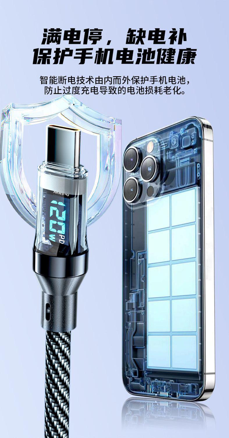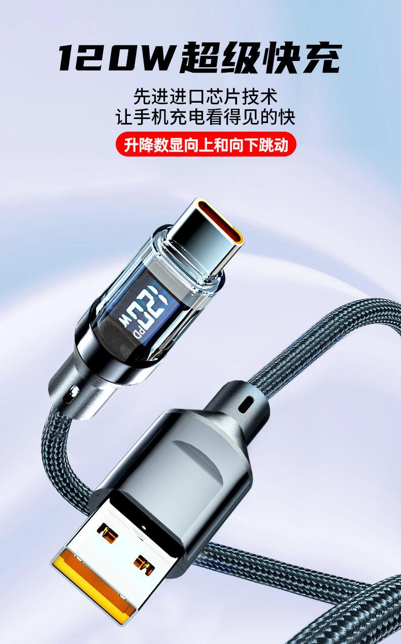 Pantalla digital transfronteriza carga súper rápida de 120 W doble Typec para Apple 15/16 Huawei Glory 6A línea de carga para teléfono móvil