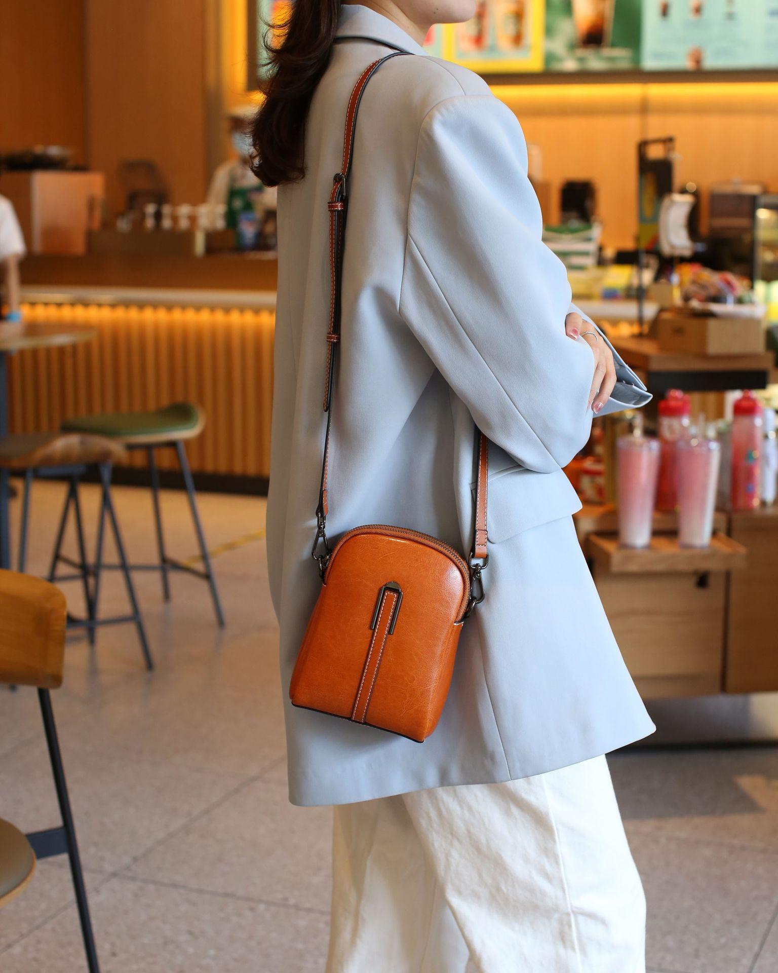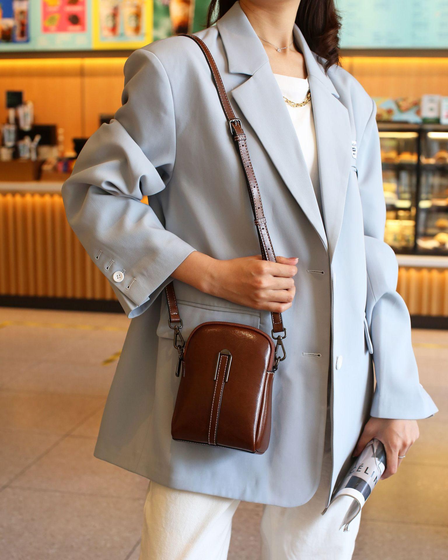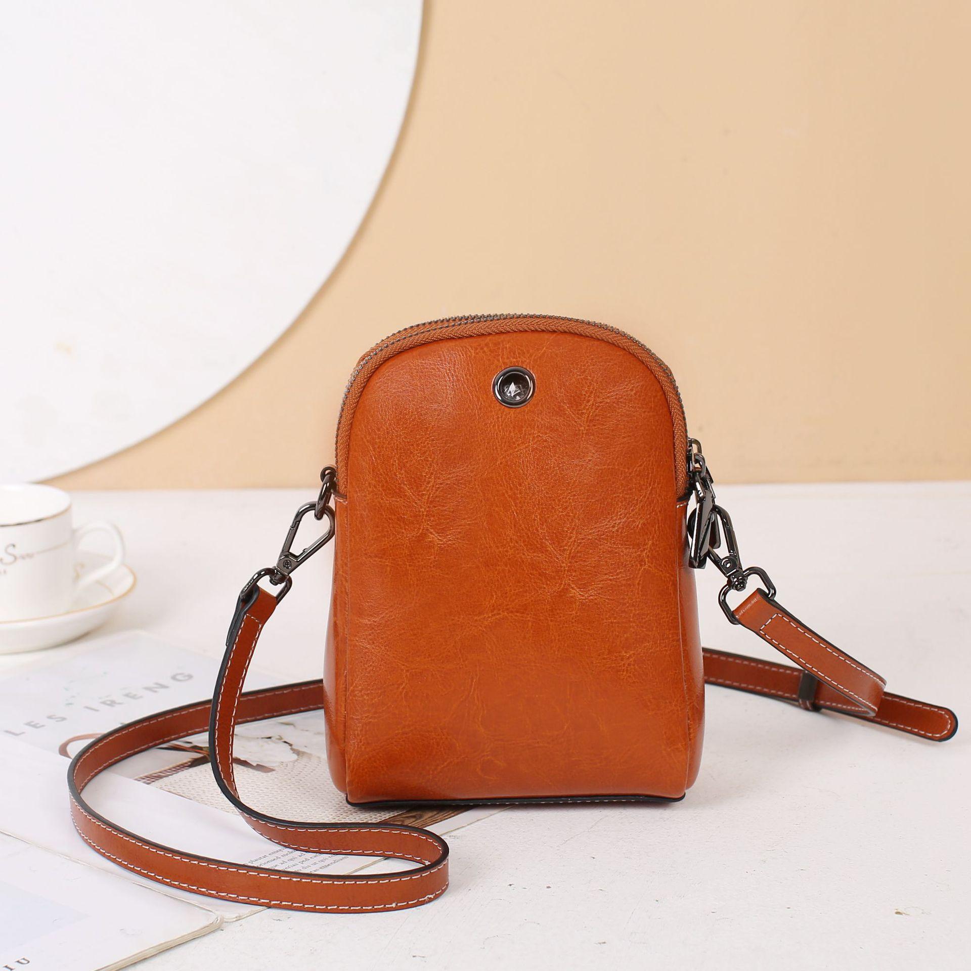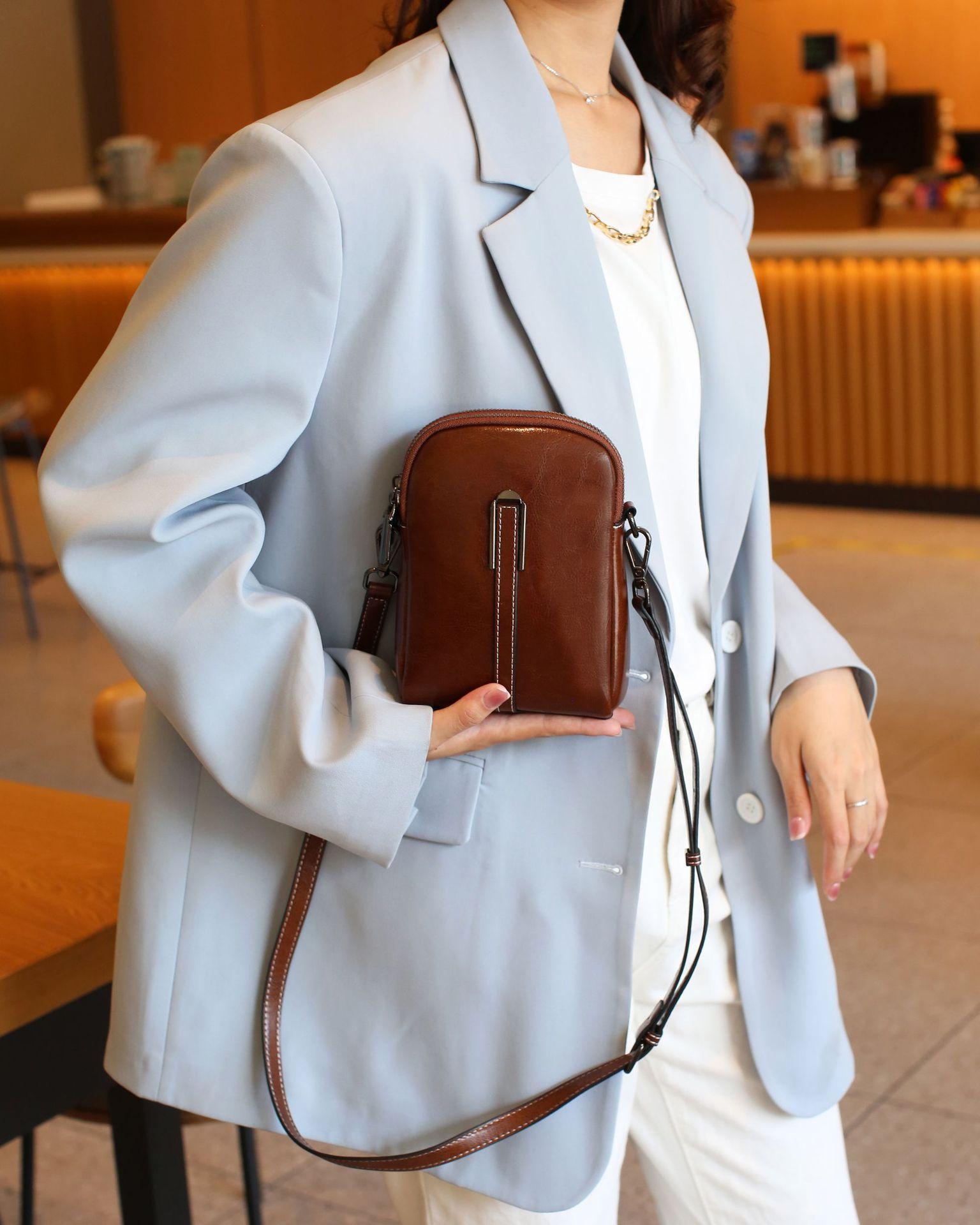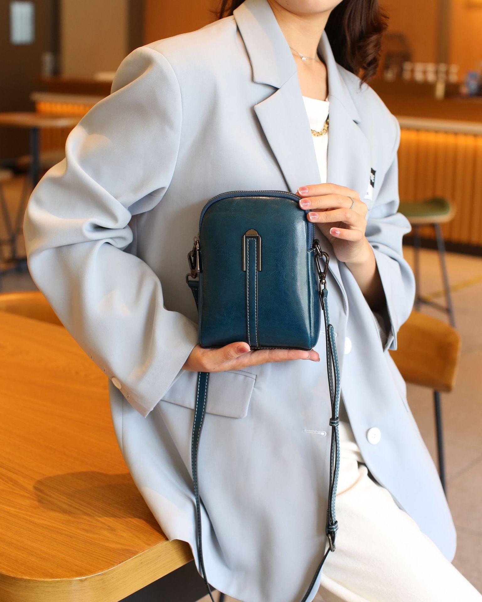 Bolso para teléfono de piel de vaca encerada al aceite de un solo hombro.