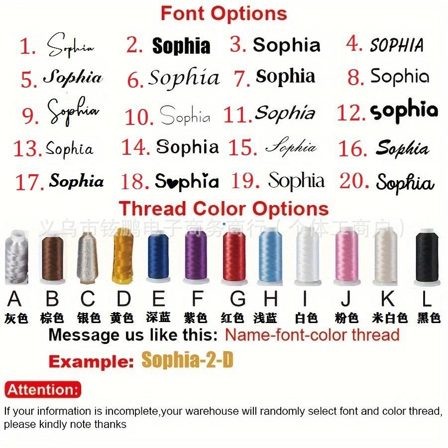 Personalización de pieza única pequeña, puede bordar logotipo de letra personalizado, 20 tipos de fuentes de bordado y colores de hilo de bordar para que elijas, también acepta personalización de fuente y color especificados por el cliente, diversificado para satisfacer tus necesidades