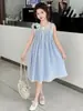 Vestido de Niña Cuello Redondo Francés Diseño de Verano Estampado de Lazo Manga Abullonada Falda Vestido de Princesa para Niños