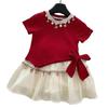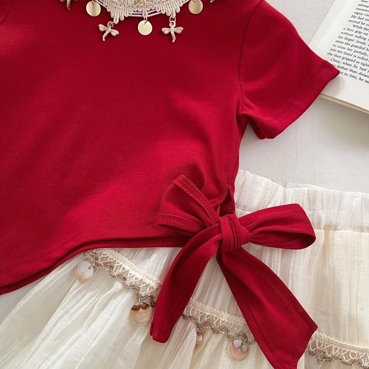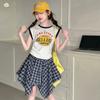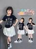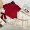 Traje de falda para niña Verano 2025 Nueva Llegada Camiseta de manga corta con lazo irregular para niña Conjunto de moda de dos piezas