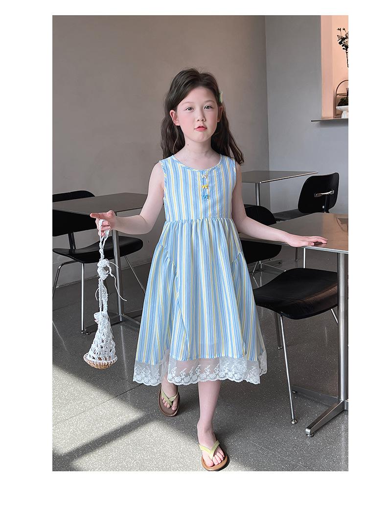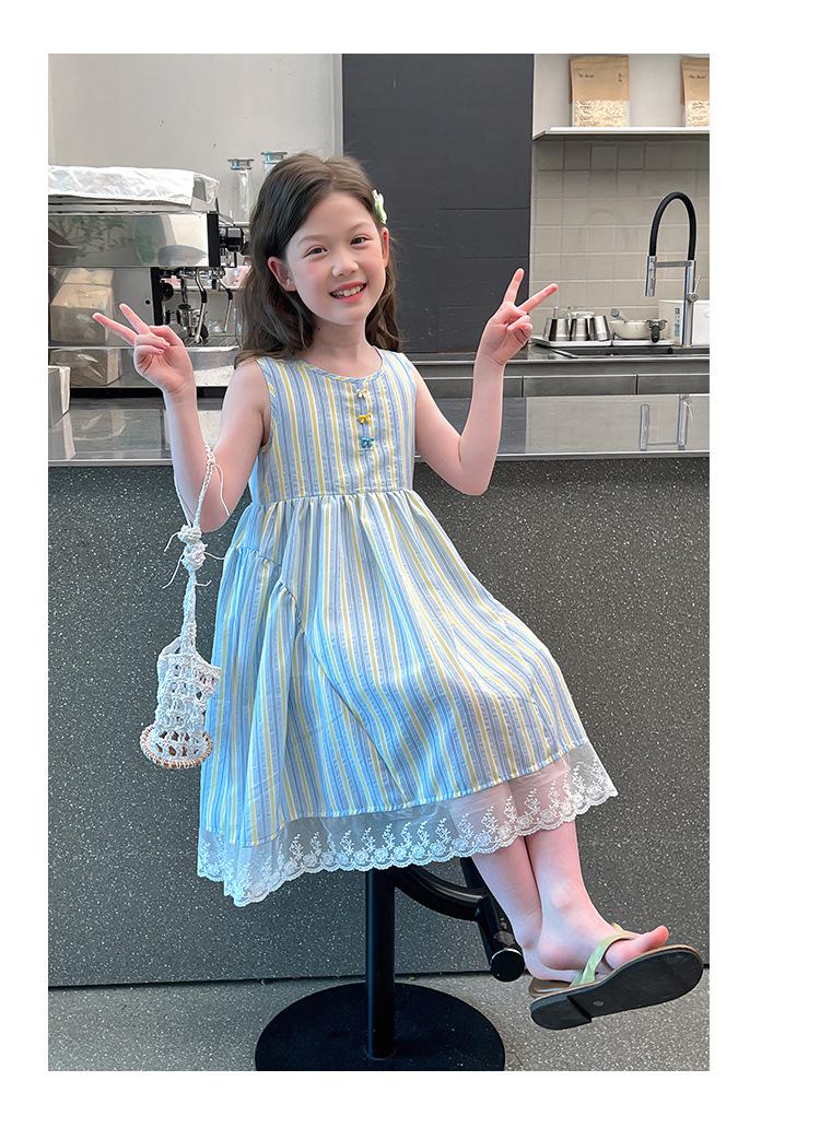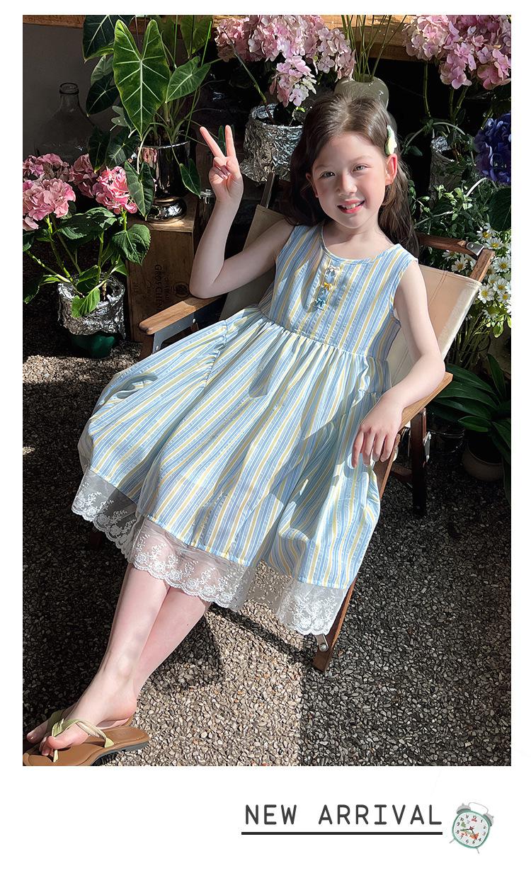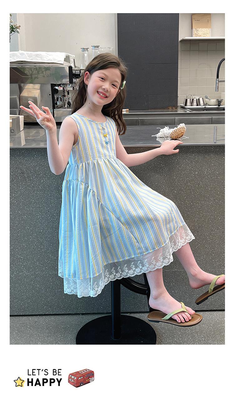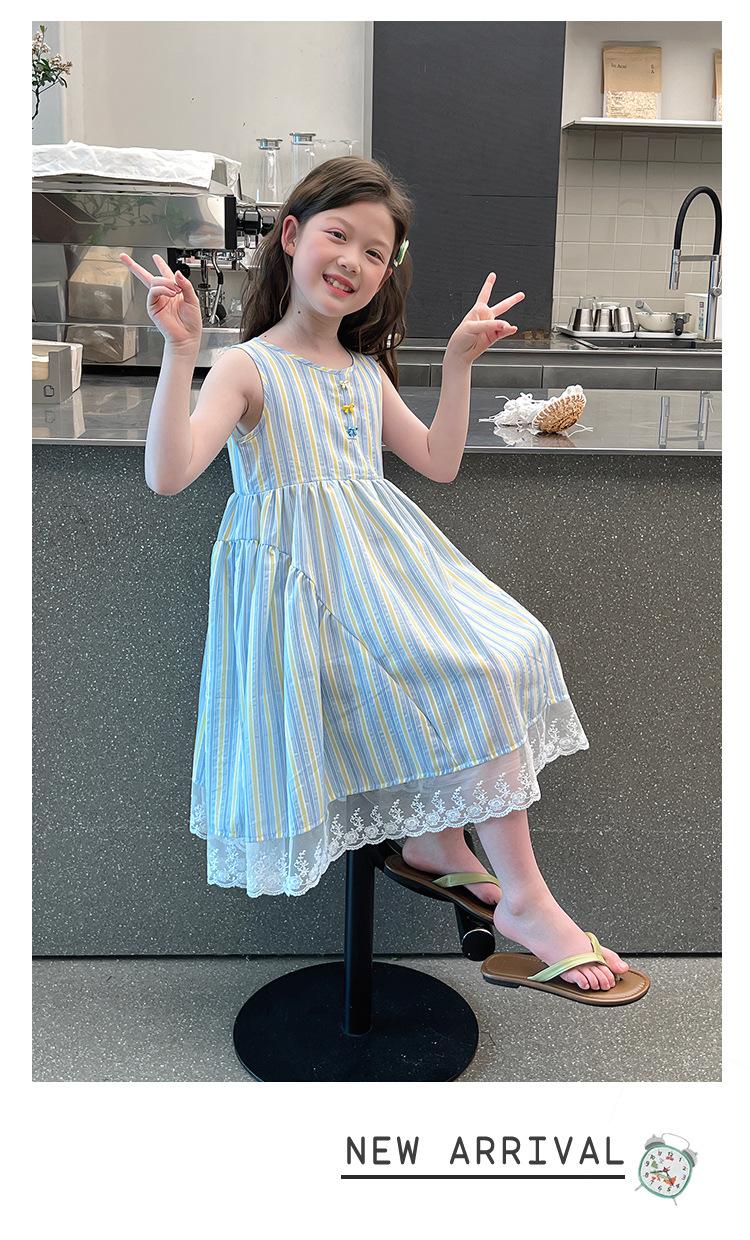 Vestido de Tirantes Rayado de Encaje para Niñas Vestido de Princesa Elegante sin Mangas para Niños Vestido para Niños Grandes 2025 Verano Nuevo Estilo