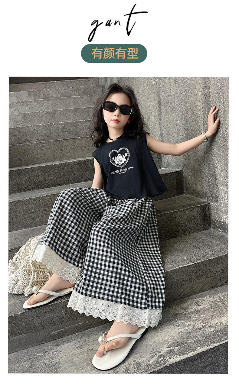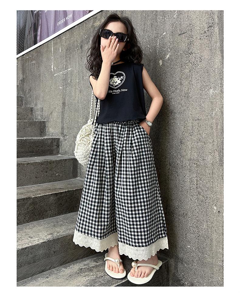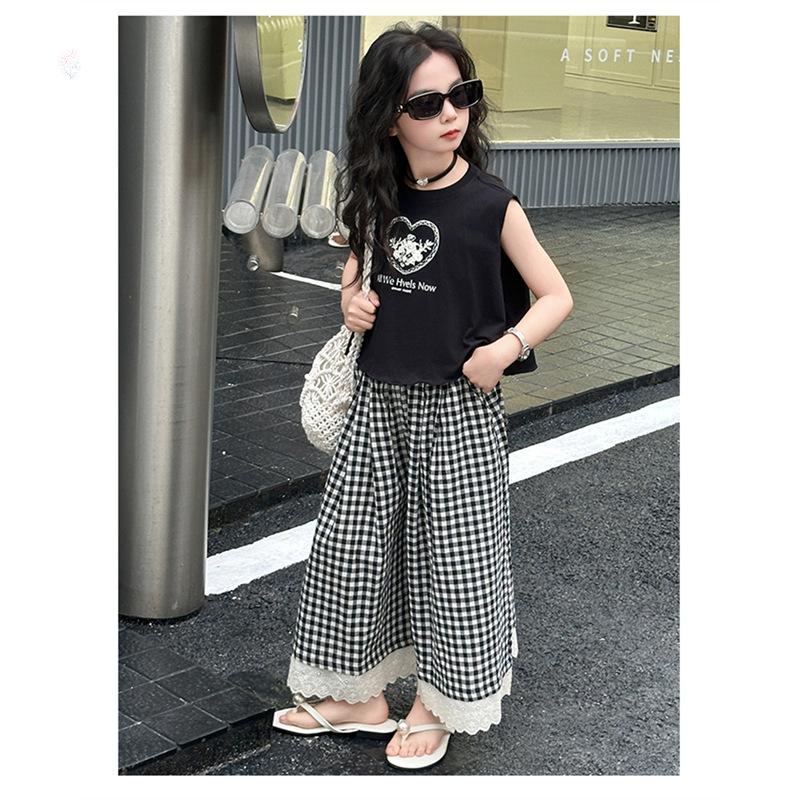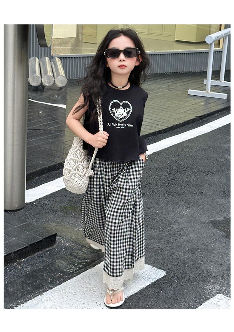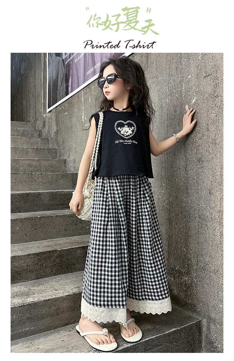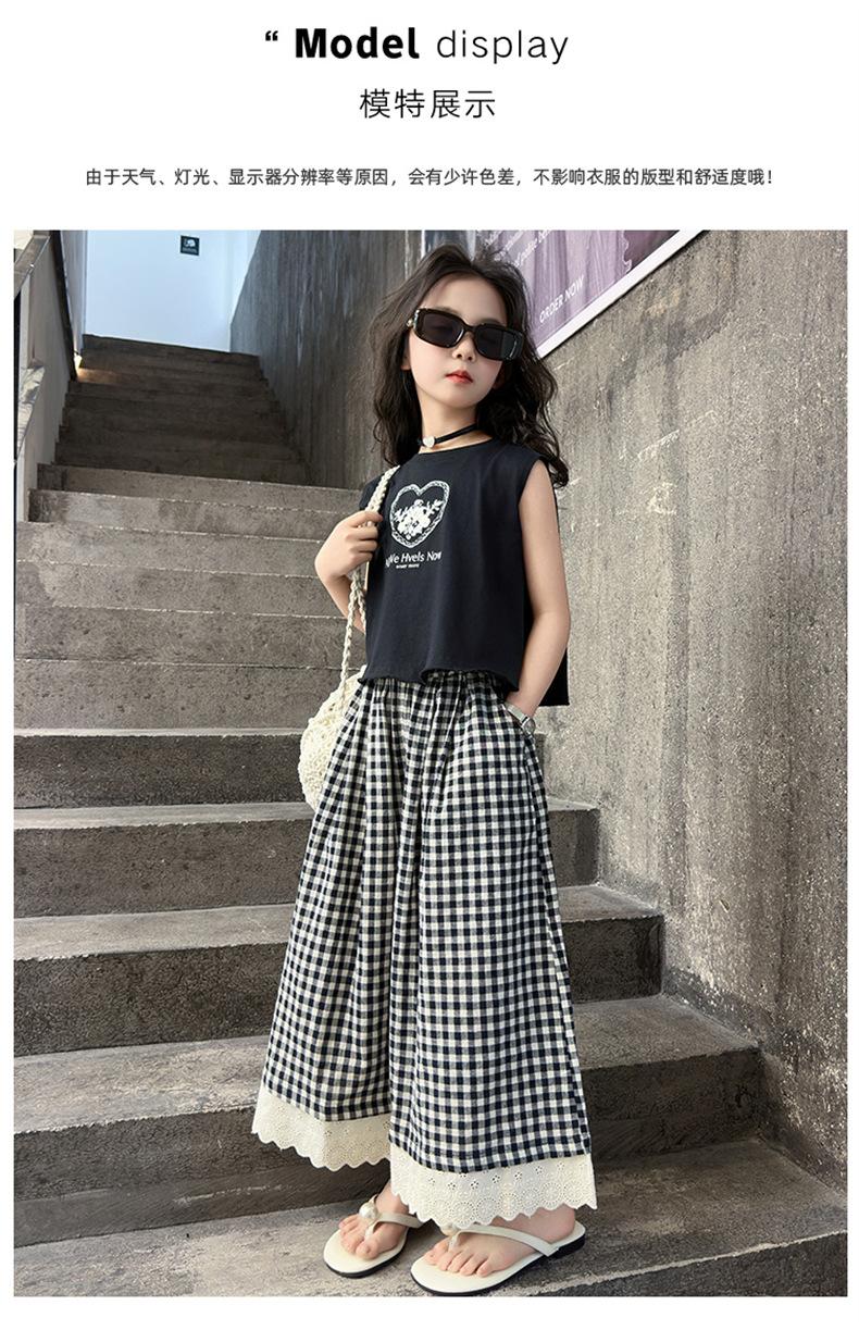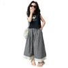 Traje de falda a cuadros de encaje para niña, camiseta casual sin mangas, falda grande para niños, falda larga, verano 2025, nuevo, holgado