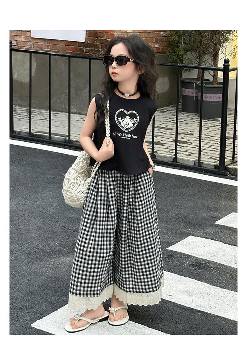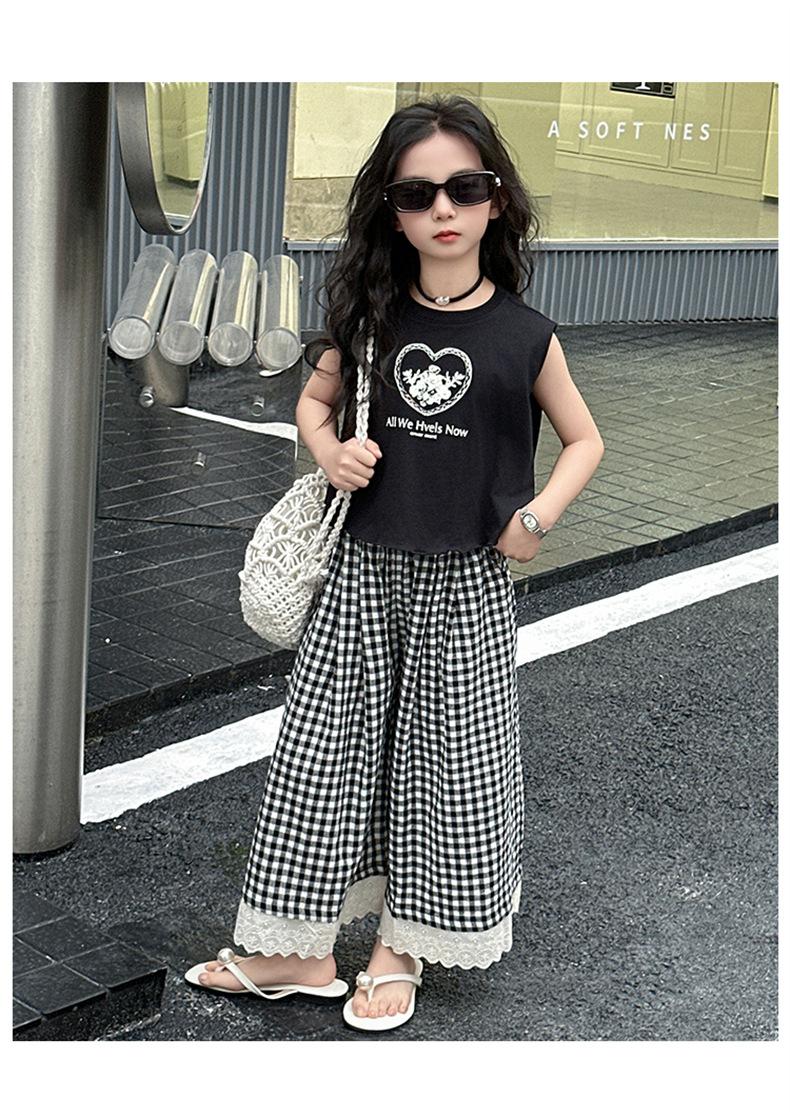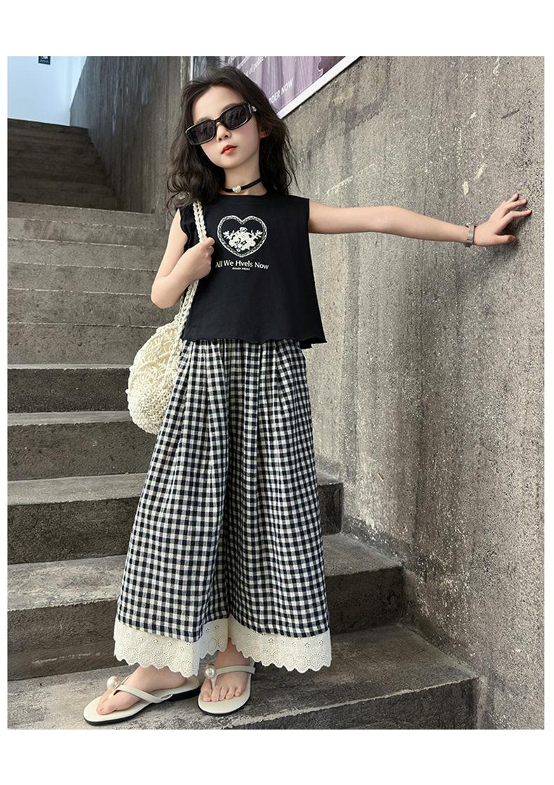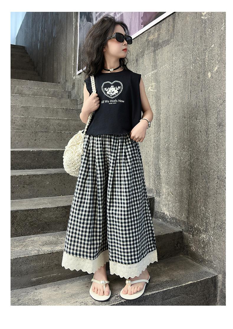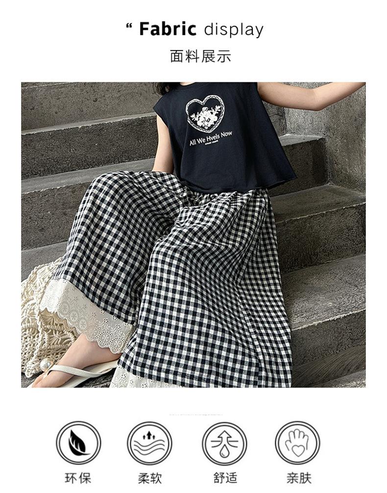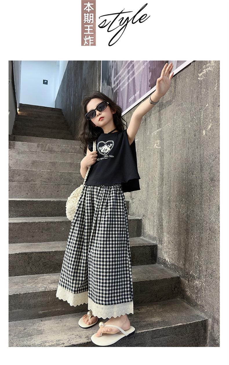 Traje de falda a cuadros de encaje para niña, camiseta casual sin mangas, falda grande para niños, falda larga, verano 2025, nuevo, holgado