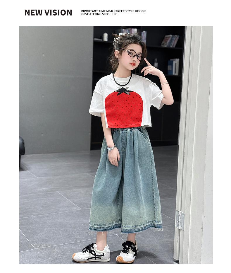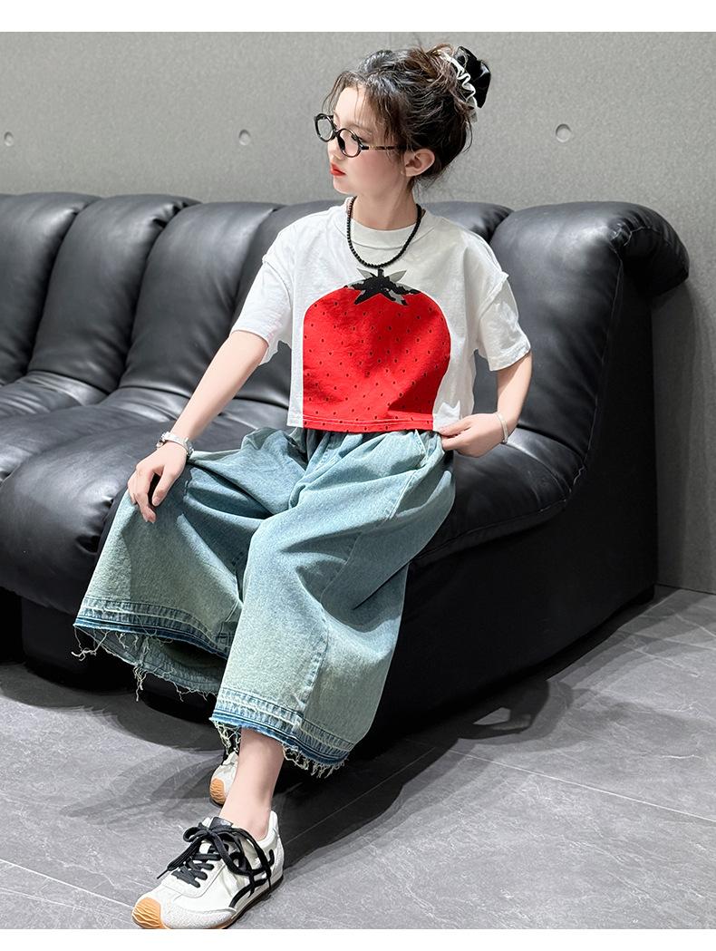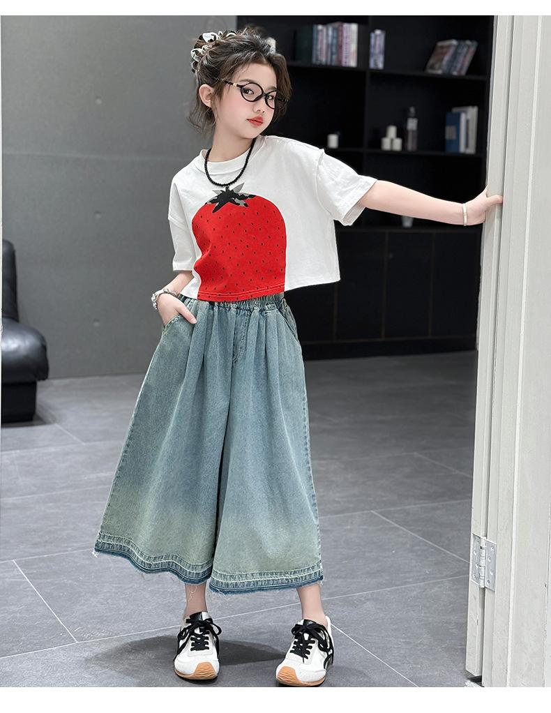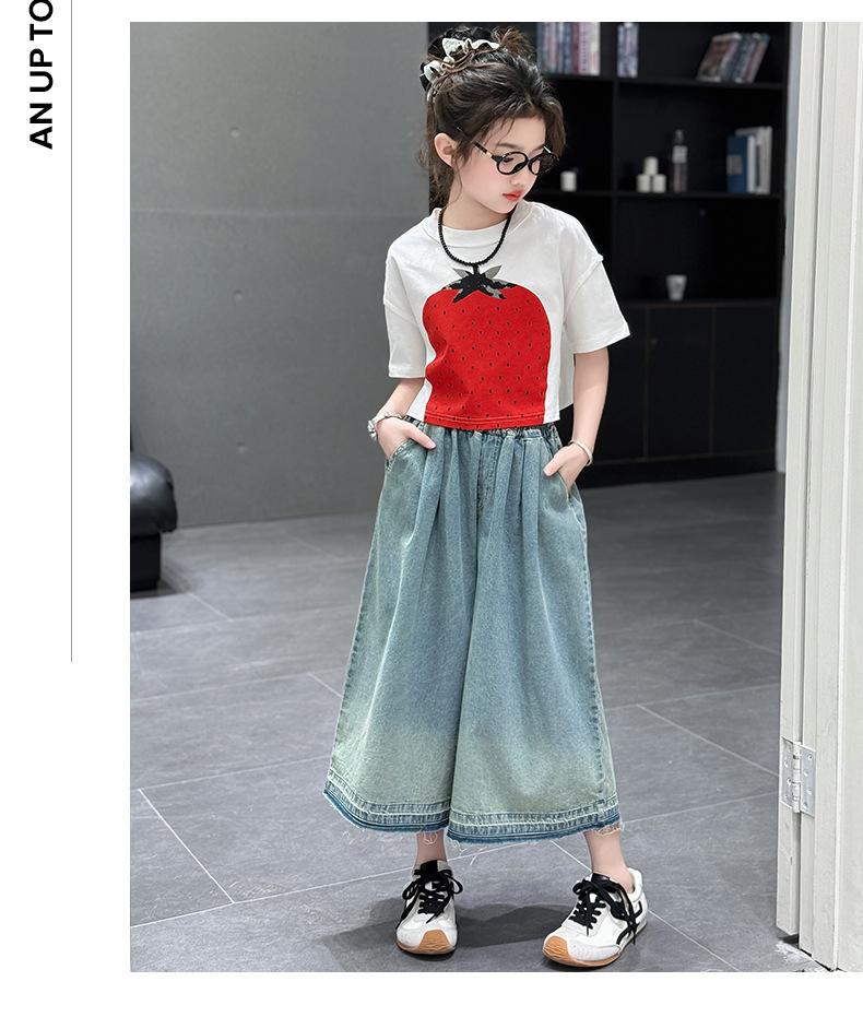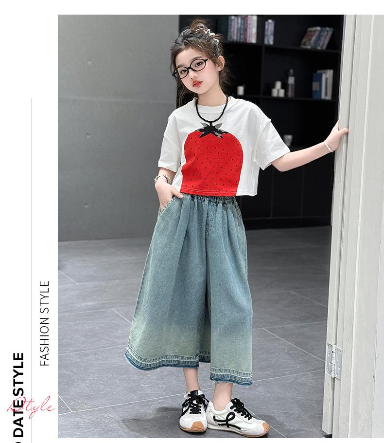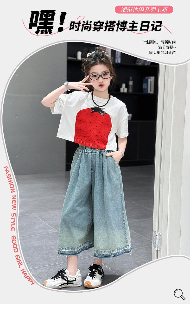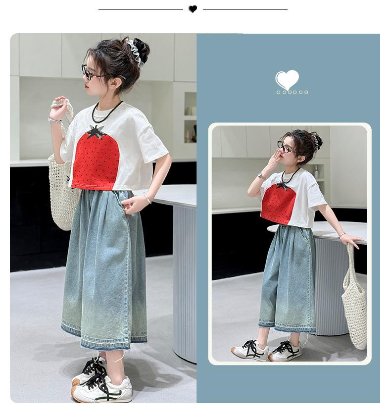 Traje de verano para niñas 2025 Nueva Moda Camiseta de fresa estilo coreano para niñas Pantalones vaqueros de pierna ancha