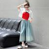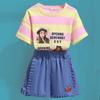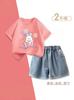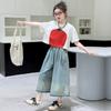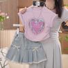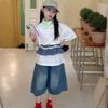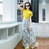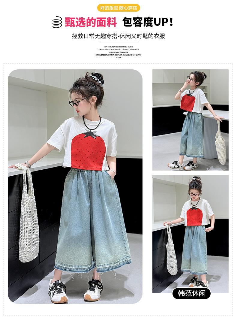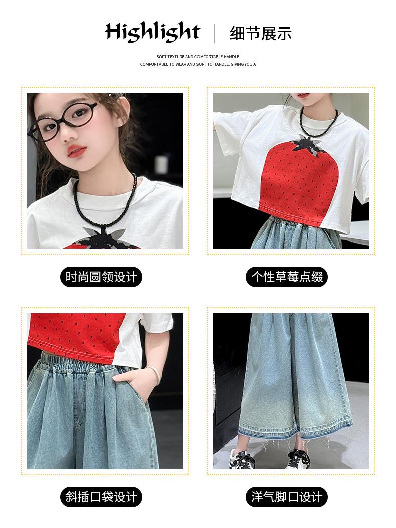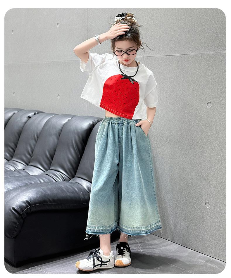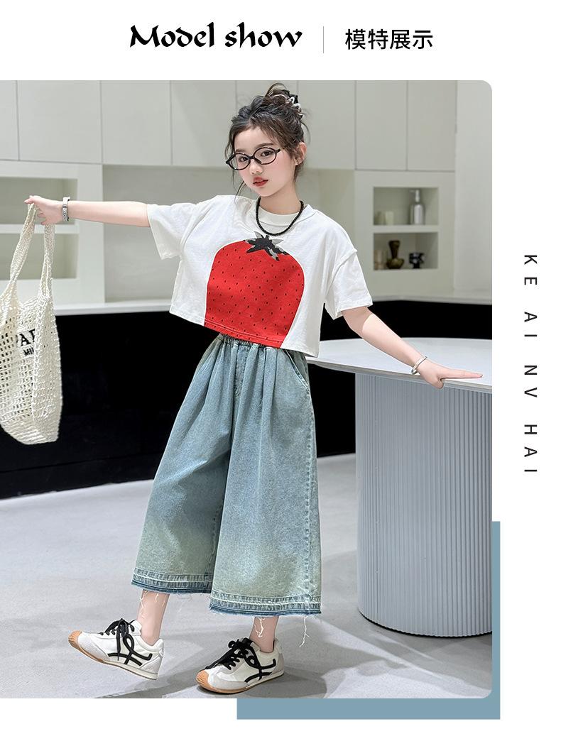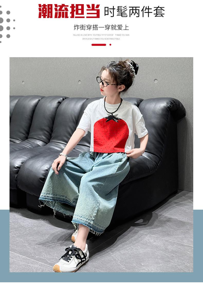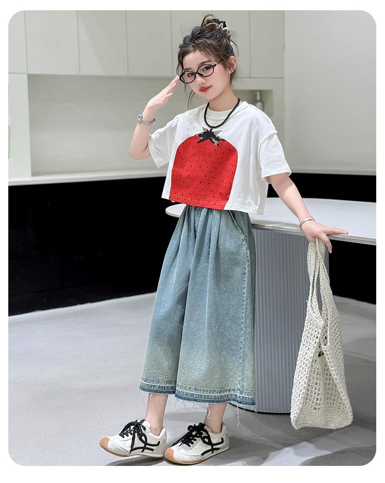 Traje de verano para niñas 2025 Nueva Moda Camiseta de fresa estilo coreano para niñas Pantalones vaqueros de pierna ancha