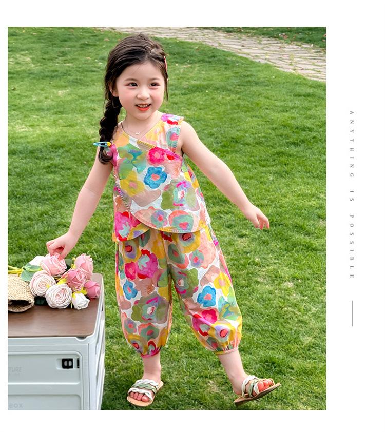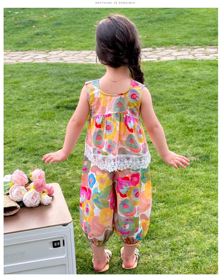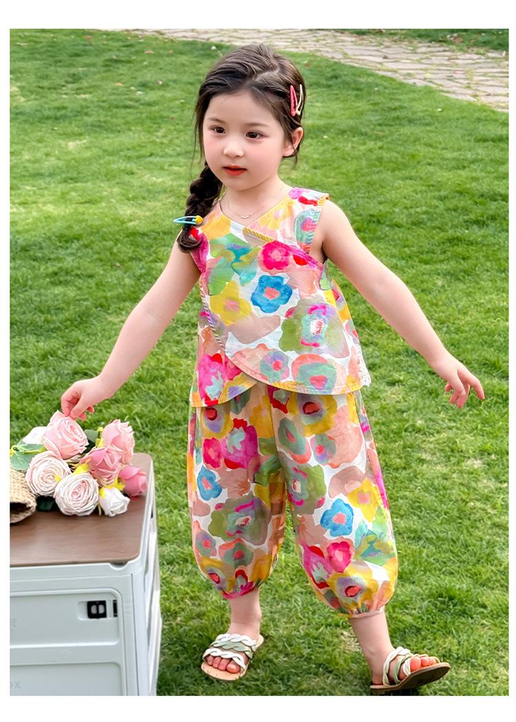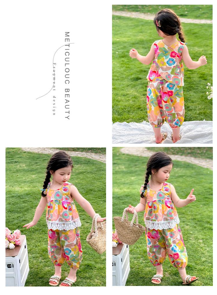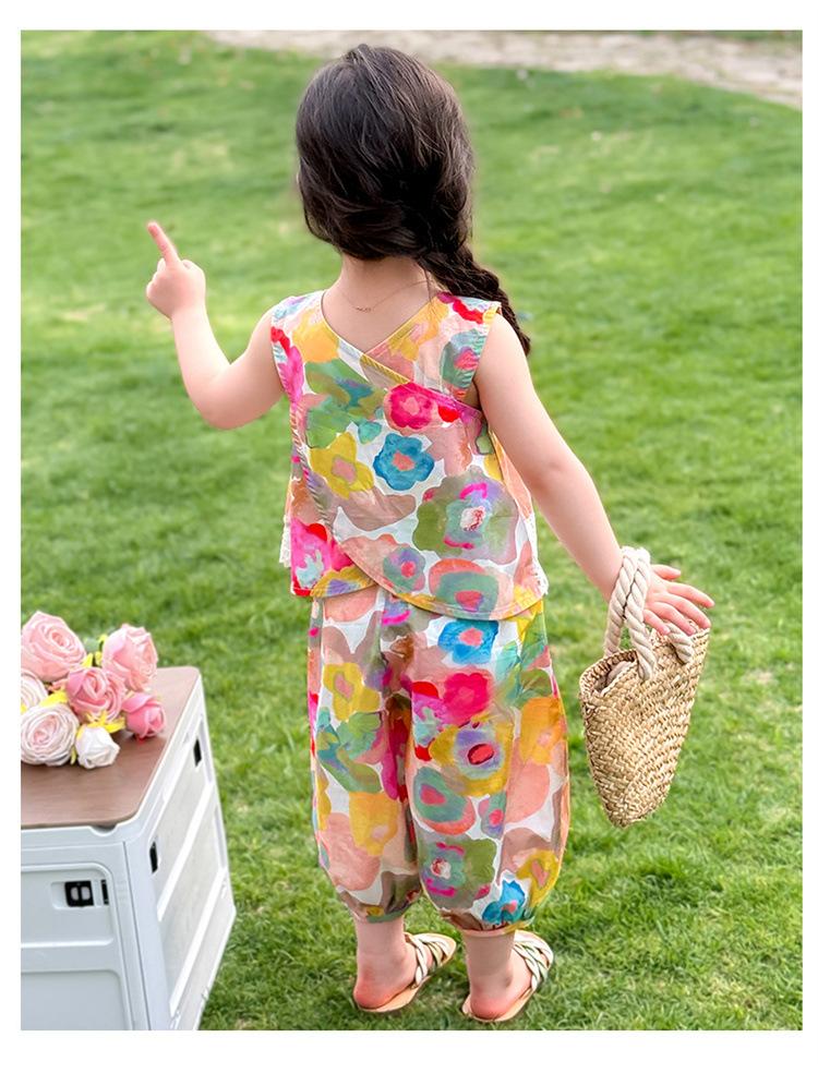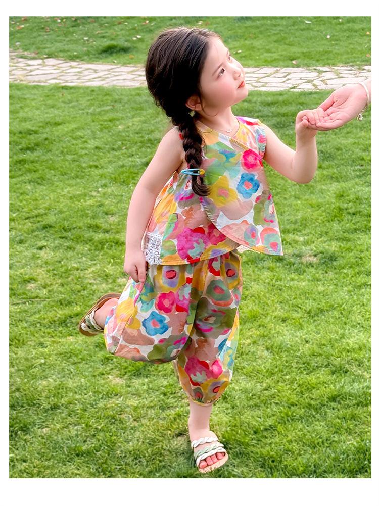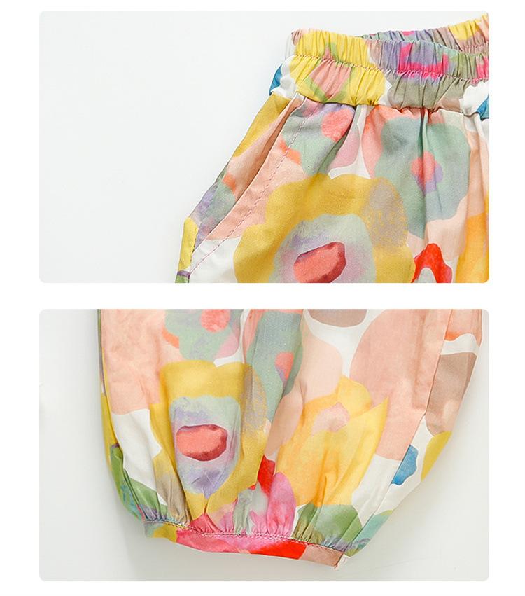 Conjunto de pantalones de verano holgados y elegantes para niñas con estampado floral de moda y antimosquitos 2025 Nueva versión coreana delgada Moda para bebé