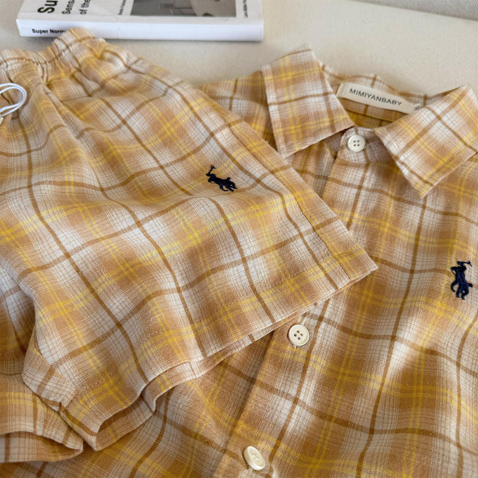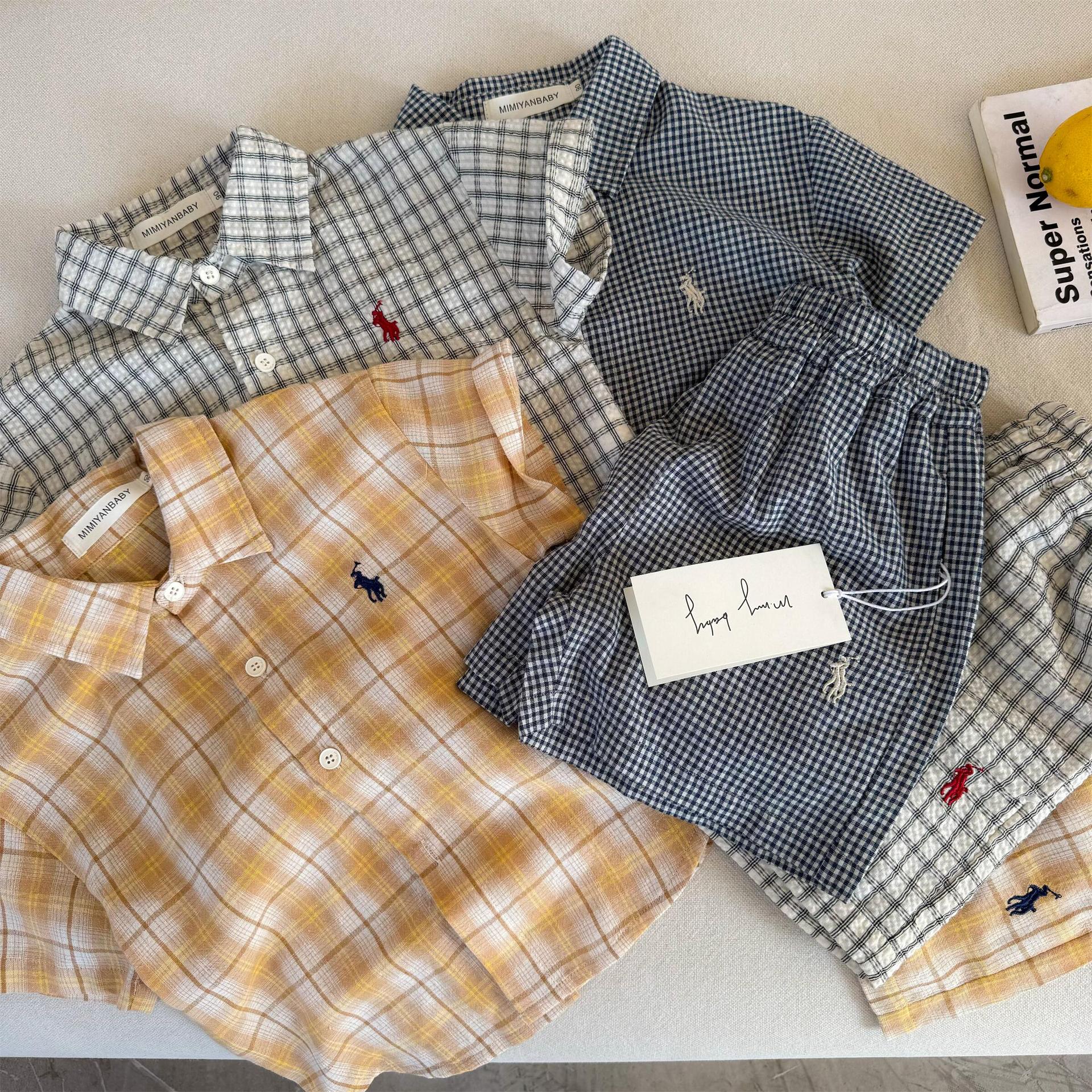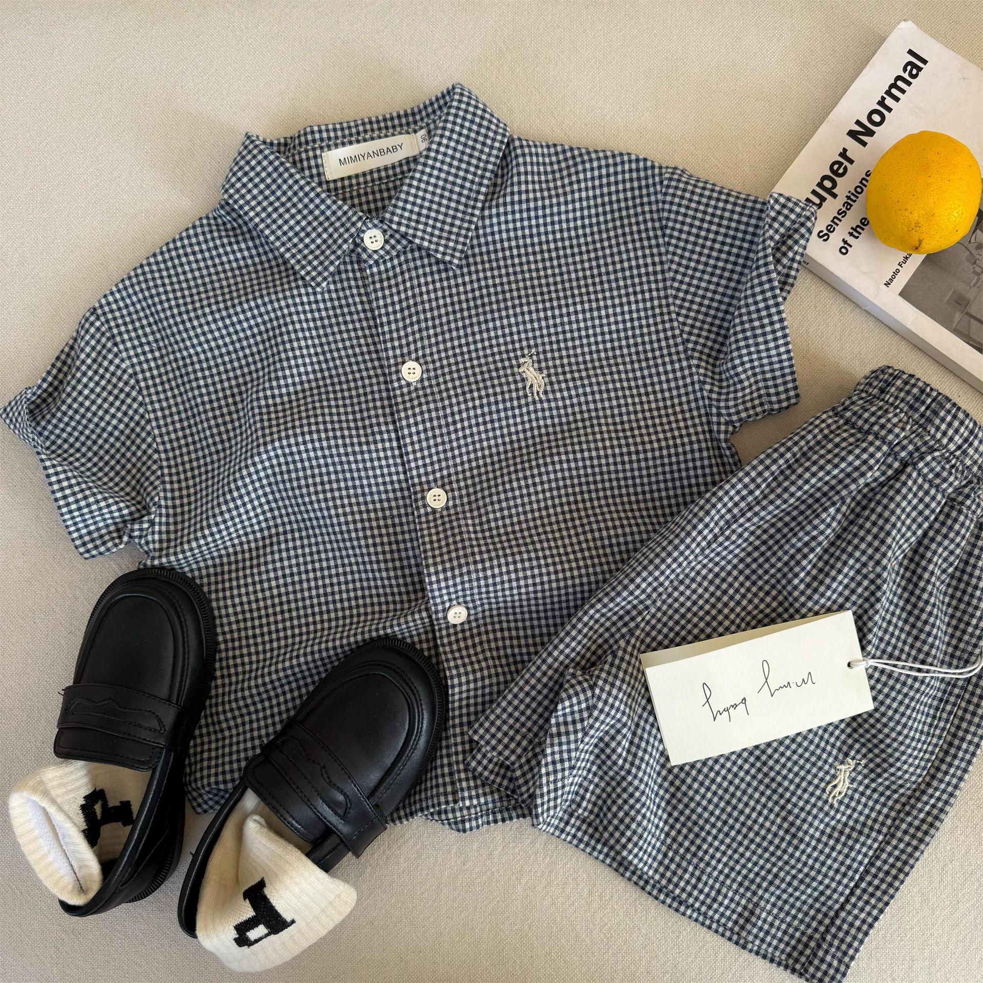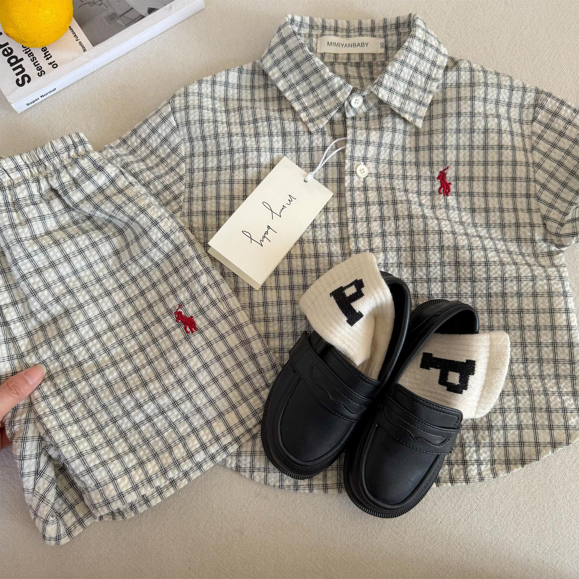 Traje para niños 2025 Verano Camisa de manga corta bordada a cuadros para niños Pantalones cortos modernos para bebé Conjunto de dos piezas