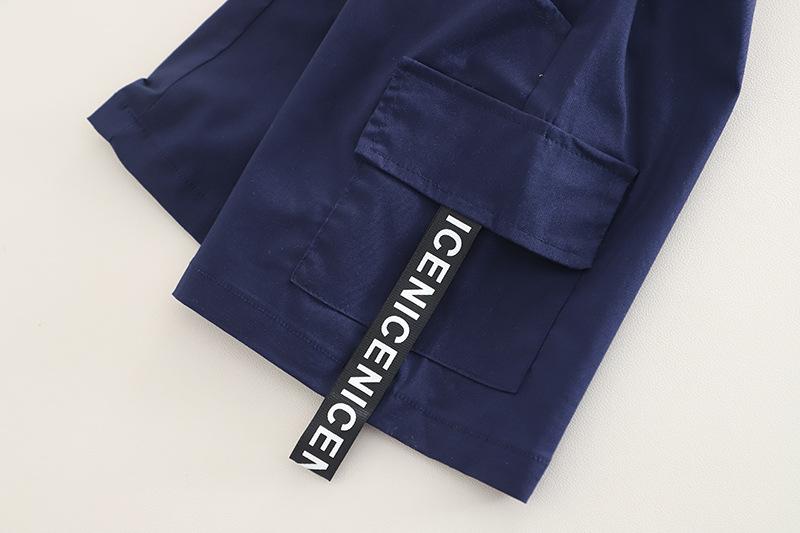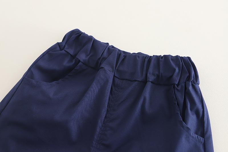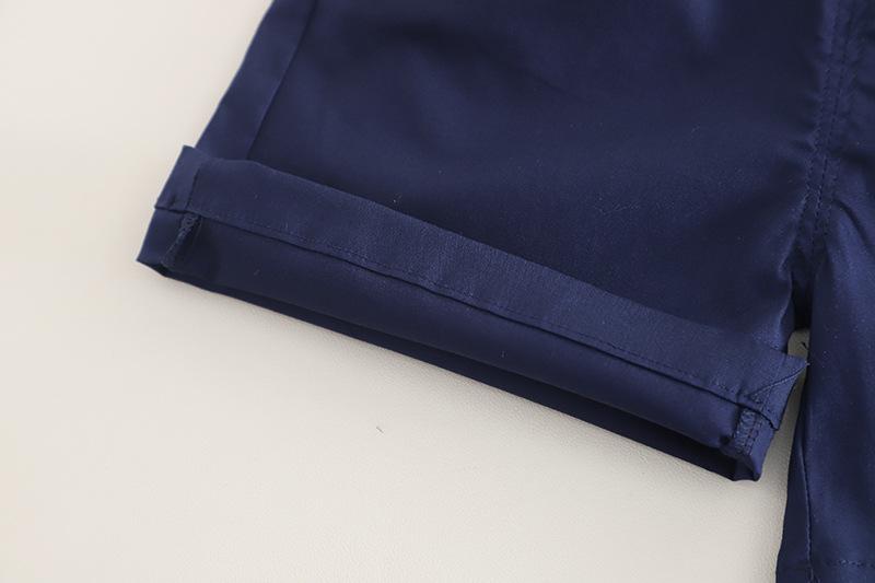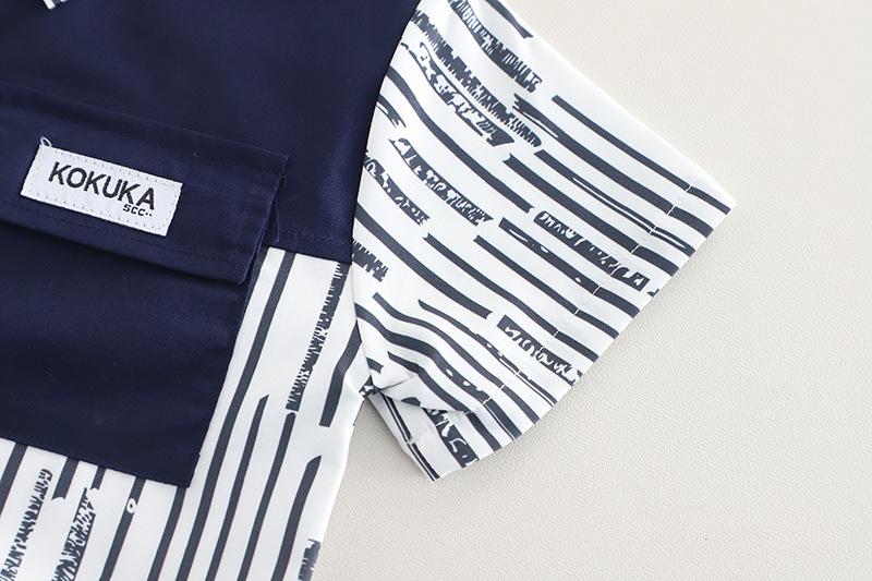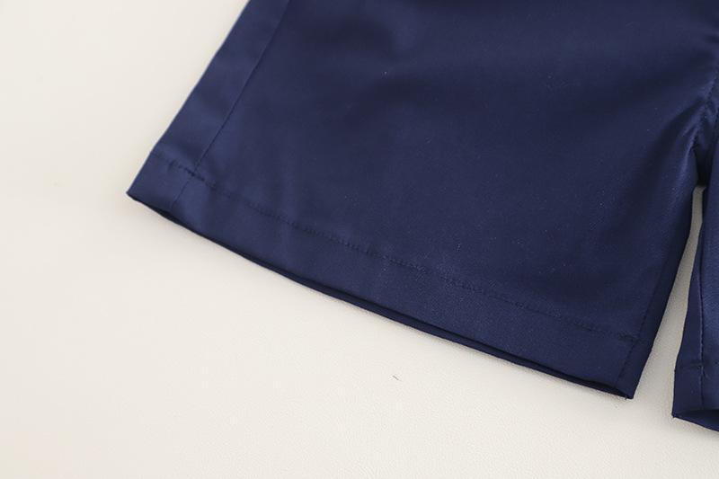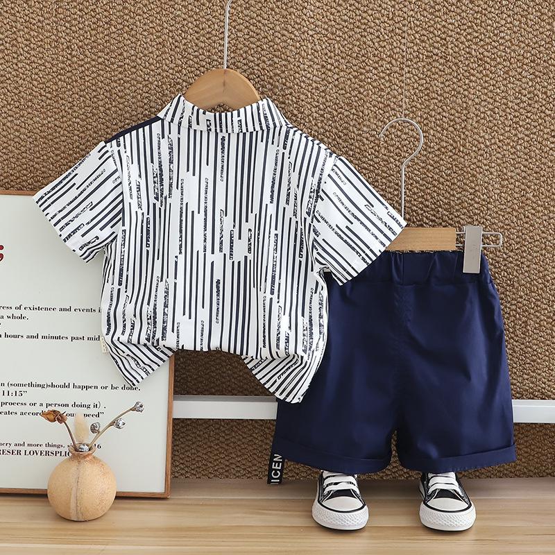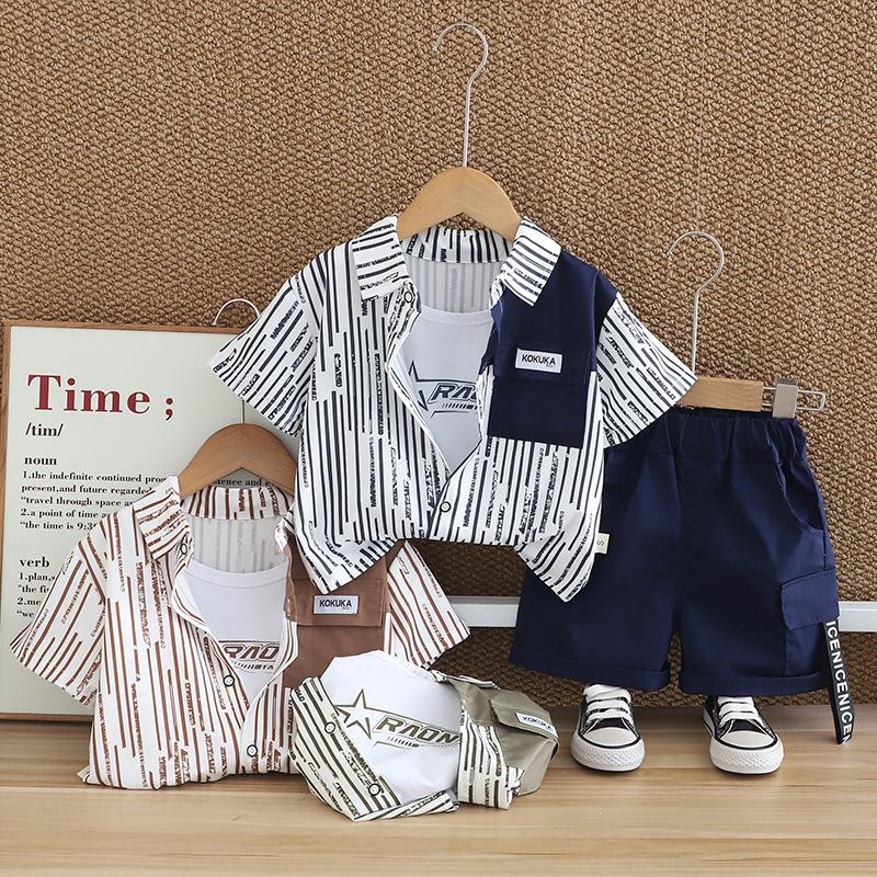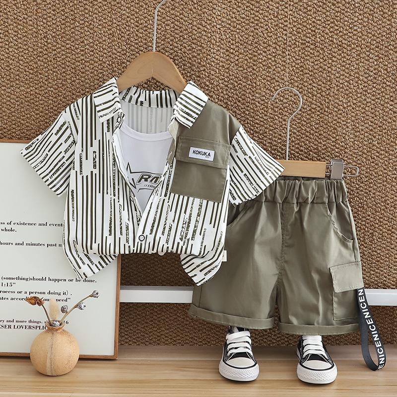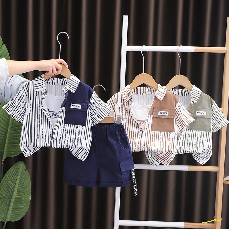 Compra Traje de verano para niño 2025 nuevo estilo bebé niños manga corta camisa vertical costuras bebé moda tres piezas falsas al por mayor en Joom.pro