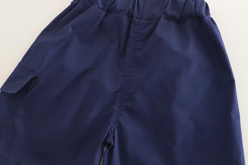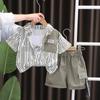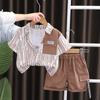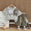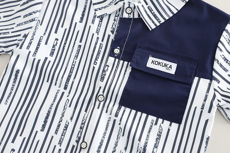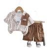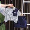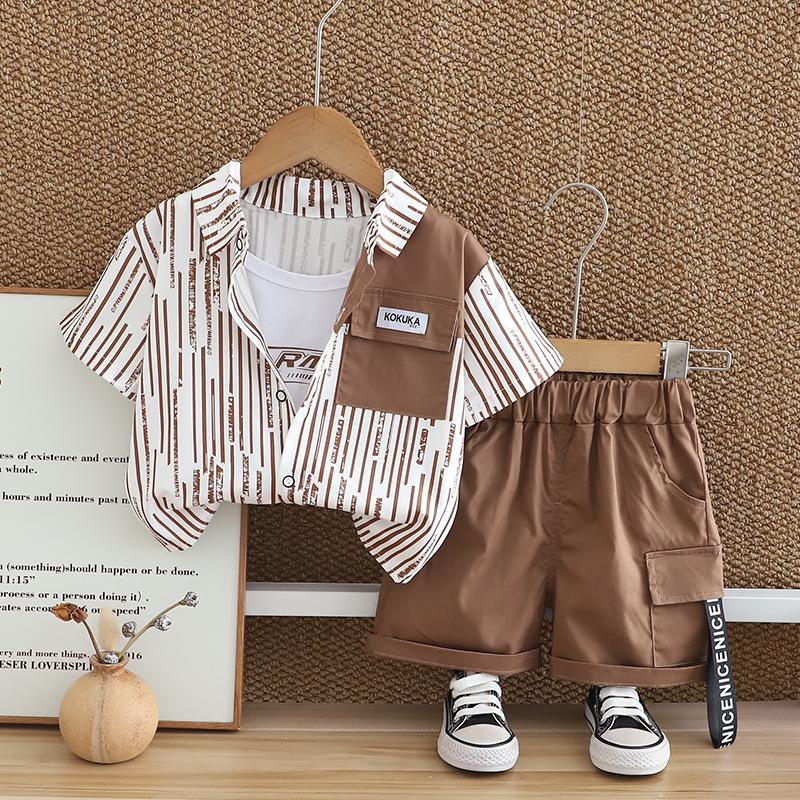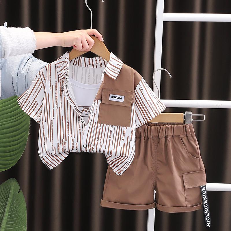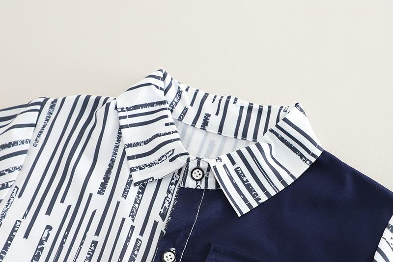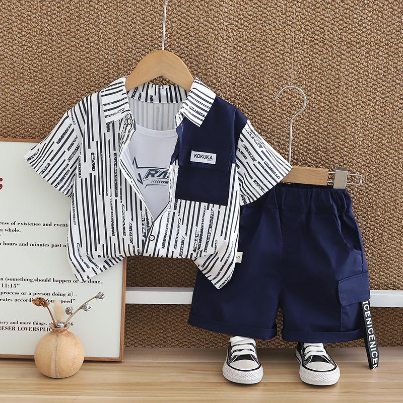 Traje de verano para niño 2025 nuevo estilo bebé niños manga corta camisa vertical costuras bebé moda tres piezas falsas