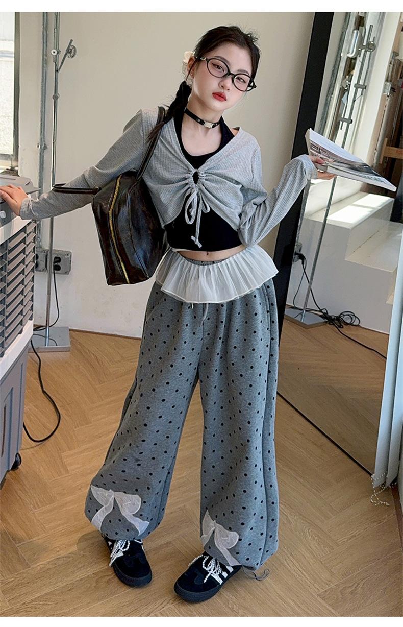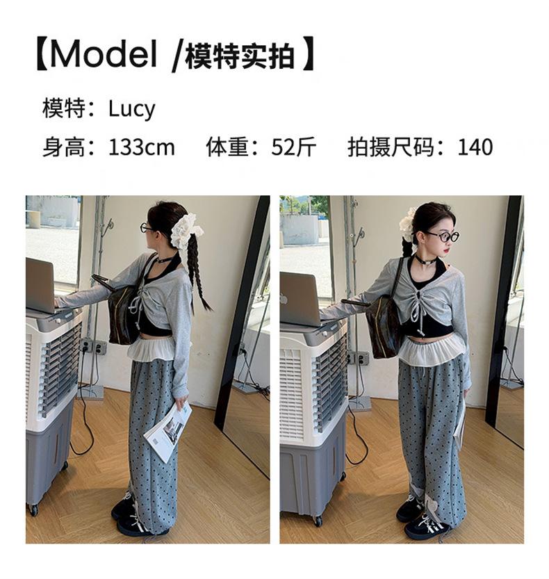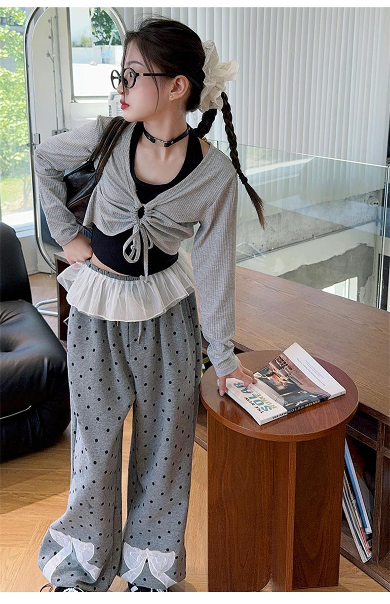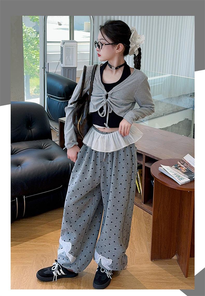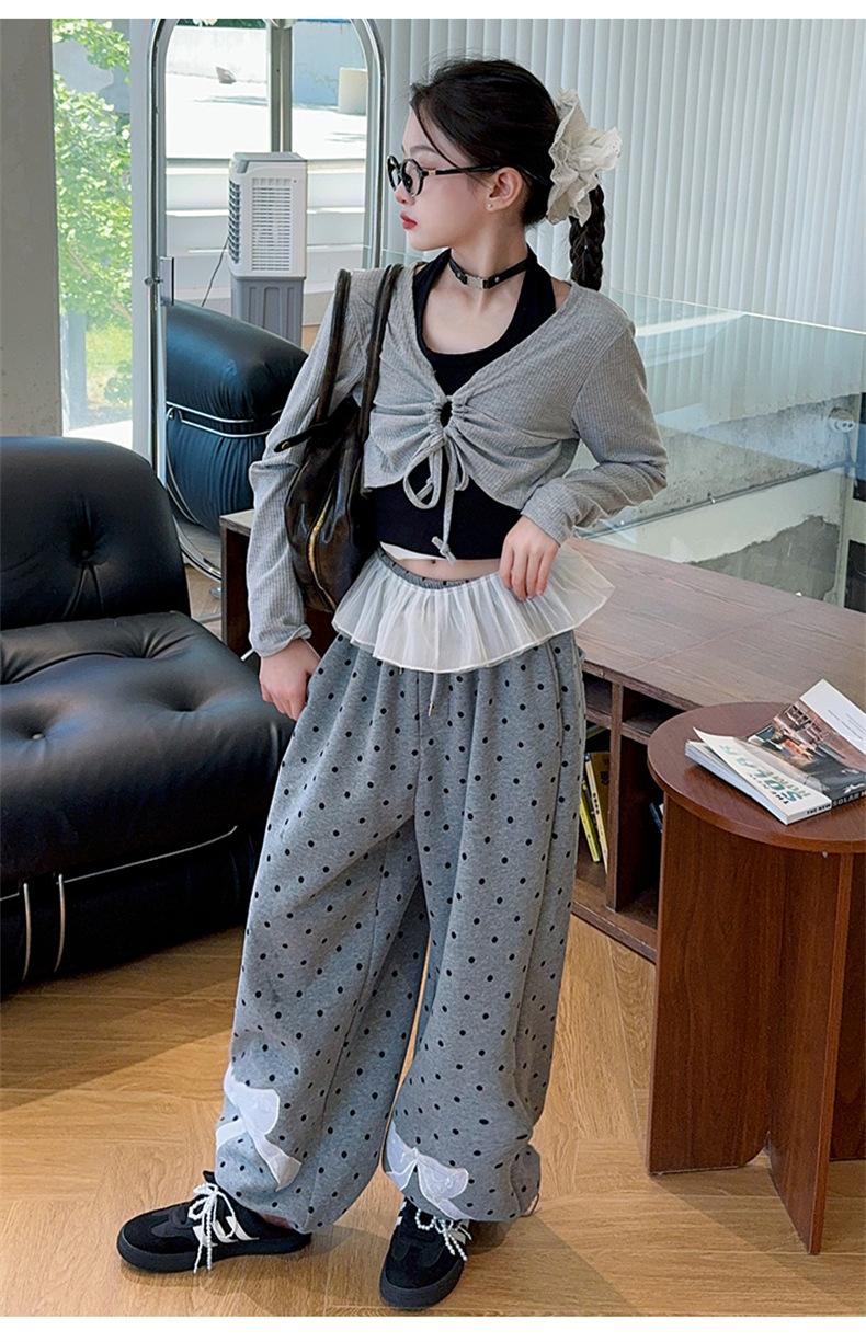 Traje de Primavera y Otoño para Niñas 2024 Nueva Moda Estilo Coreano para Niñas Pantalones de Lunares Estilo Occidental para Niños Grandes con Cubierta de Cintura de Red