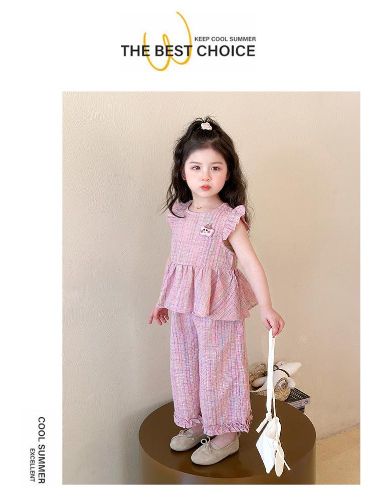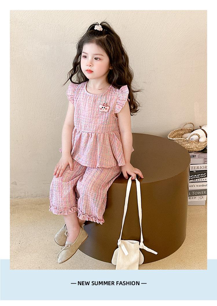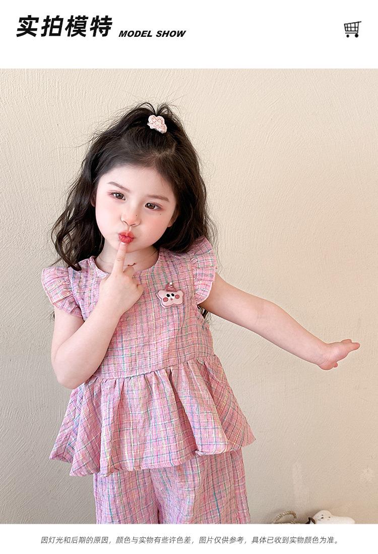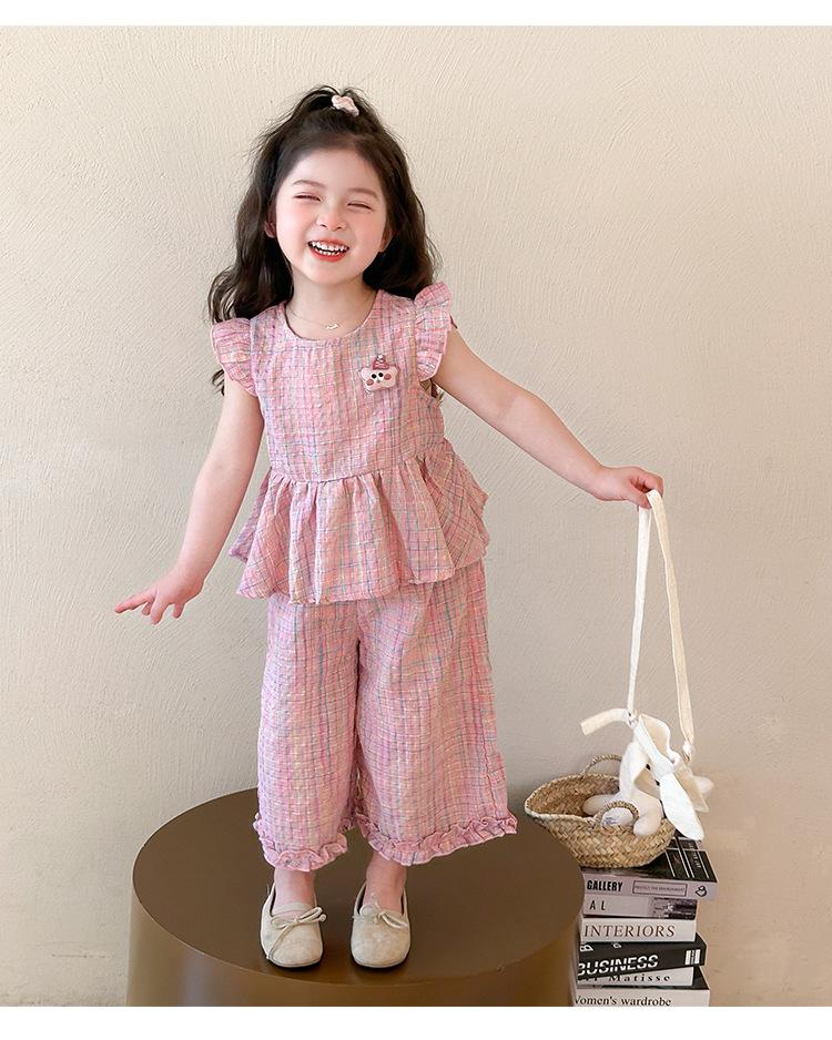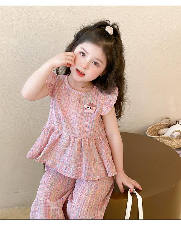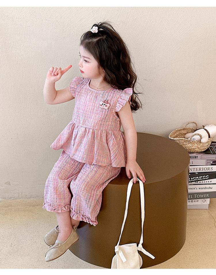 Traje de cuadros de manga volada para niña 2025 Verano Nueva Moda Niña Conjunto elegante de dos piezas Vestido de verano para niños pequeños y medianos