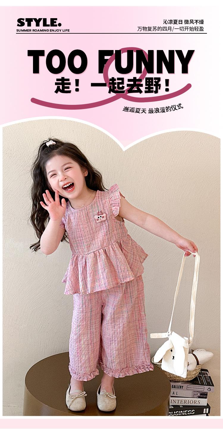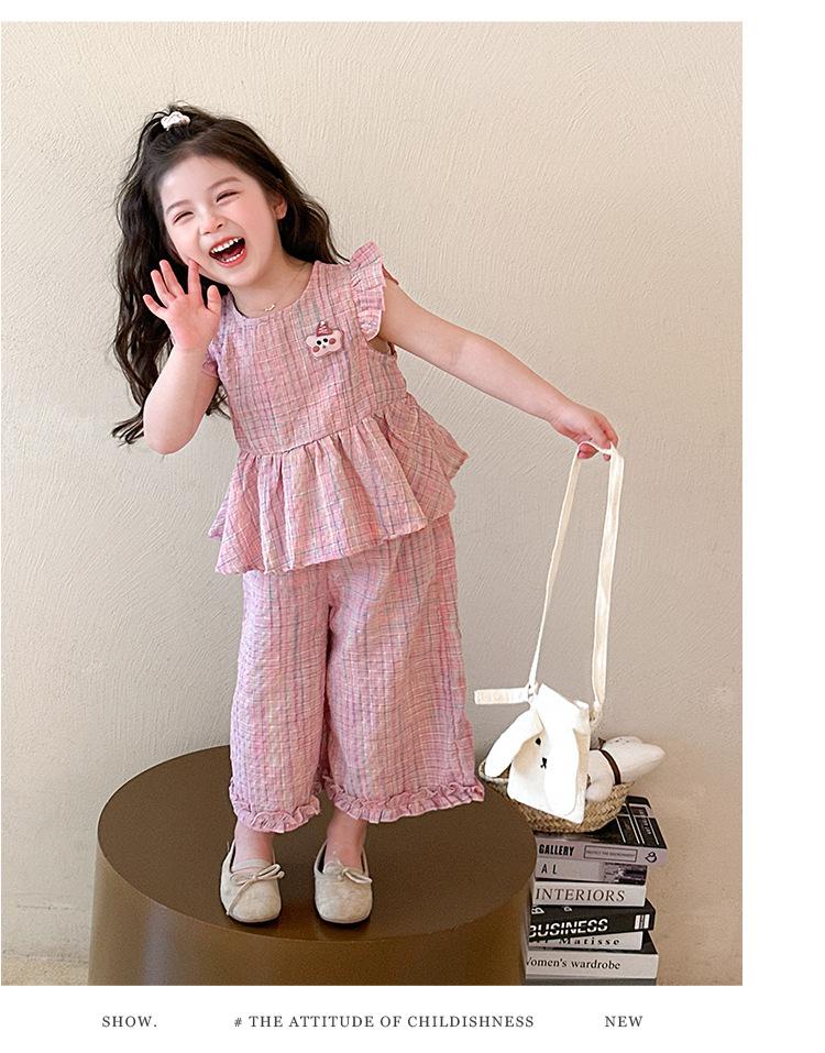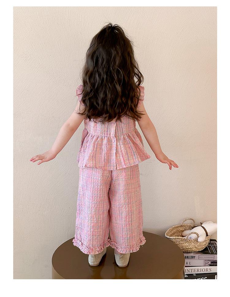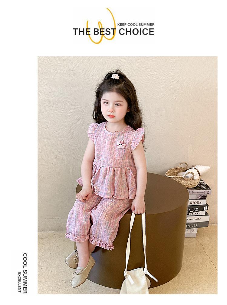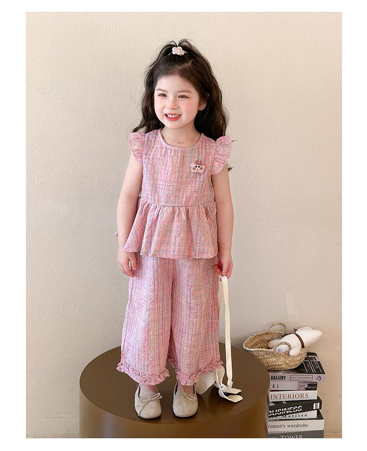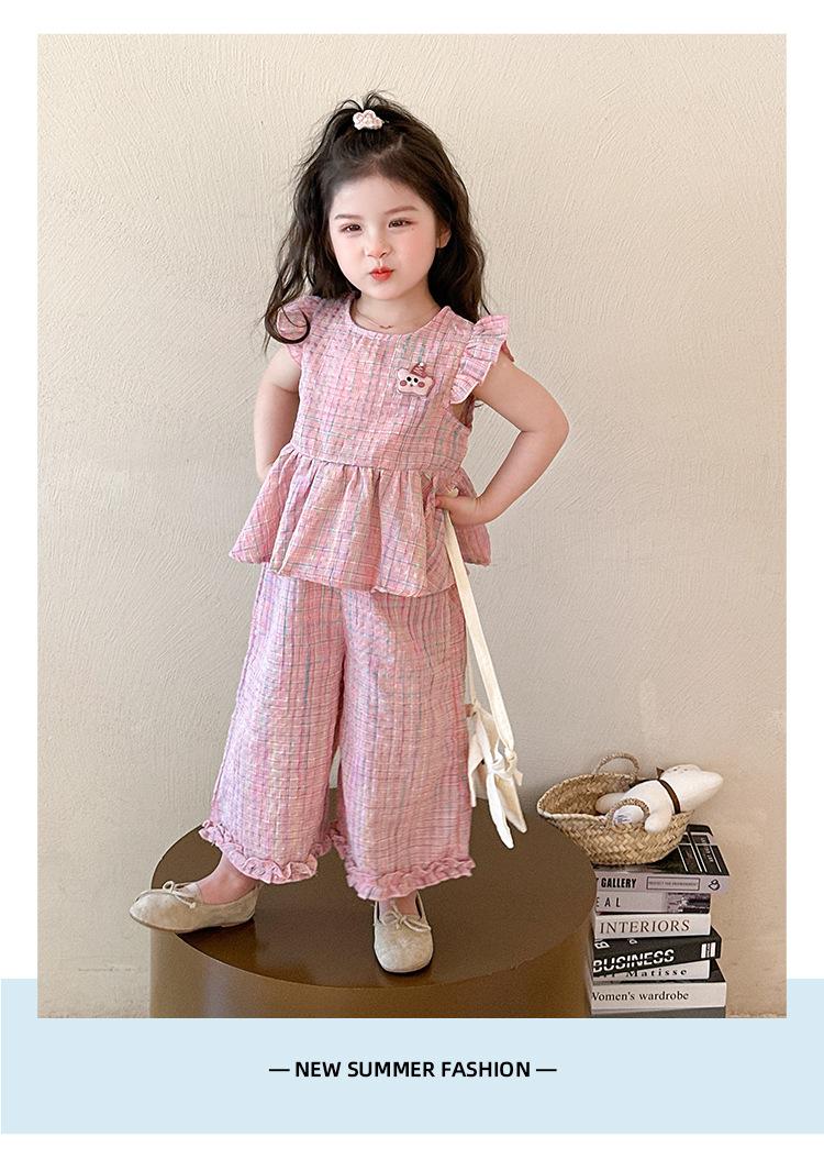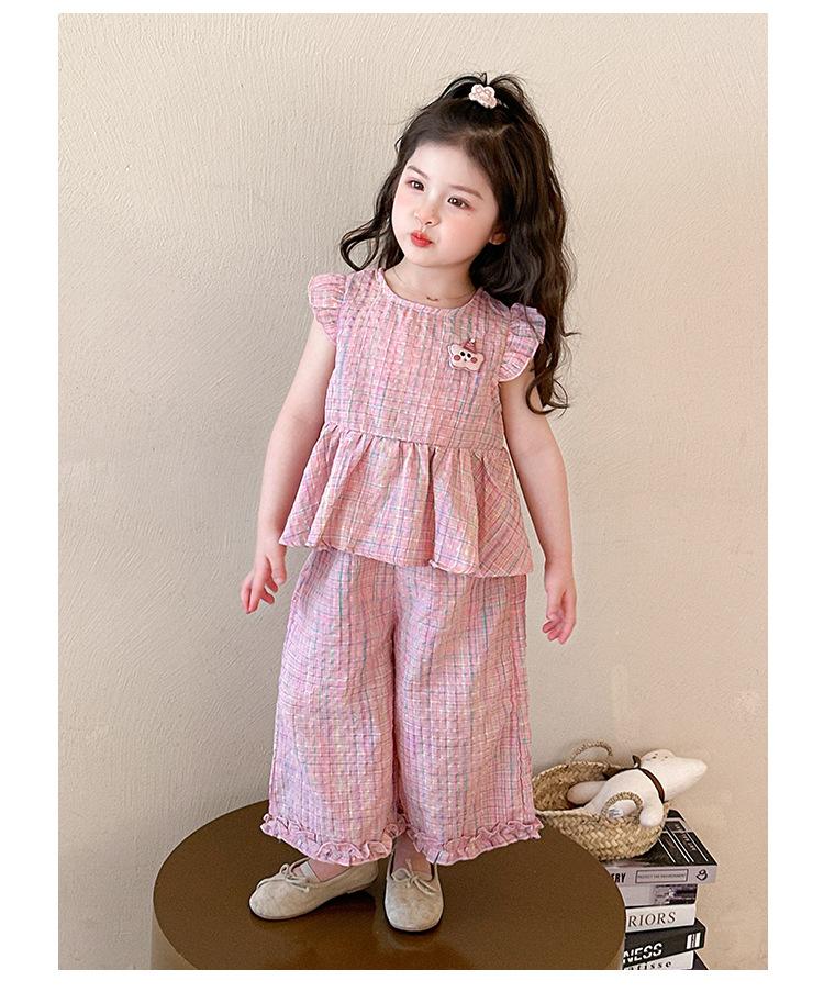 Traje de cuadros de manga volada para niña 2025 Verano Nueva Moda Niña Conjunto elegante de dos piezas Vestido de verano para niños pequeños y medianos