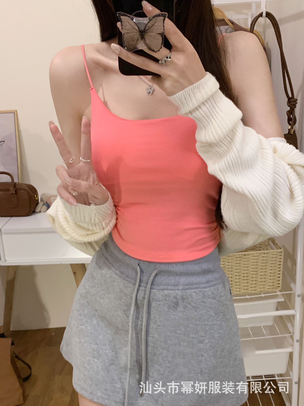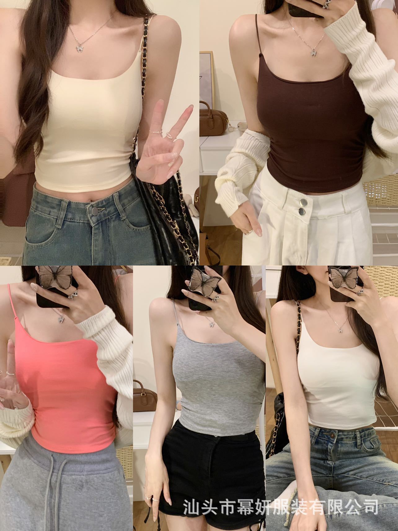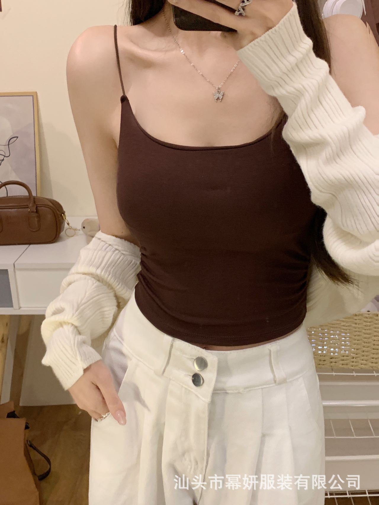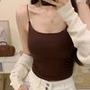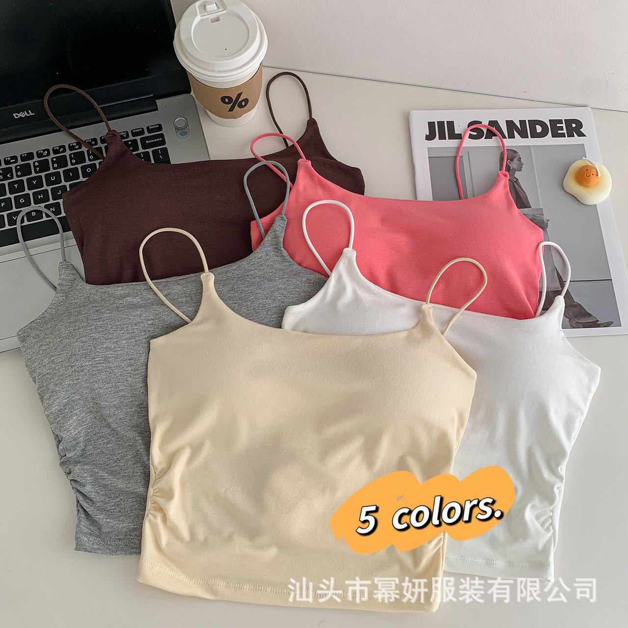 Camisola Chaleco de Cuello Redondo Dulce Puro de Tirantes Finos con Almohadilla en el Pecho Color Sólido Plisado Ajustado Ajustado Camiseta Base Top