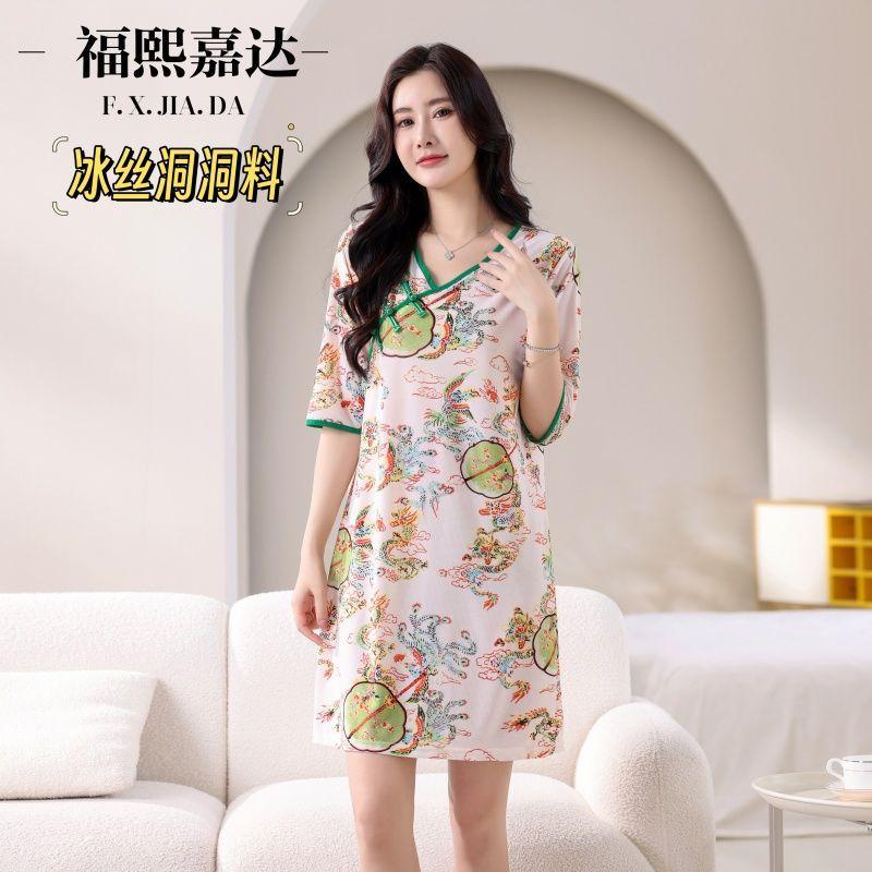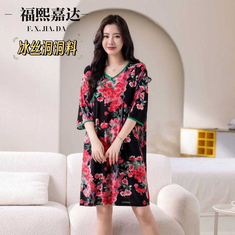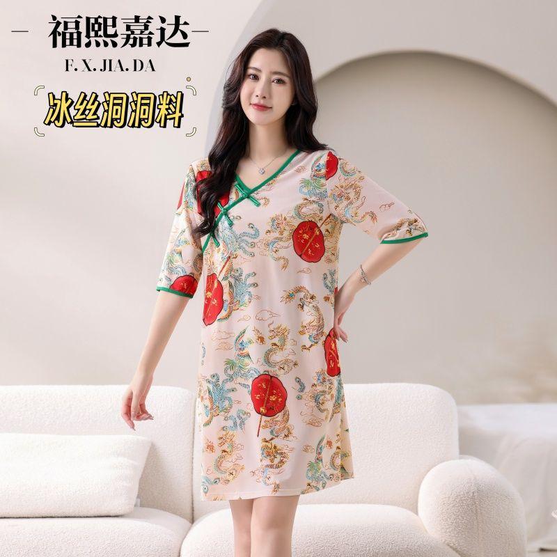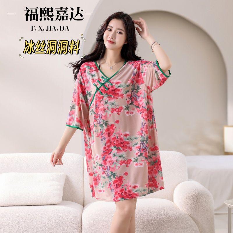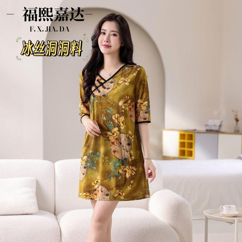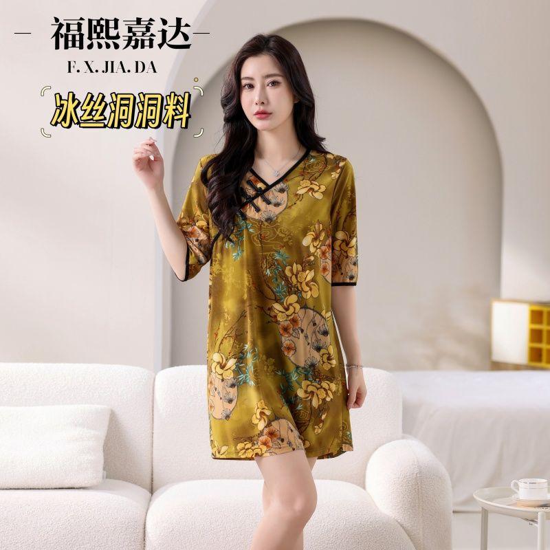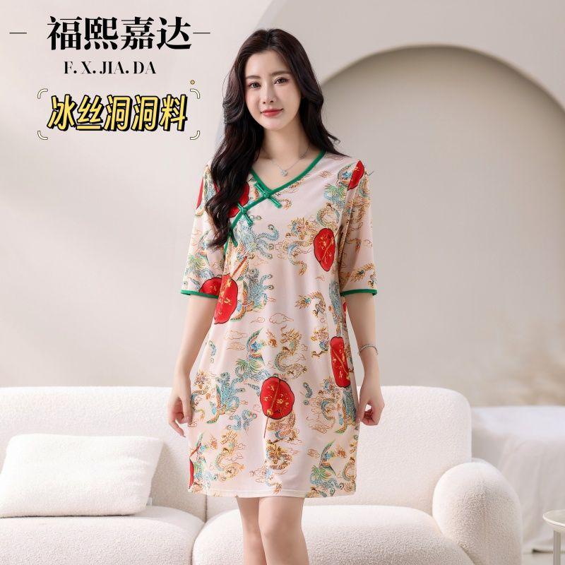 Fuxi Jiada Nuevo Camisón de Verano, Vestido con Volantes de Seda de Hielo, Holgado y Adelgazante, Cuello en V Alto, Estilo Chino
