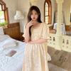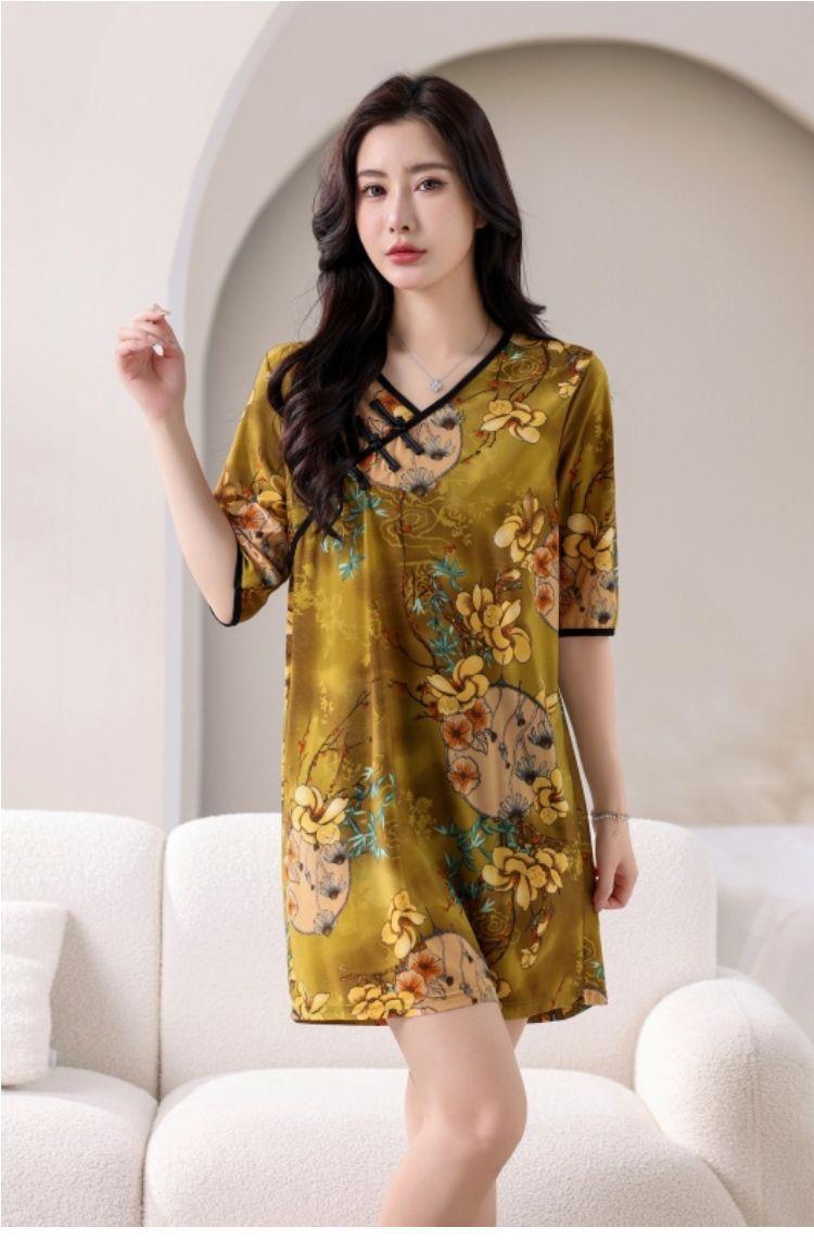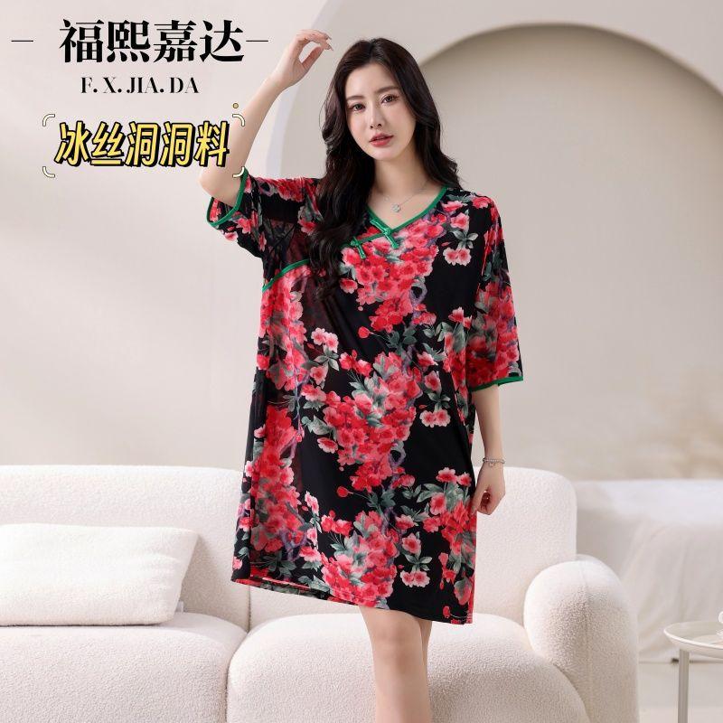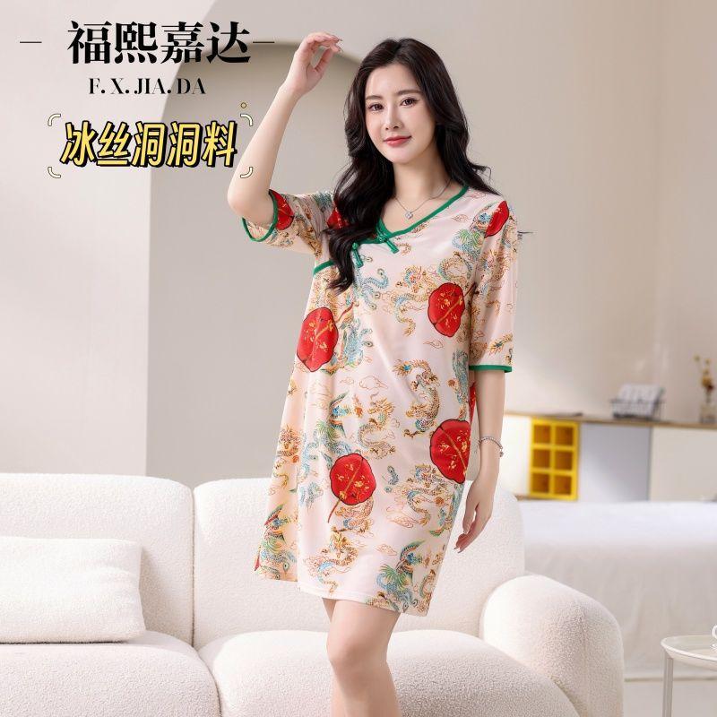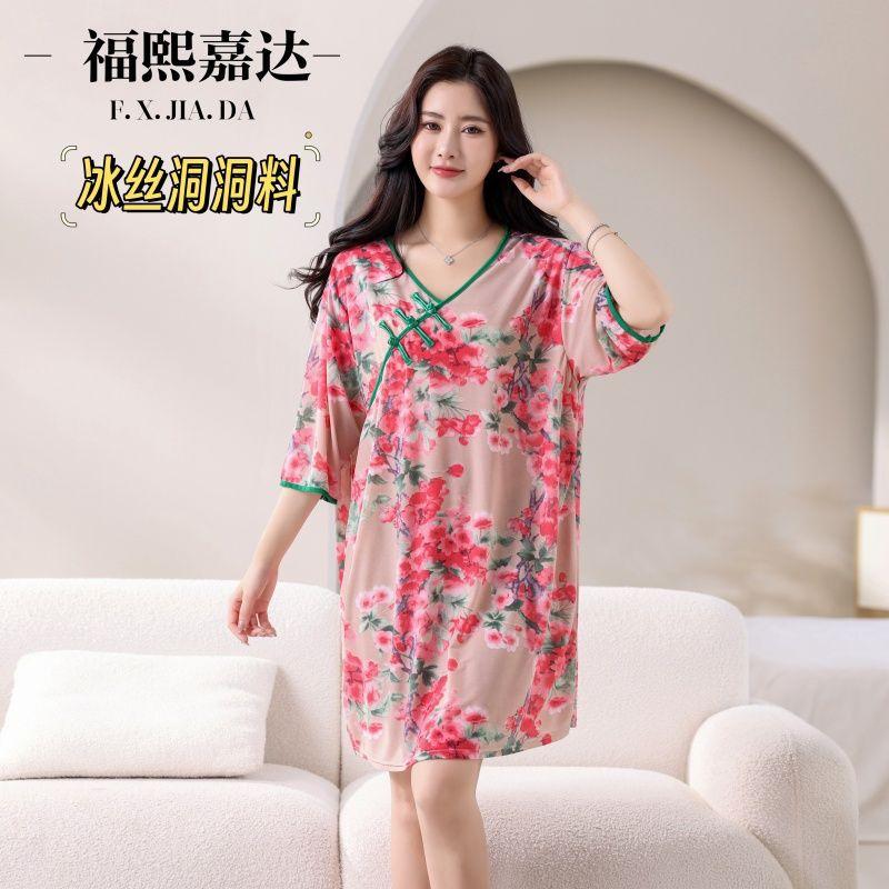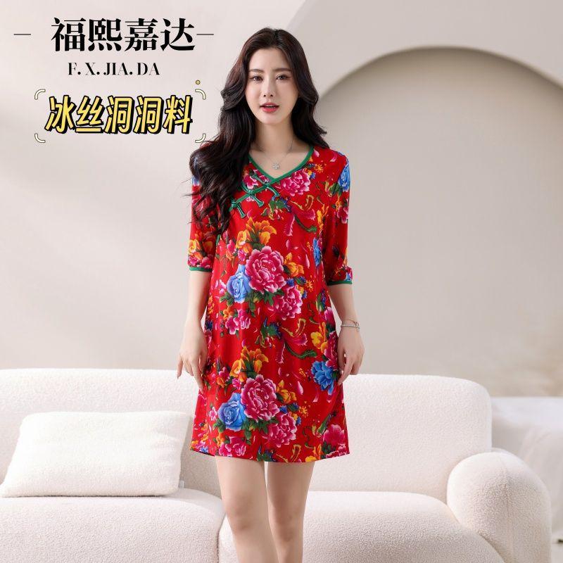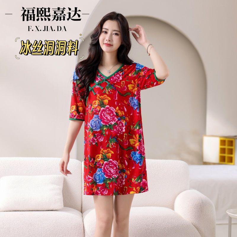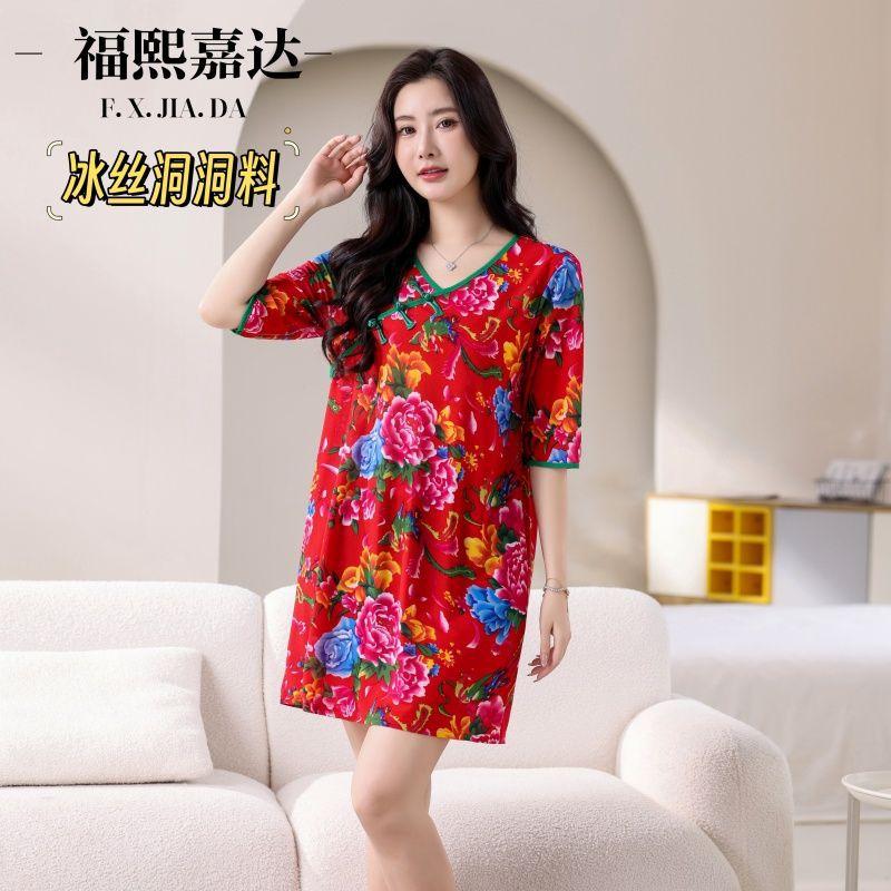 Fuxi Jiada Nuevo Camisón de Verano, Vestido con Volantes de Seda de Hielo, Holgado y Adelgazante, Cuello en V Alto, Estilo Chino