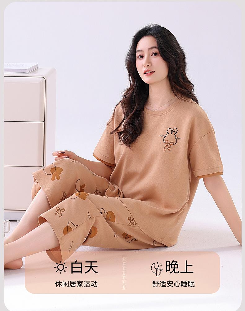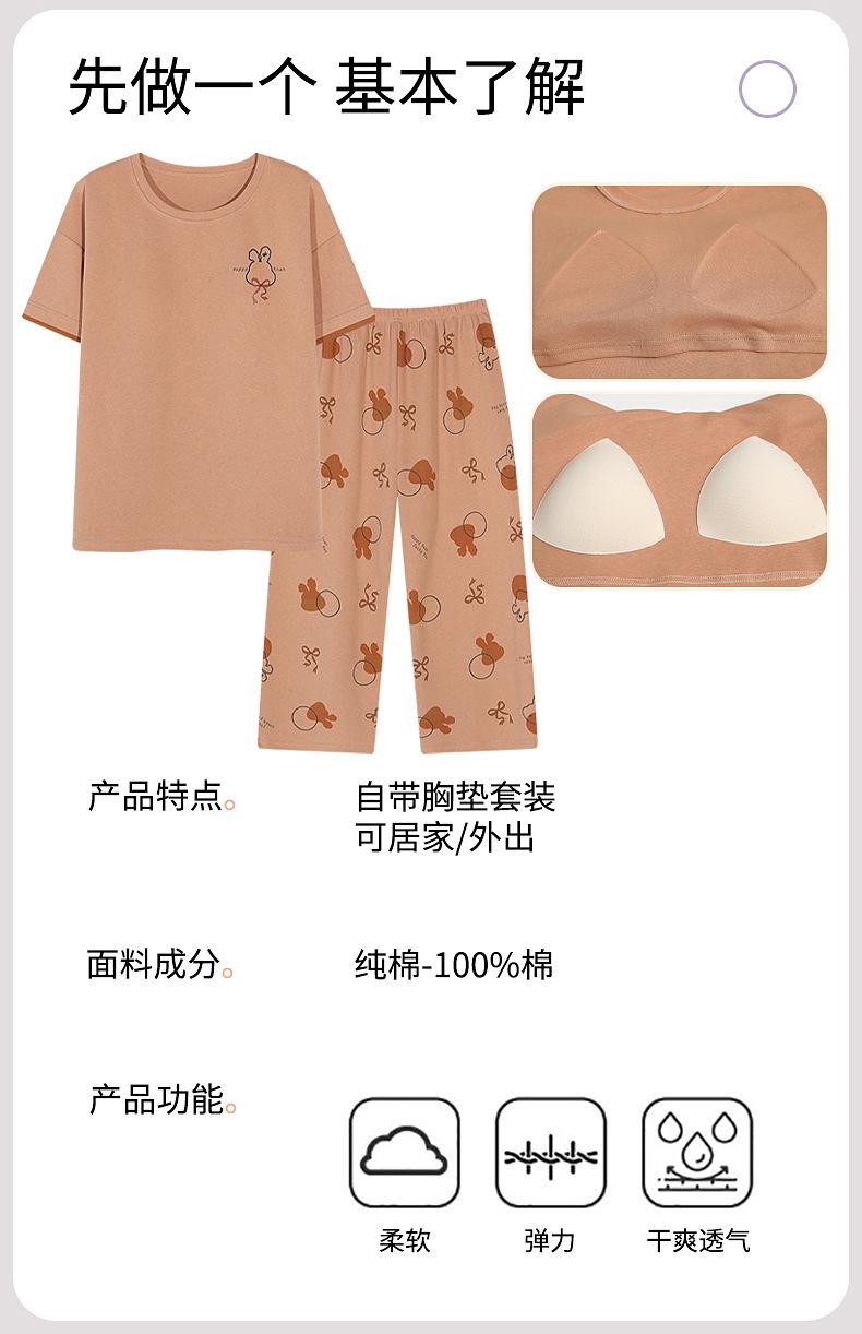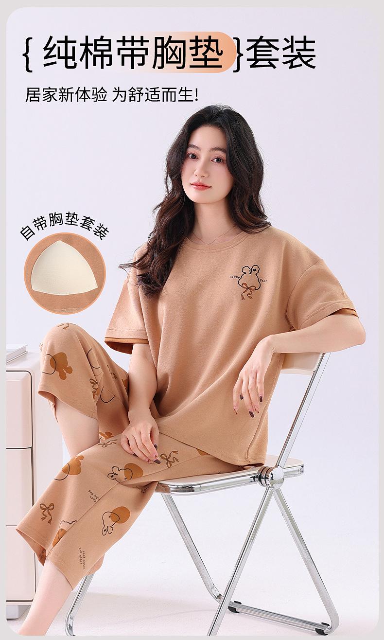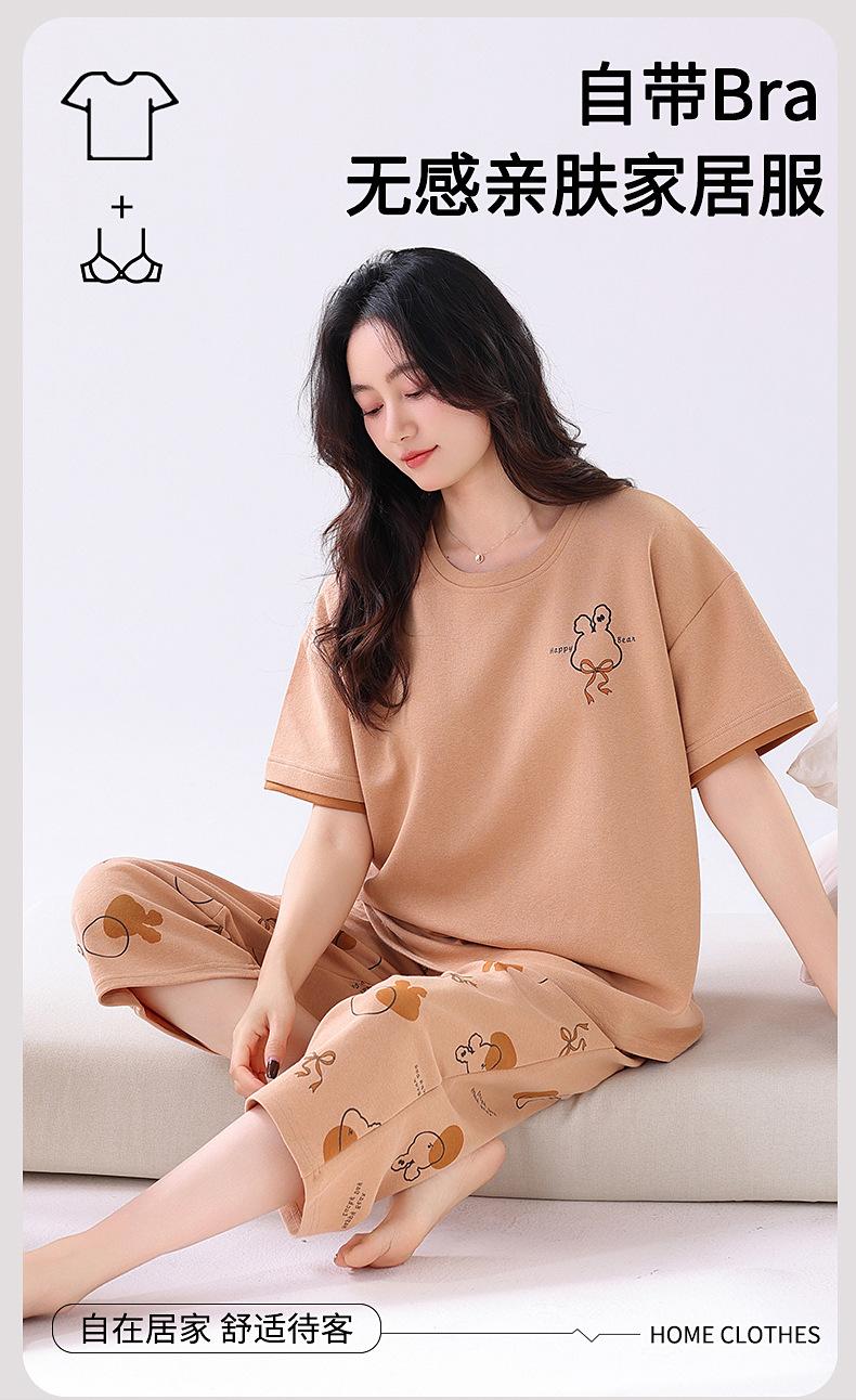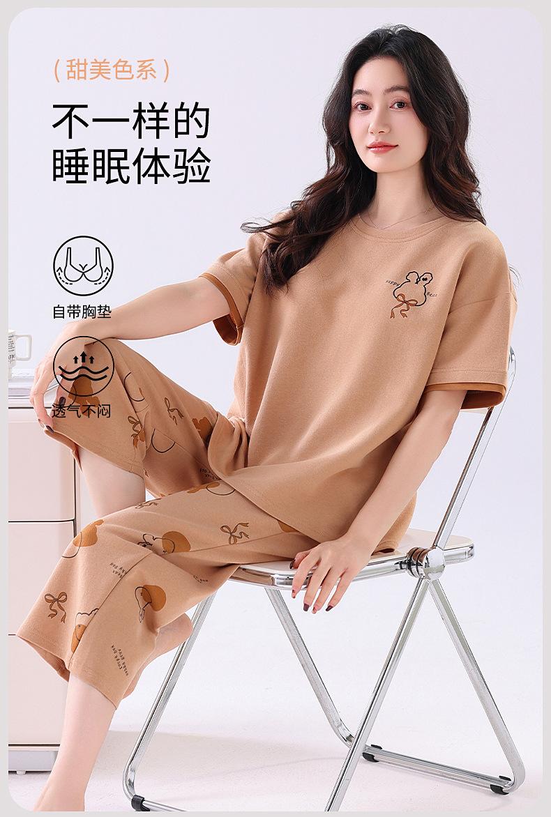 Pijama de Algodón para Mujer Dulce y Cómodo Delgado Suelto Traje Ropa de Casa de Verano Cuello Redondo Manga Corta Pantalones Recortados con Almohadilla en el Pecho