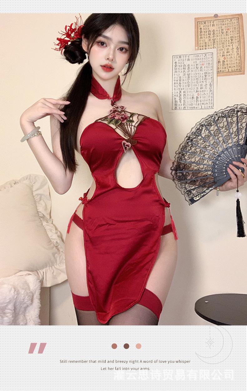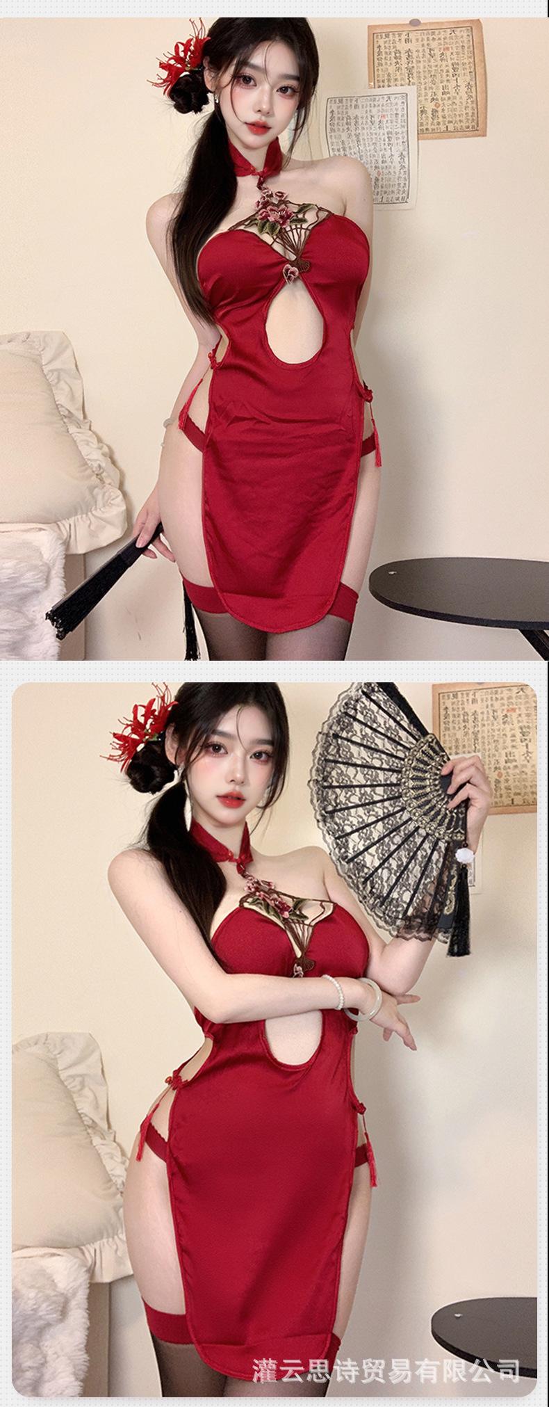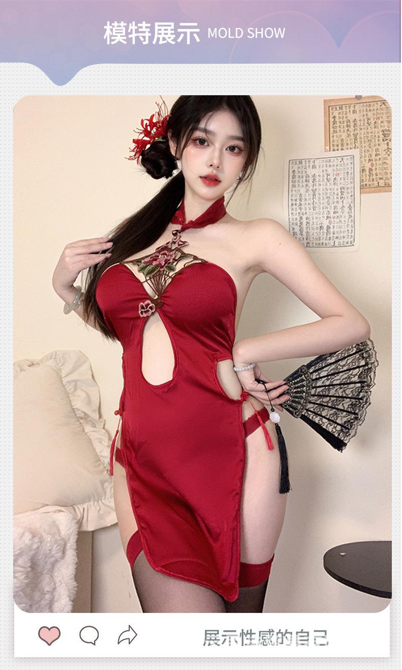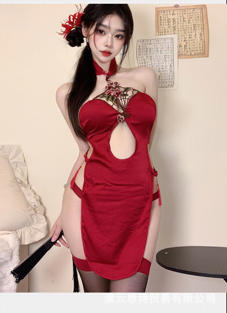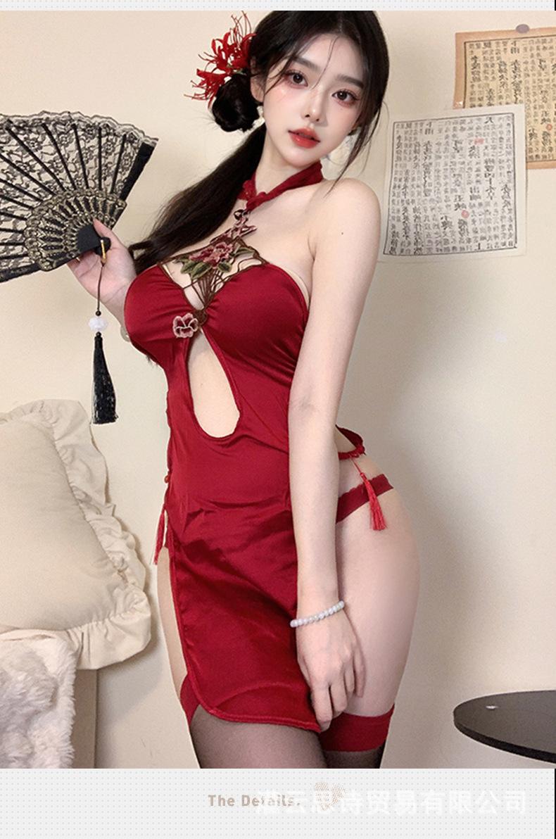 Encantadora Lencería Sexy Gotas en el Cuello Sexy Hueco Cintura Alta Abertura Cheongsam Uniforme Traje Bordado Vintage