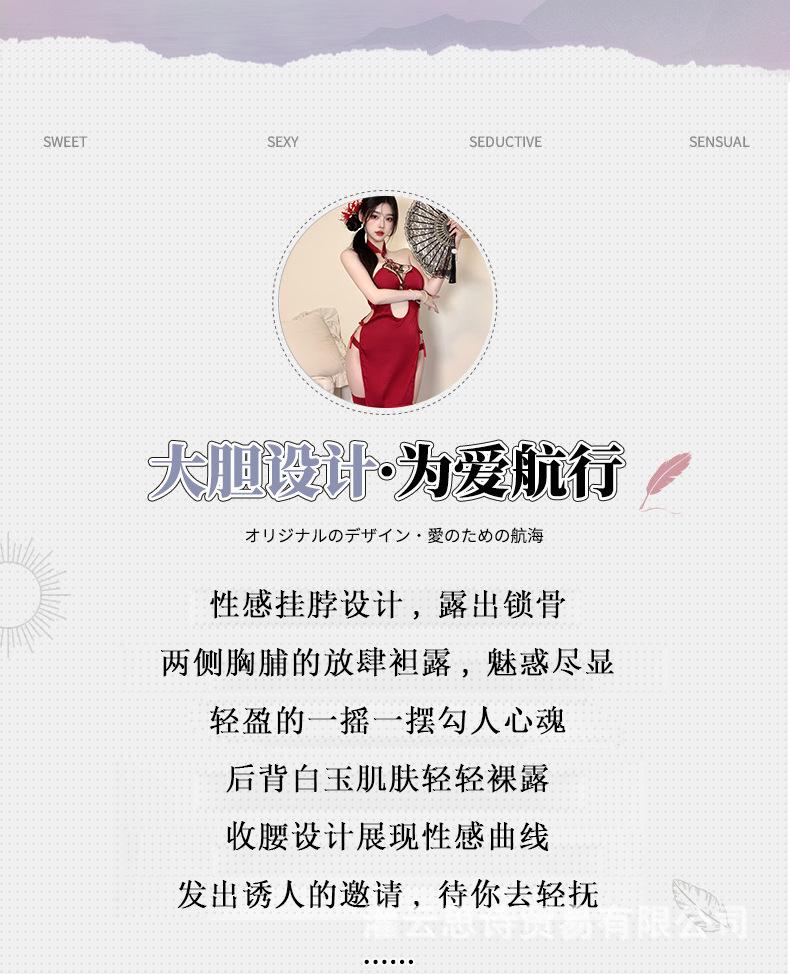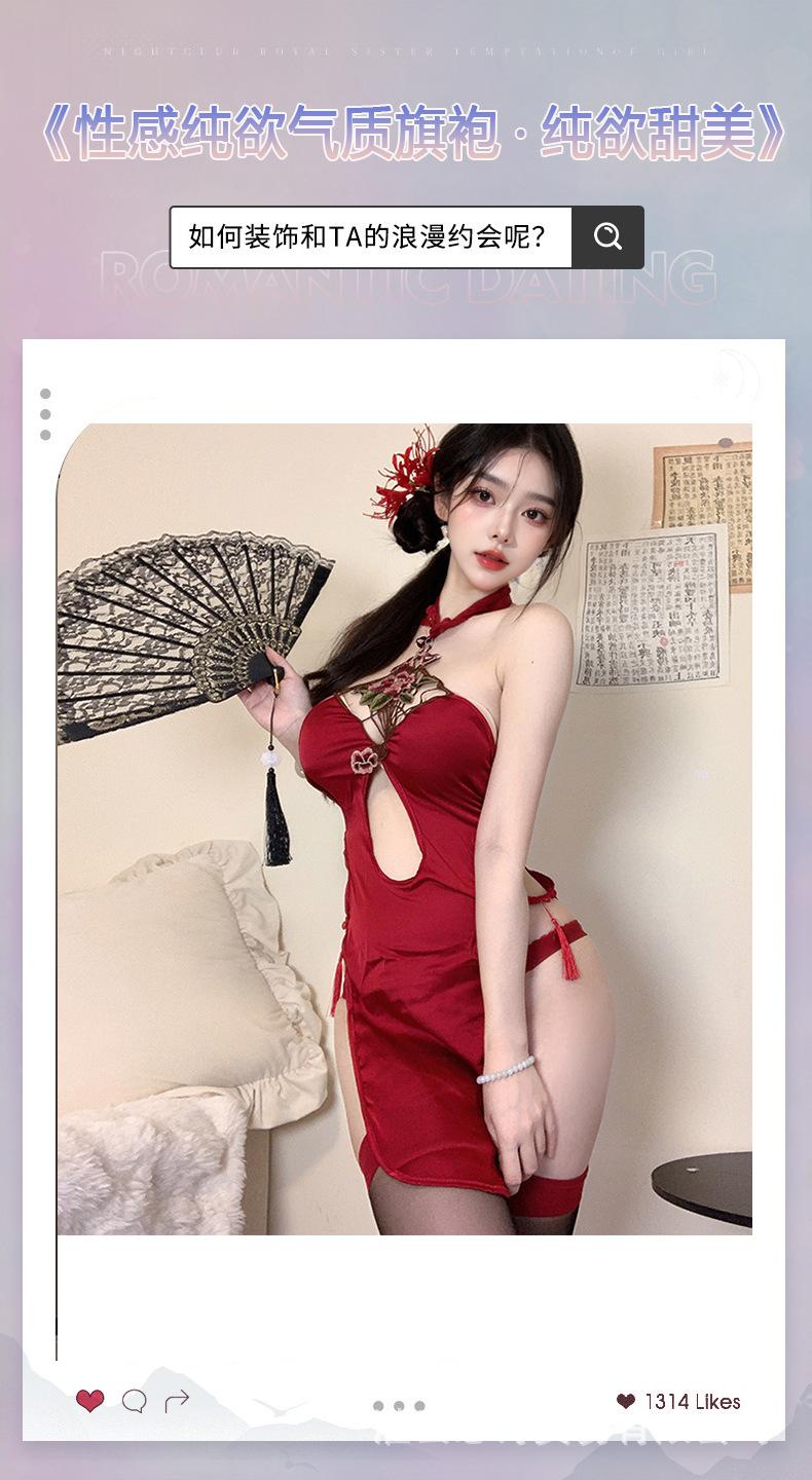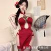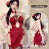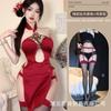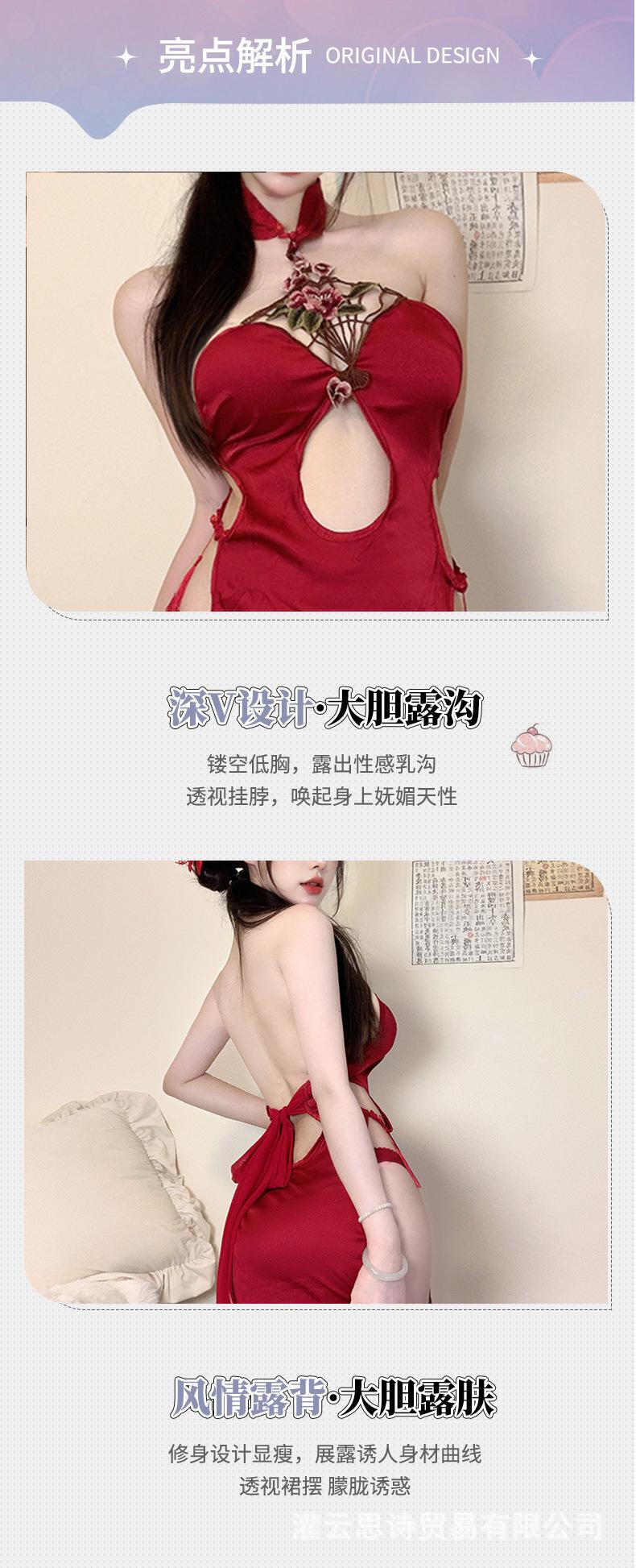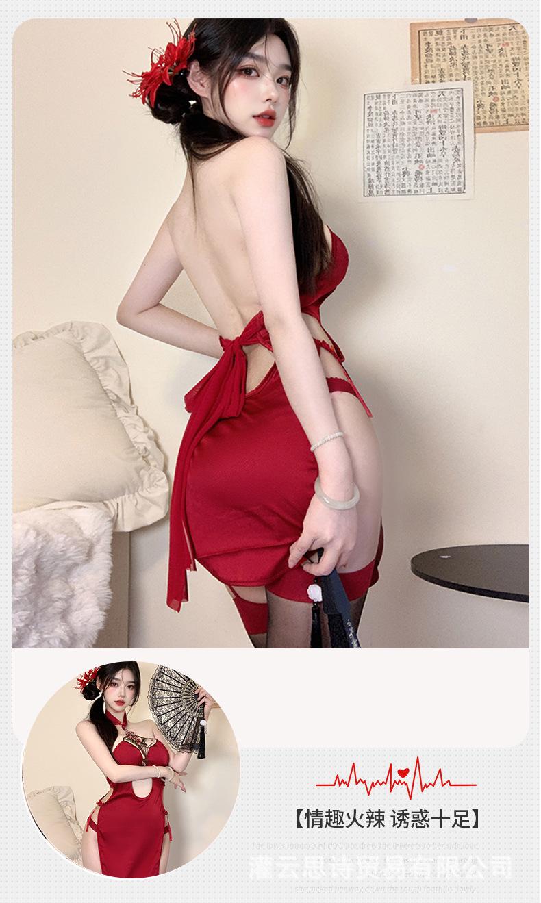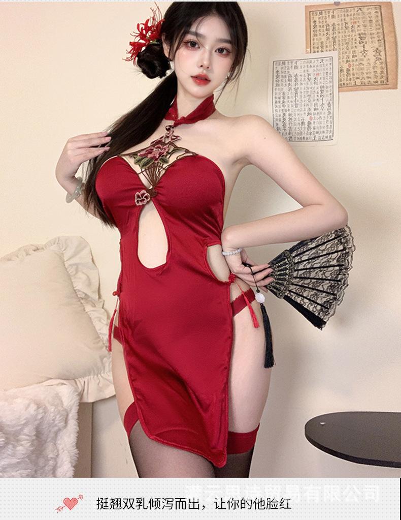 Encantadora Lencería Sexy Gotas en el Cuello Sexy Hueco Cintura Alta Abertura Cheongsam Uniforme Traje Bordado Vintage