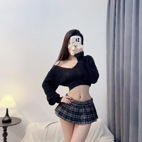 White single sweater, Gray single sweater, Black single sweater, White sweater + pink plaid skirt, Gray sweate...