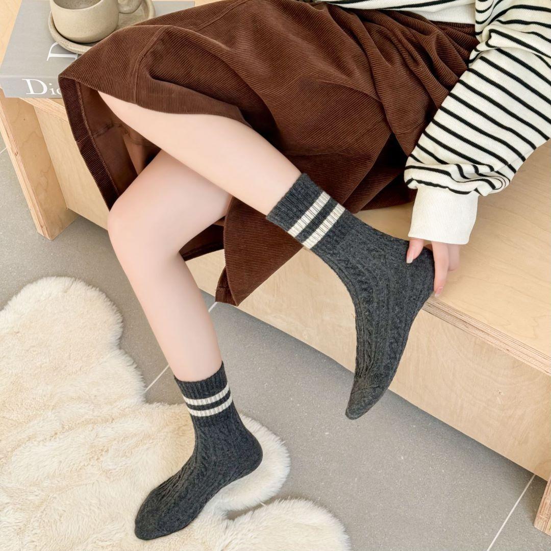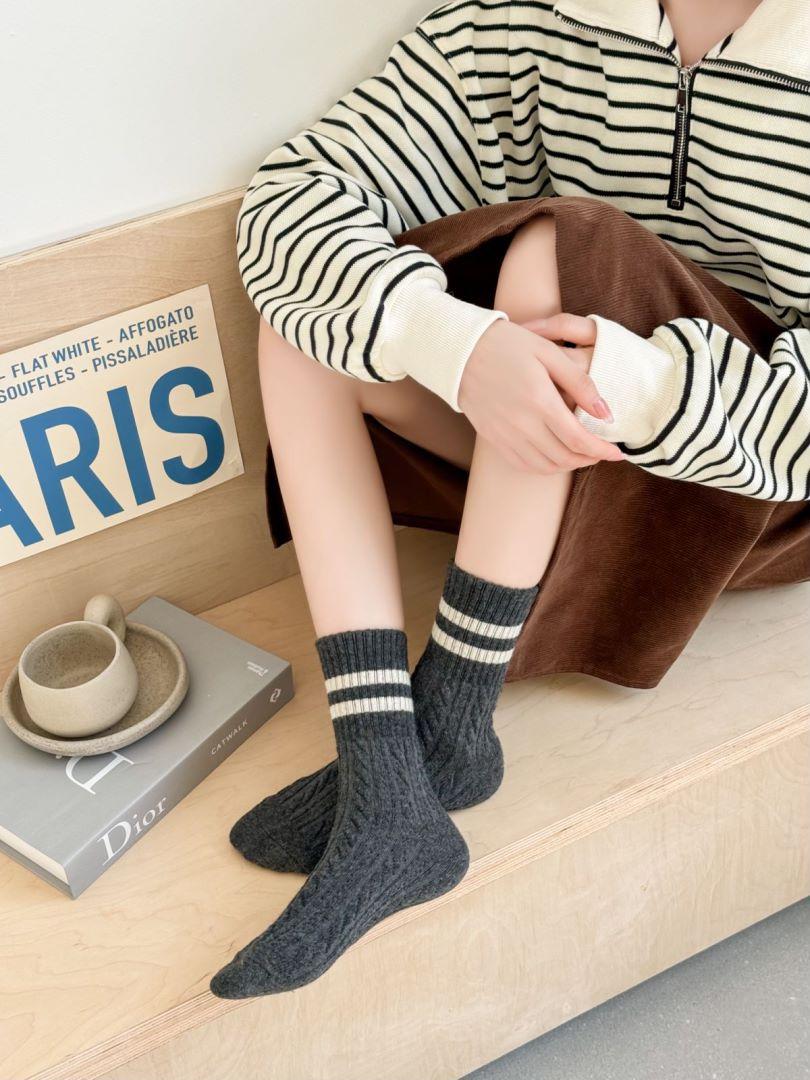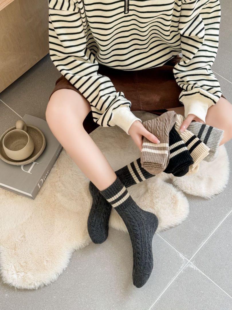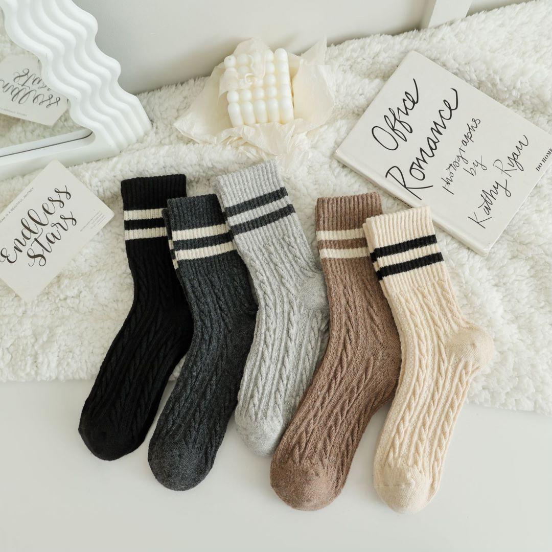 Calcetines de lana trenzada para mujer otoño e invierno gruesos cálidos japoneses a rayas barras paralelas calcetines de largo medio pantorrilla vintage cachemira calcetines de felpa