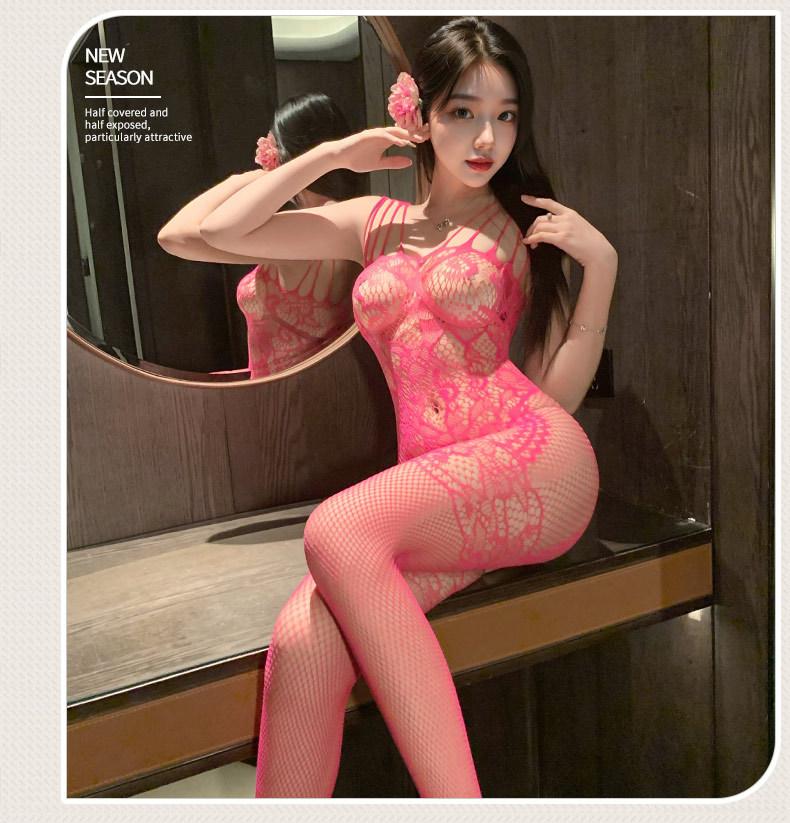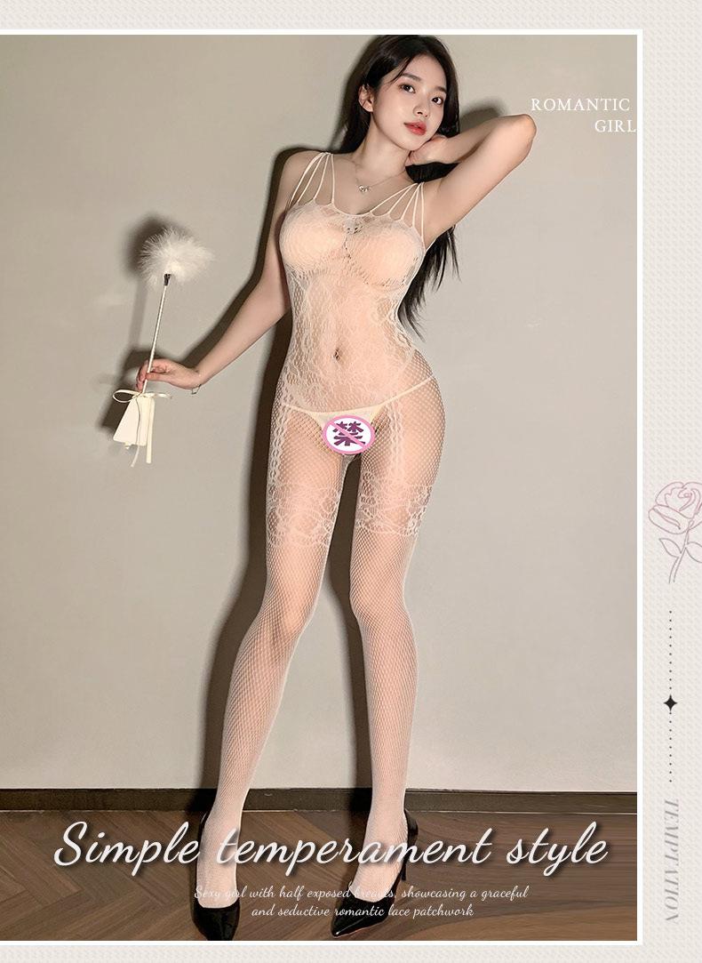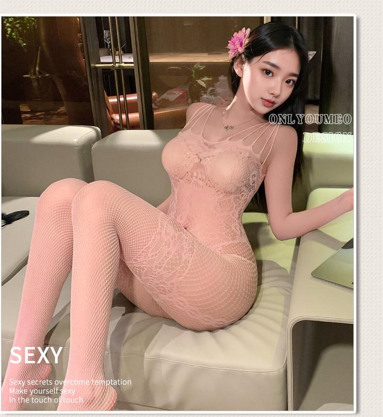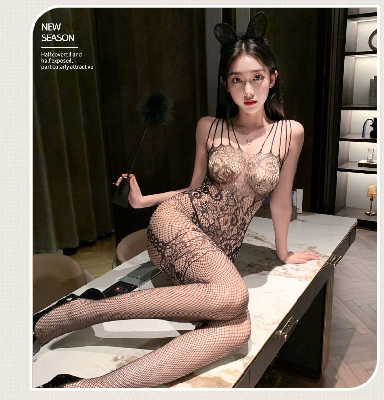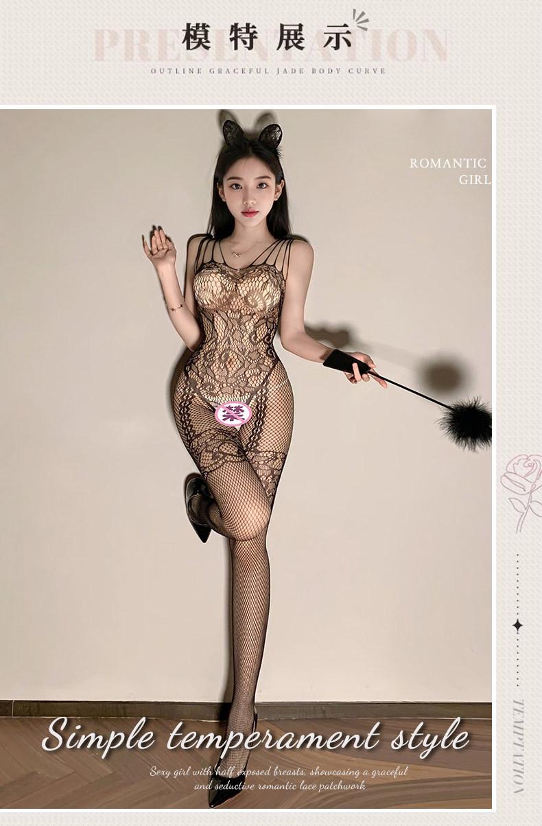 Conjunto de Lencería Sexy con Medias de Malla Transparente para Mujer, Conjunto Uniforme Hot de Una Pieza con Abertura en la Entrepierna y Calado 60