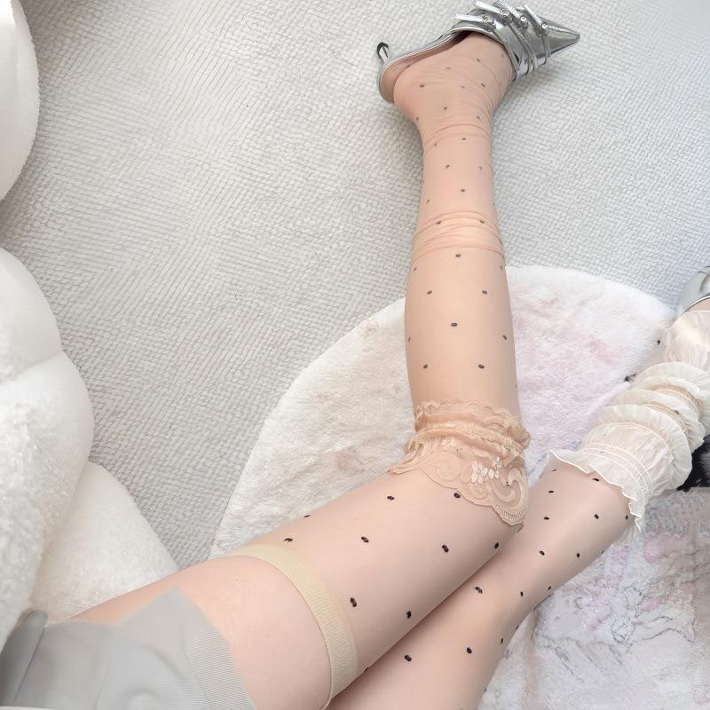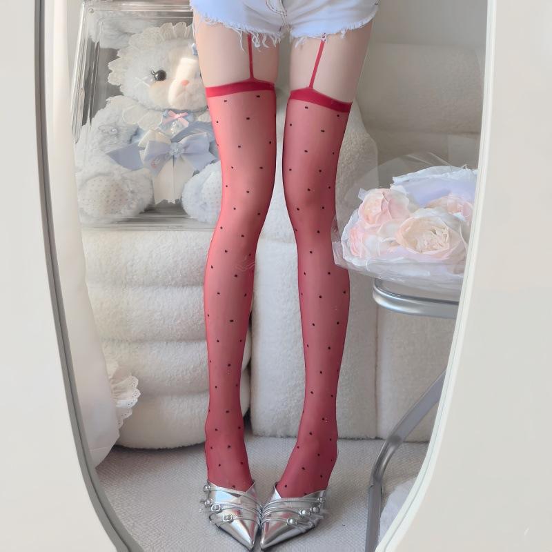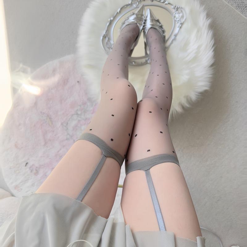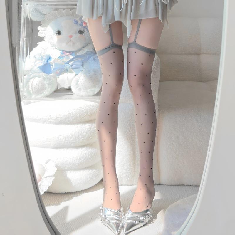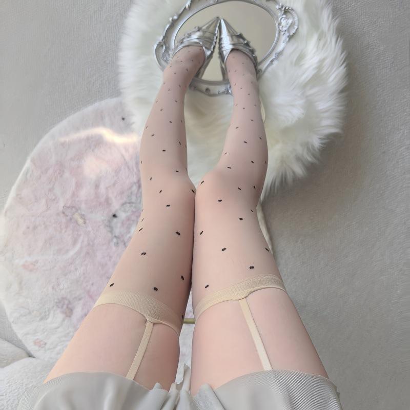 Medias de Seda Negra JK para Mujer Primavera y Verano Pierna Ligera Lunares Ondulados Hasta el Muslo Medias con Correa de Lunares Medias de Una Pieza Puro Multicolor