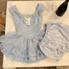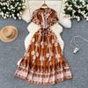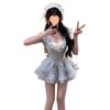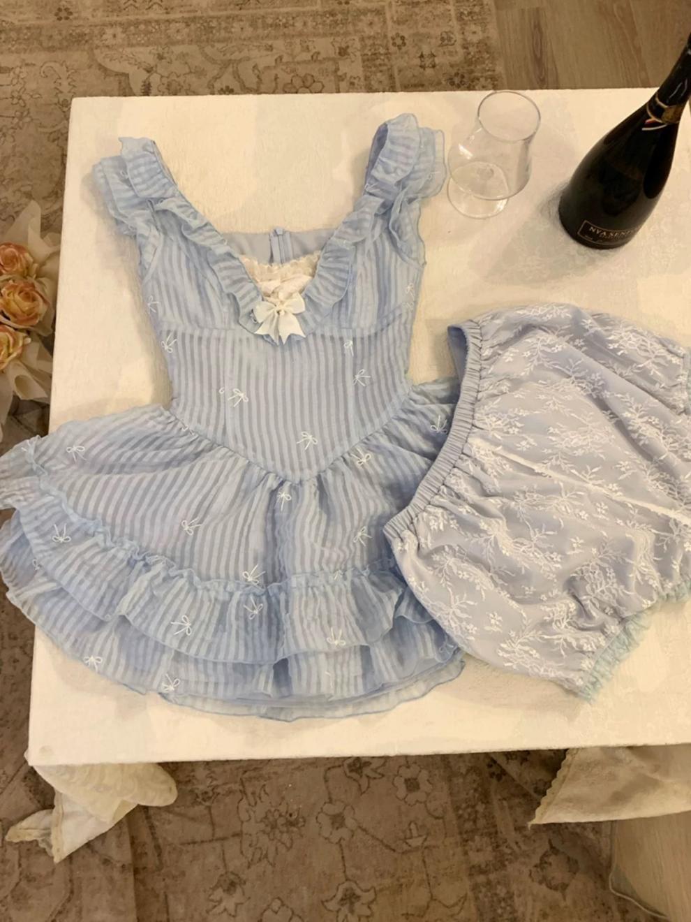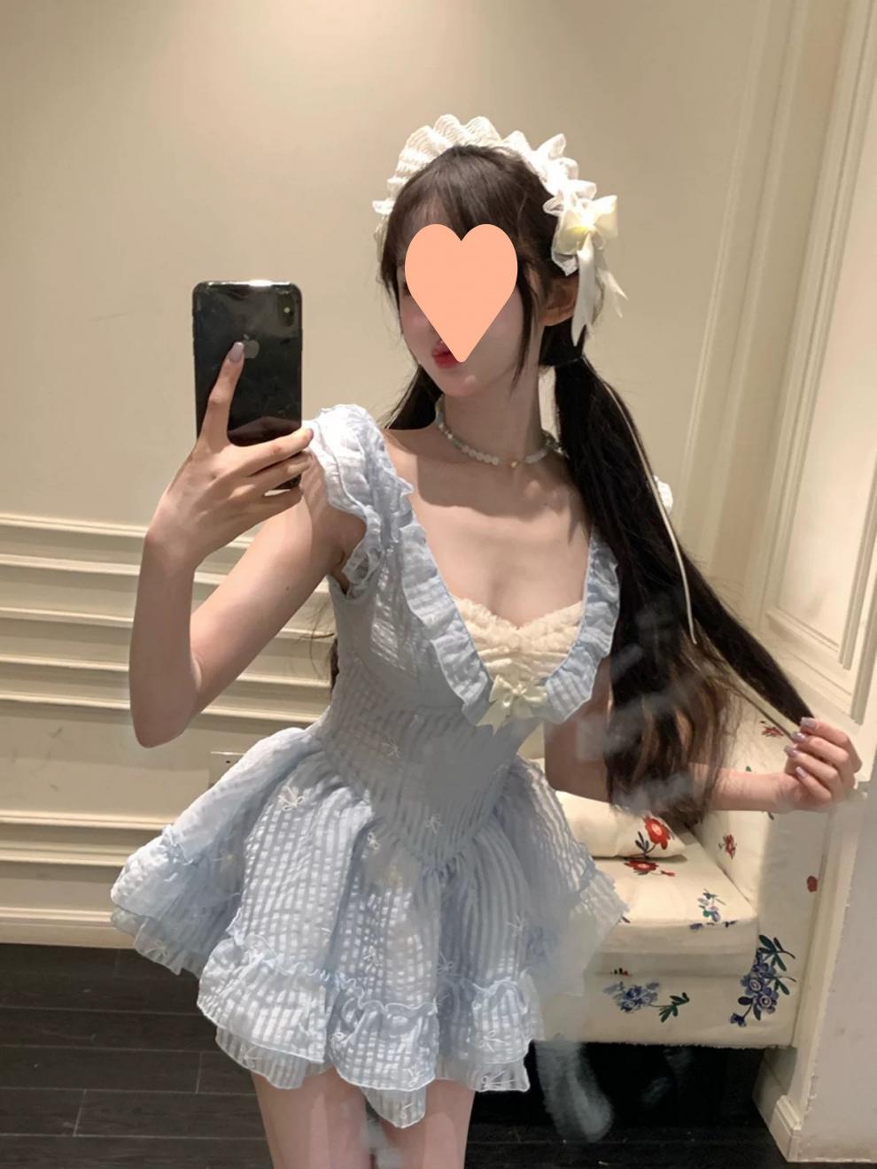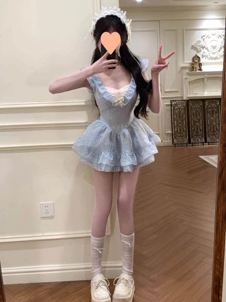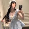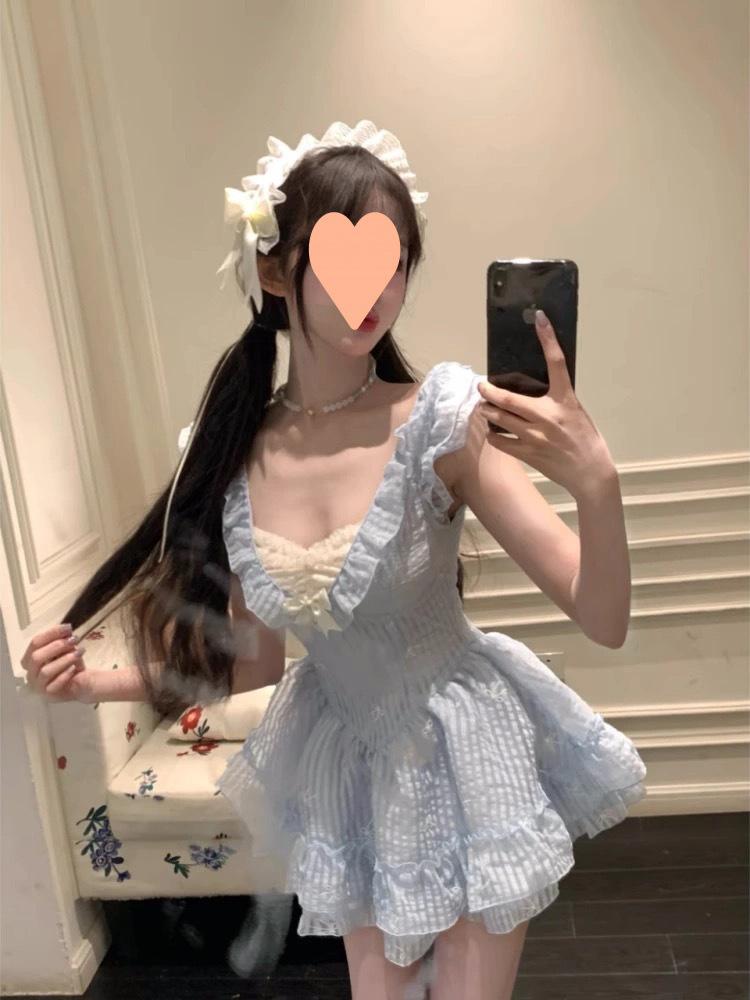 Falda Corta Dulce Estilo Lujuria Pura Primavera y Verano Diseño Adelgazante de Cintura Cuello en V Encaje Empalmado Vestido de Manga Volante para Mujer