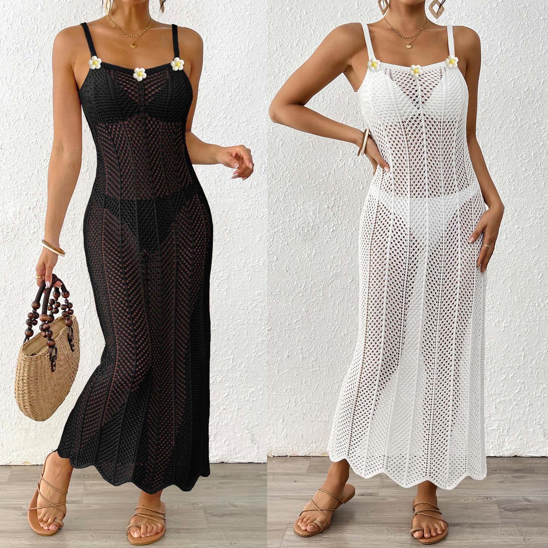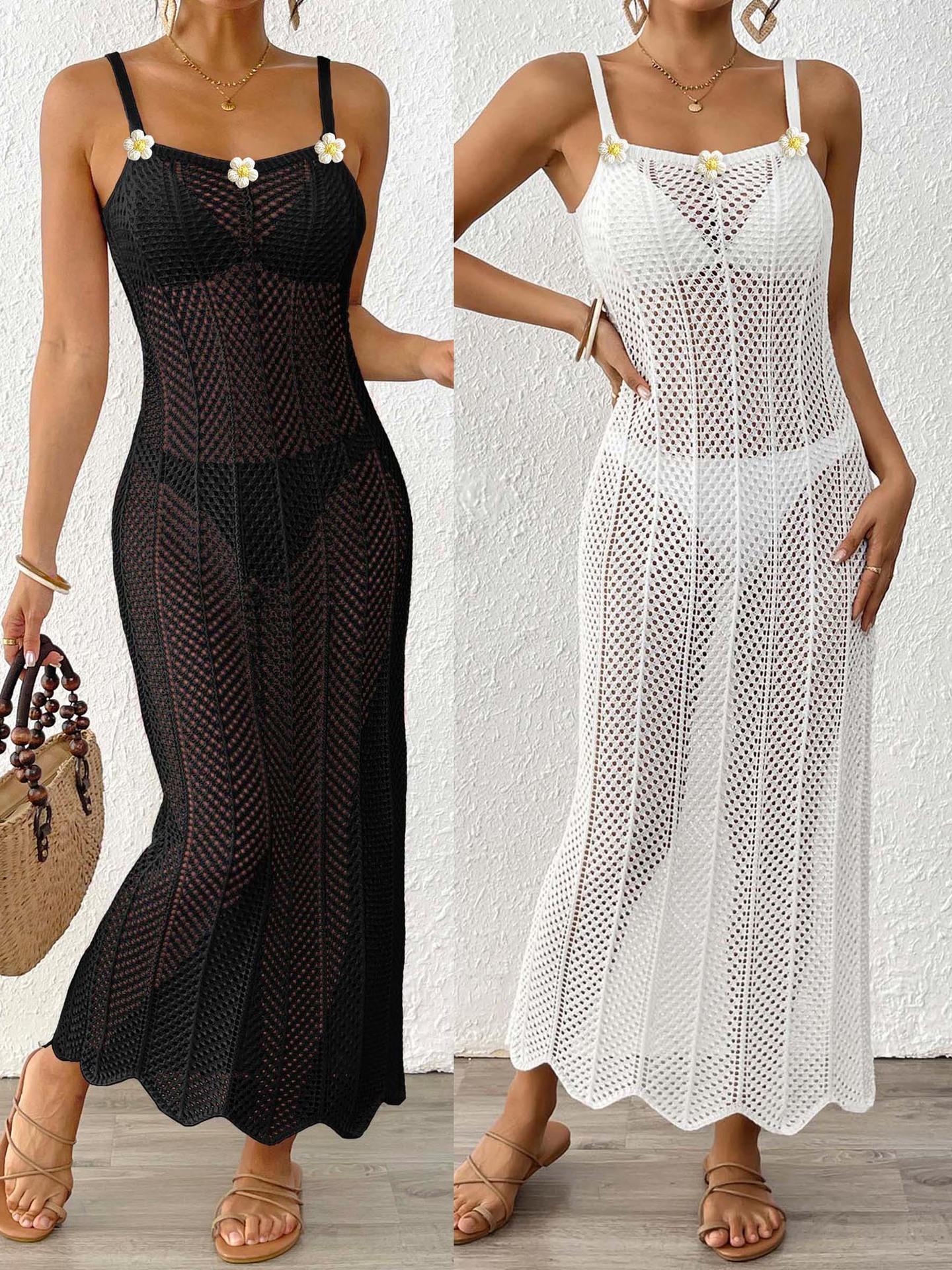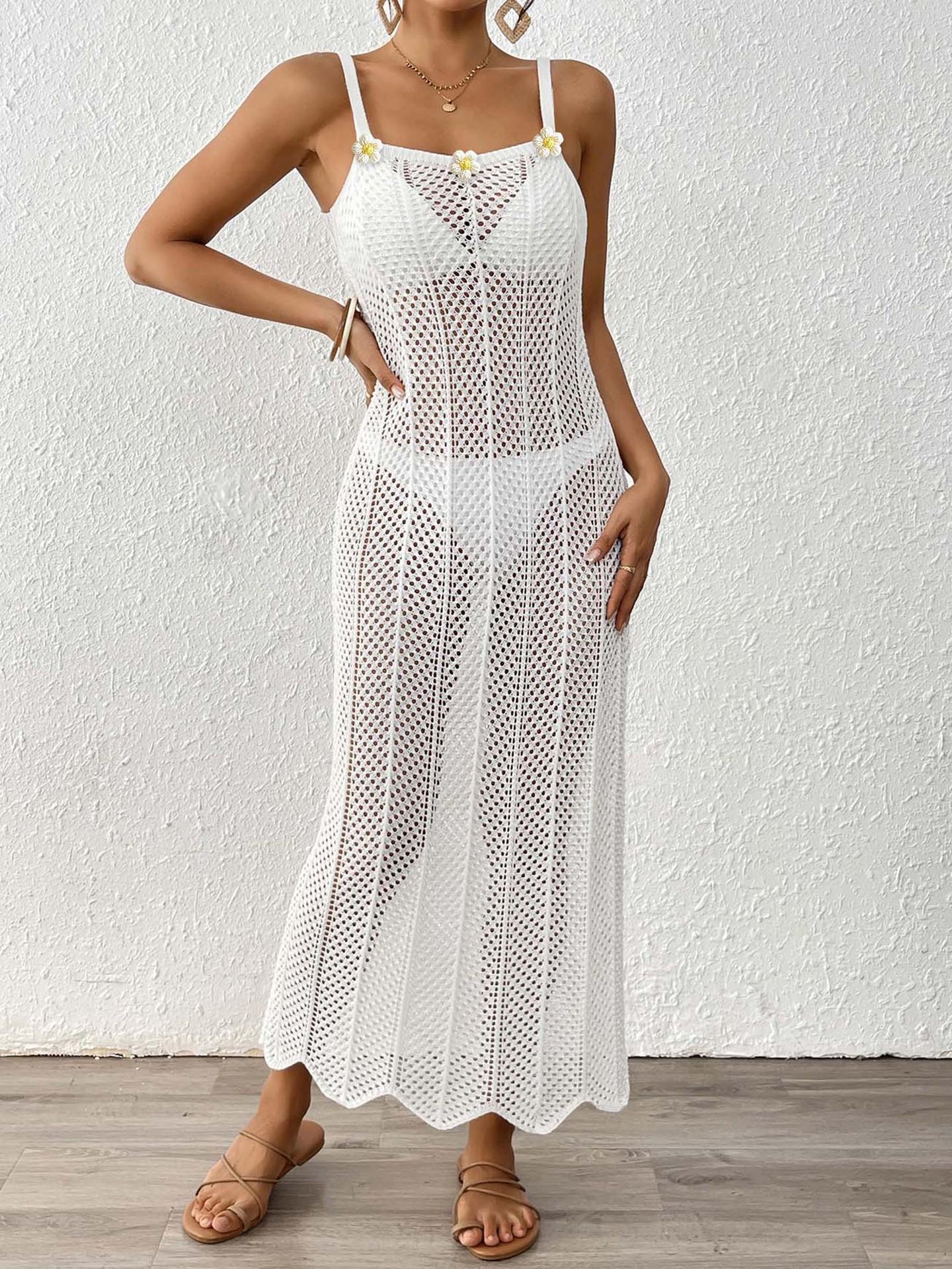 Vestido de Playa para Mujer con Puntadas de Flores Tejidas a Mano, Europeo y Americano, Tejido Calado, Sexy, Ajustado, para Vacaciones, Tipo Slip