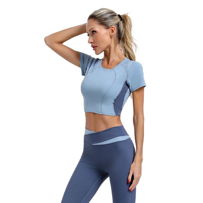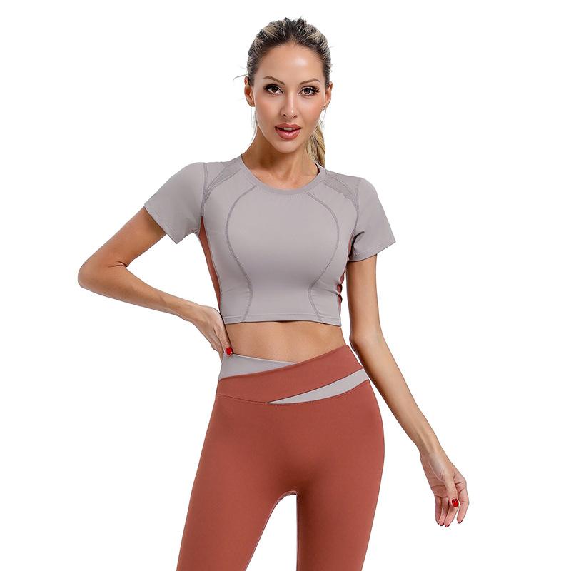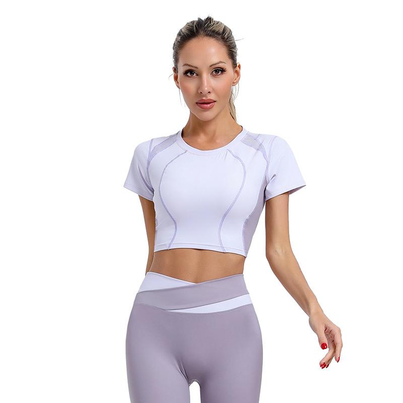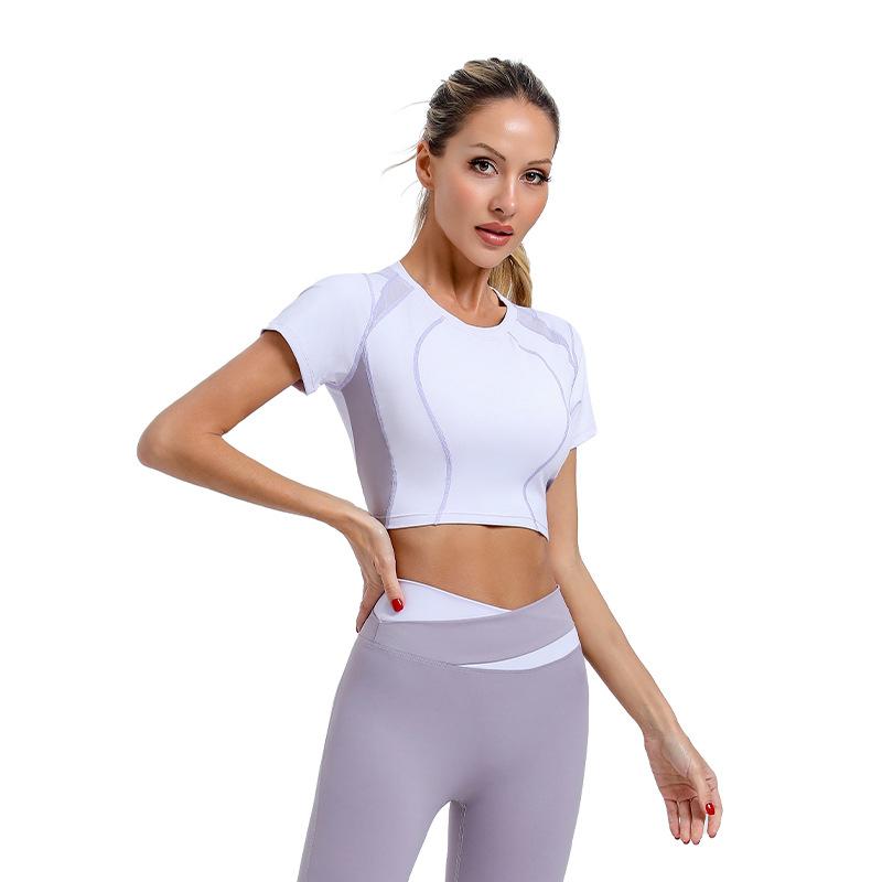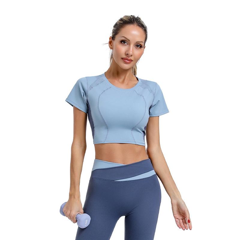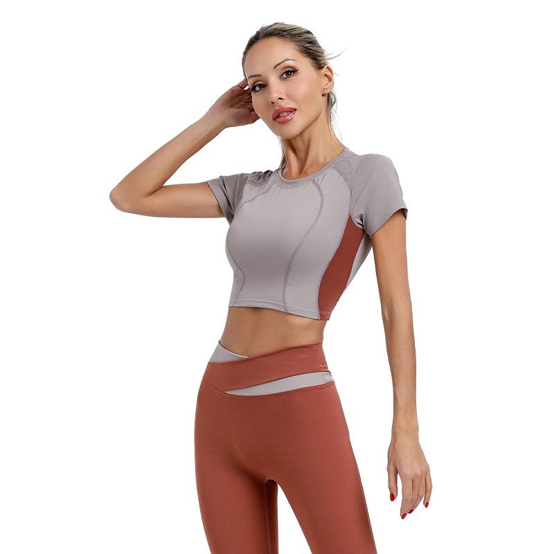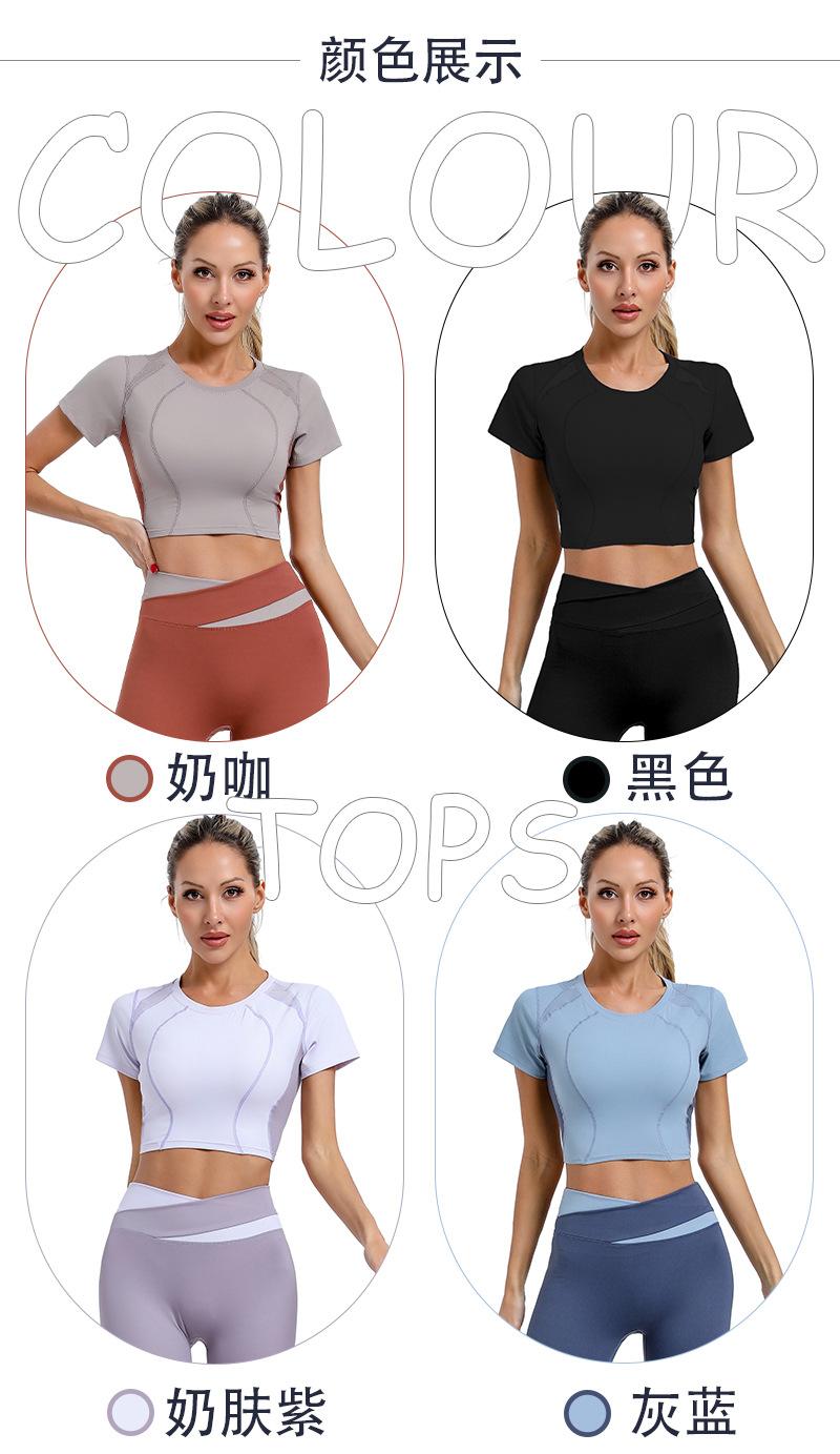 Traje de Yoga Cruzado a Color de Contraste Cintura Alta Traje Deportivo de Fitness Yoga Ajustado de Alta Elasticidad Levantamiento de Cadera Top de Manga Corta para Yoga
