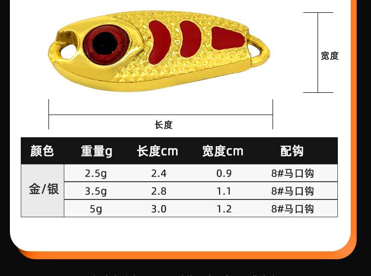 1# gold die, 2# silver die, 1# gold with horse mouth single hook, 2# silver single hook with horse's mouth