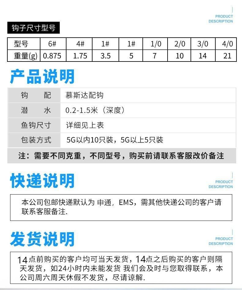 6#0.875G (50 1 pack), 4#1.75G(50 1 pack), 1#3.5G (50 1 pack), 1#5G (50 1 pack), 1/0-7g (50 1 pack), 2/0-10g (5...