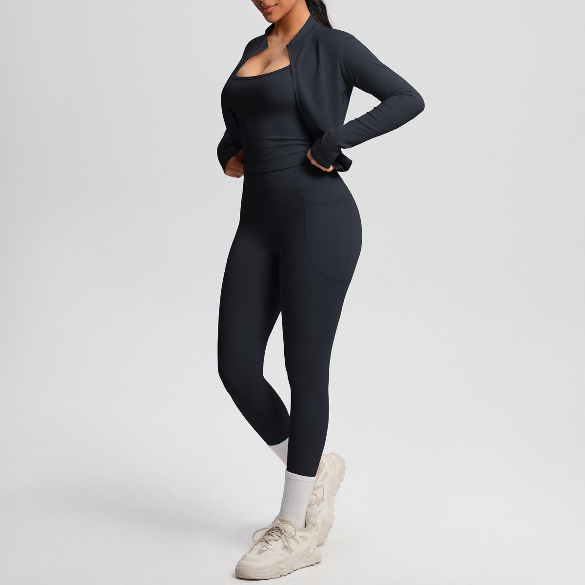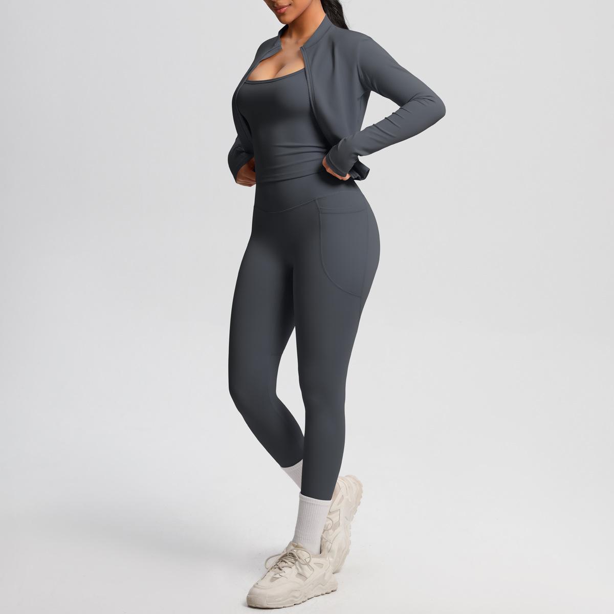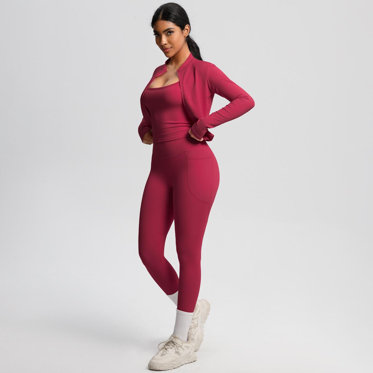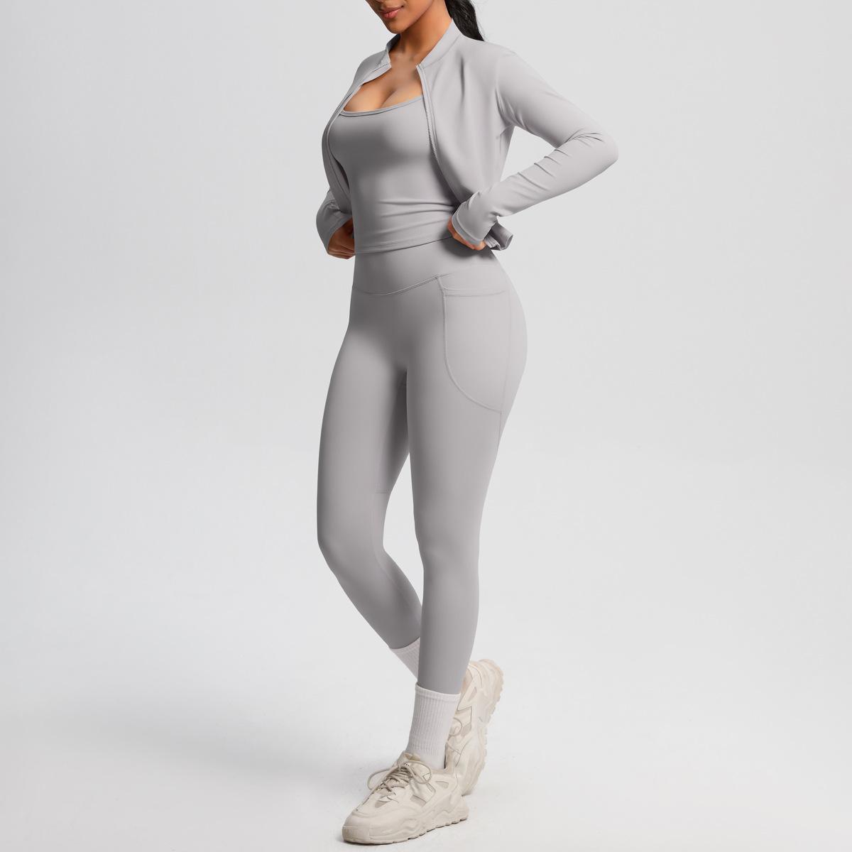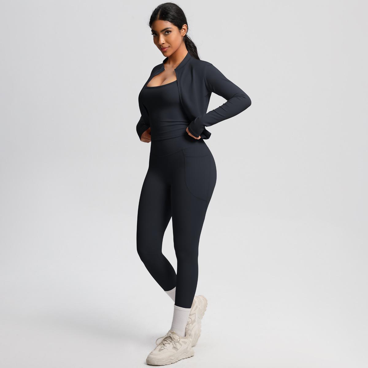Traje de Yoga Ajustado Casual para Exterior Europeo y Americano con Bolsillo Secado Rápido Cintura Alta Adelgazante Fitness Sensación Nube Set Deportivo de Tres Piezas